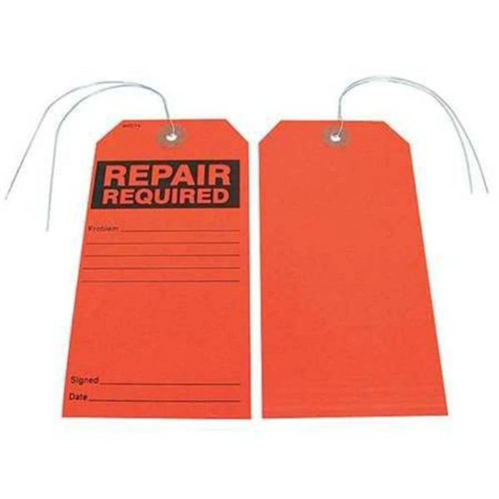 Repair Required Tag, Material Paper, Legend Problem___Signed___Date___, Height 5-3/4 In., Width 2-7/8 In., Hole Size 3/16 In., Header Repair Required, Legend Color Black, Background Color Red, Language English, Shape Rectangle, Write on Surface Yes, Tag Color Red Pack of 25qty