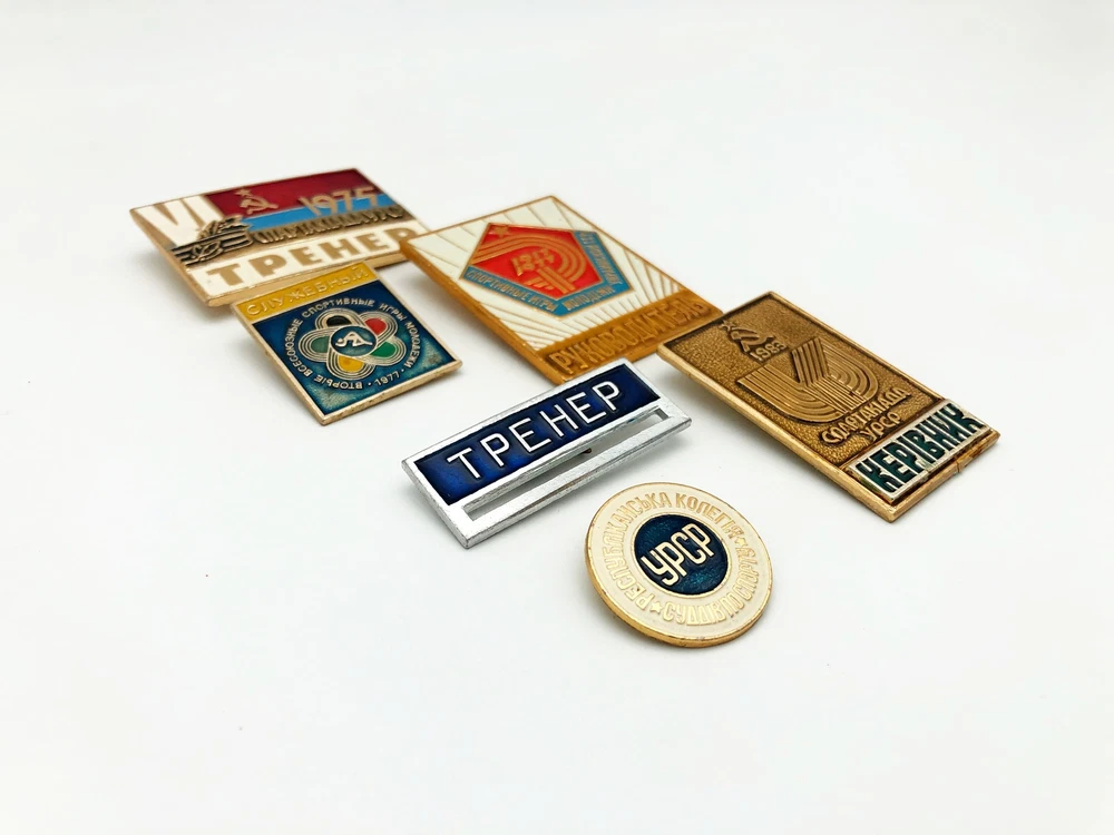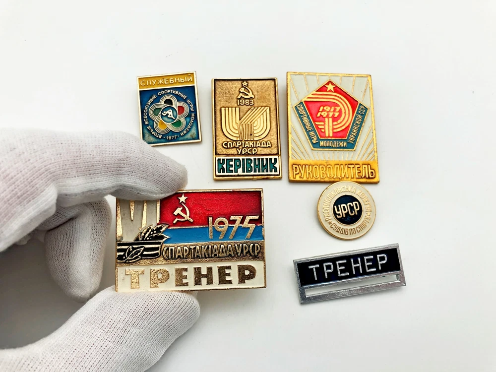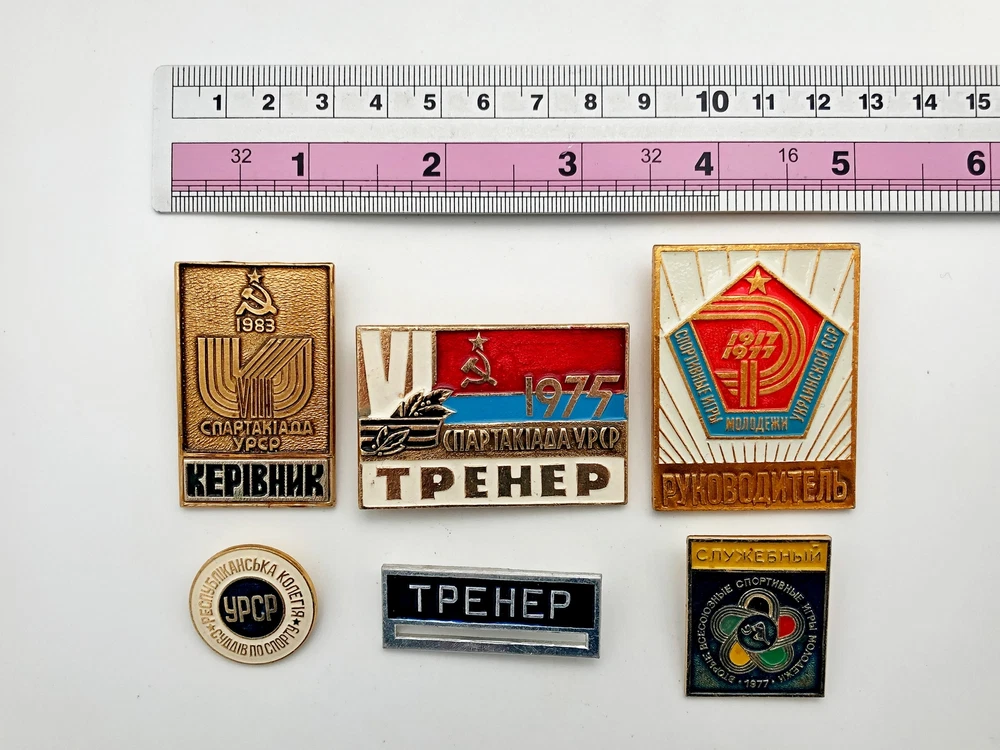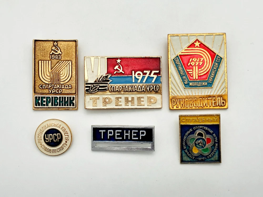 Badges Pin Coach Supervisor Sport of Ukrainian SSR Vintage Set 6 pcs Collectible 70-80s Set of 6 badges: Spartakiad Ukrainian SSR Manager 1983 Spartakiad Ukrainian SSR Coach 1975 Sport Games Youth Ukrainian SSR Supervisor 1917 - 1977 Republican College of Sports Judges Ukrainian SSR Coach Official. Second All-Union Youth Sports Games 1977 Contact me if any questions. I do offer combine shipping discount if you buy 2 items or more. I make shipments the next business day after the purchase. Buyer protection is in effect. Please watch the photos carefully as they are important part of description. Thanks for your interest. Have a look at some other lots at our store. 💛💙