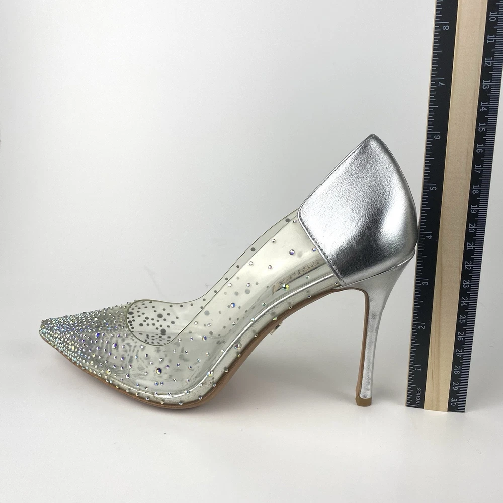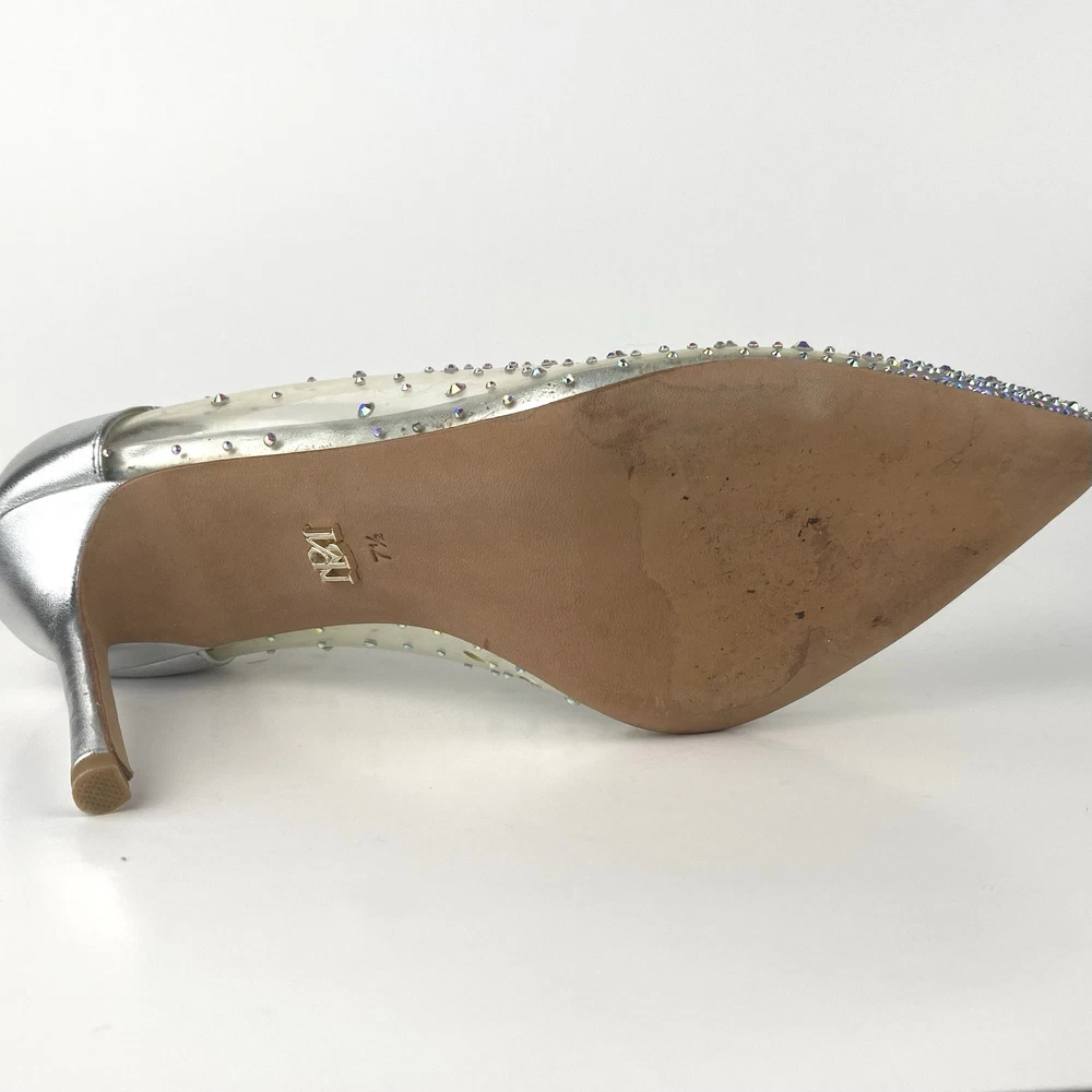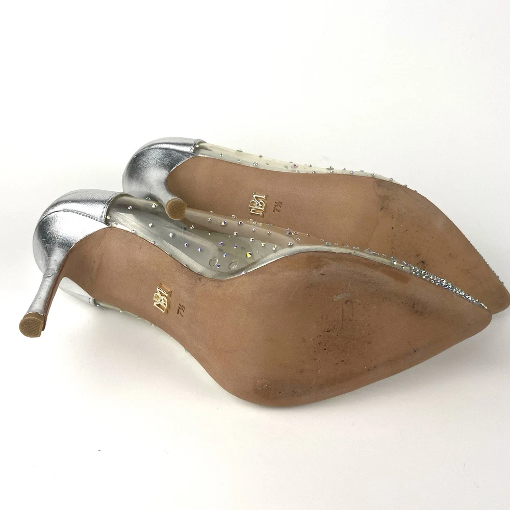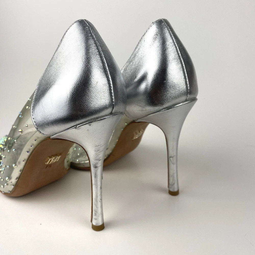 Hollywood glamour.!! Women's size 7 1/2 heels designed by Badgley Mischka, an American fashion label founded in 1988 by Mark Badgley and James Mischka. The brand is known for designs influenced by 1940s Hollywood glamour, with simple and streamlined aesthetics. These heels showcase a pointed-toe silhouette, transparent vamps, and embellishments of rhinestones, evoking a glamorous and elegant style suitable for evening wear or special occasions. Preowned so wear on both back heels and bottoms as shown in pictures.