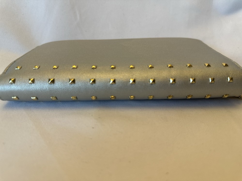 This elegant Badgley Mischka silver zipper wallet features a zip-around style with gold stud accents, perfect for holding credit cards. The wallet measures 8 inches in length and 5 inches in width, making it a stylish and functional accessory for everyday use. Brand-new with tags, this wallet is a luxurious addition to any wardrobe. $59 retail