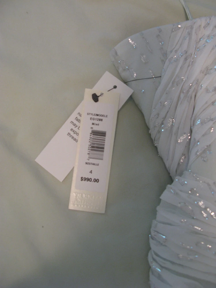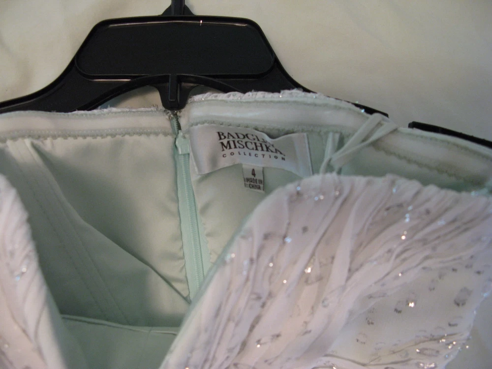 Welcome to my Auction! Up for bidding is a gorgeous silk gown from designer Badgley Mischka. This elegant and ethereal design is perfect for any dressy occasion! Features a beautiful pleated and wrapped bodice design, sheer white silk shell that is suffused with silver threads for a magical shimmering look, soft mint color poly lining (layered twice in the skirt to give fullness and movement), light boning in the bodice for flattering shape and back zipped closure with hook & eye. Brand new with tags - and retail of $990.00 - this is the dress you've been dreaming of for your wedding, prom or special events! Size is marked '4' - but could also work for a larger size 2, or small size 6 Please check measurements as follows: 53 inches long from center of neckline to hem (comes to a slight train of 57 inch length in back), 30 inches in bust (best fits bust 32-34 inches), 40 inches in hips, 30 inches in waist. Please ask all questions before bidding - serious buyers only. I will report non-paid items to ebay. Please be considerate and make sure you can complete your sale. Returns are accepted only in cases of items not being as described or wrong item sent. I cannot accept returns of used cosmetics. I am an individual seller - not a department store. Processing returns is time-consuming and costly. Ebay takes a percentage of every sale, so I cannot refund shipping costs. Be sure you like the color, check the size, ask questions etc. to ensure you will be pleased with your purchase. Thank you for visiting and good luck!