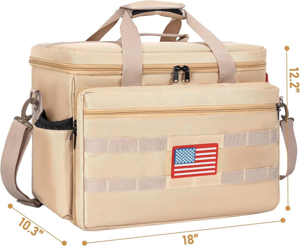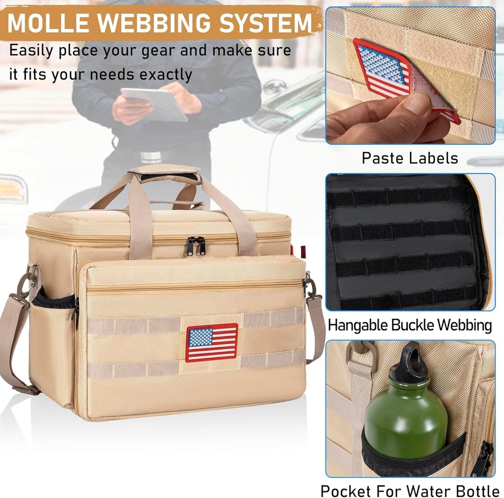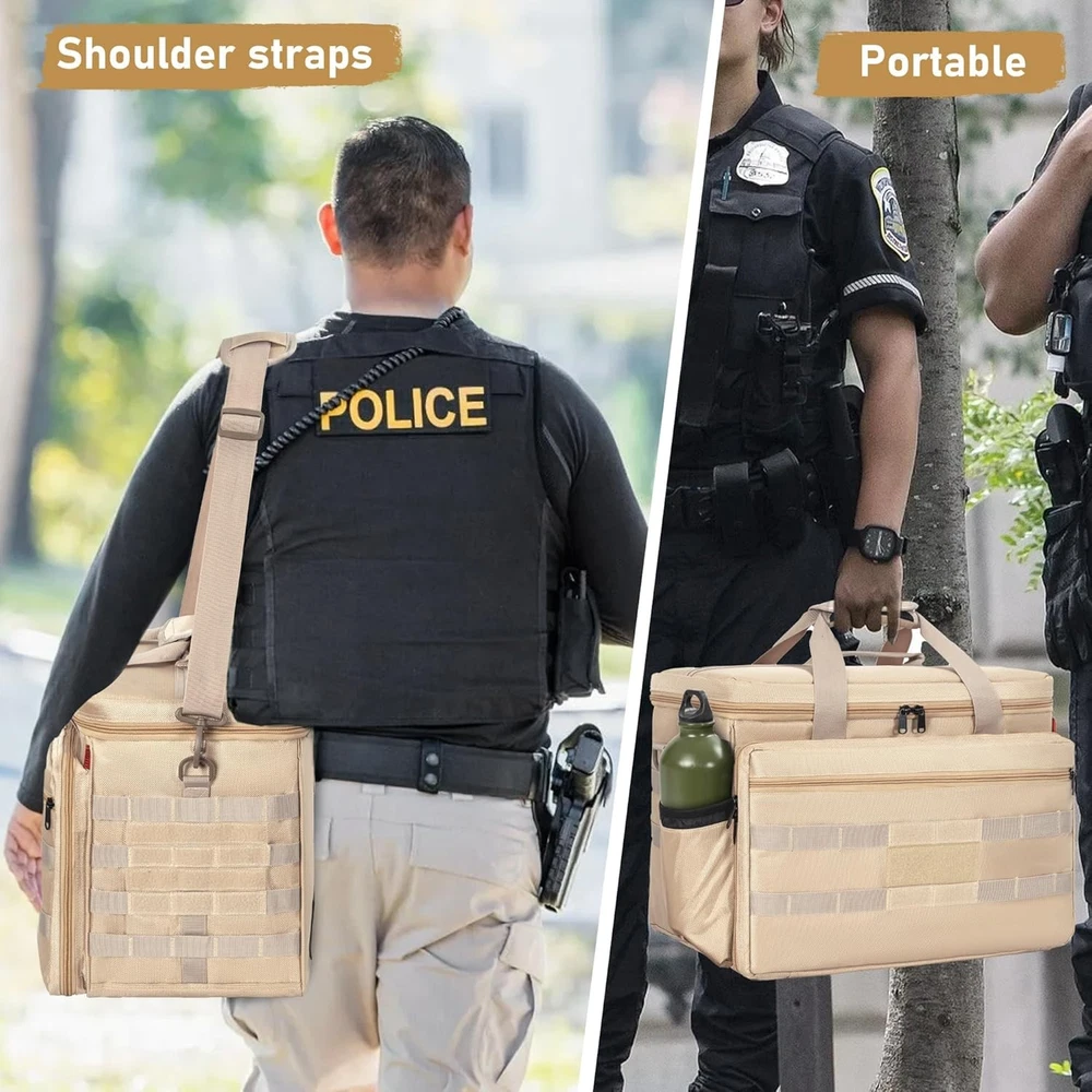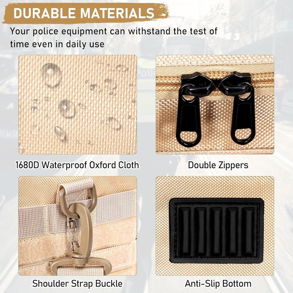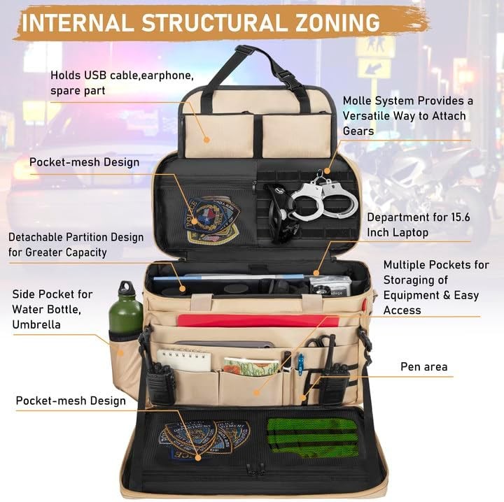 About this item 【Patrol Bag for Professionals】Specially designed for law enforcement, police officers, and truckers. This police patrol seat organizer is ideal for work and travel. Crafted from premium 1680D Oxford materials, this bag is exceptionally durable. Package Dimensions: 17.7 x 10 x 13 inches. It's your trusted companion for daily duty. 【Spacious and Easy Access】The main compartment features three removable dividers, allowing you to customize the storage space, with a special compartment for laptops inside. Multiple front pockets provide organized storage for notebooks, pens, flashlights, etc. 【Safety, Accessibility, and Confidence Combined】Rest easy with this securely fitted bag that allows quick access to your tools, whether in your car, carried by hand, or worn as a backpack. 【Multiple Pockets】The top cover includes multiple loops and a small zipper pocket for storing badges and glasses. An unfolded front pocket is convenient for placing notebooks, pens, walkie-talkies, and other items. 【Multi-functional Car Front Seat Organizer Bag】With its removable and adjustable shoulder strap, this patrol bag serves as a car seat organizer and can also function as a tactical duffle bag or shoulder duty bag. It is an ideal choice for professionals in need of efficient organization. Package Dimensions: 17.7 x 10 x 13 inches.
