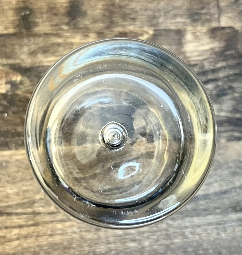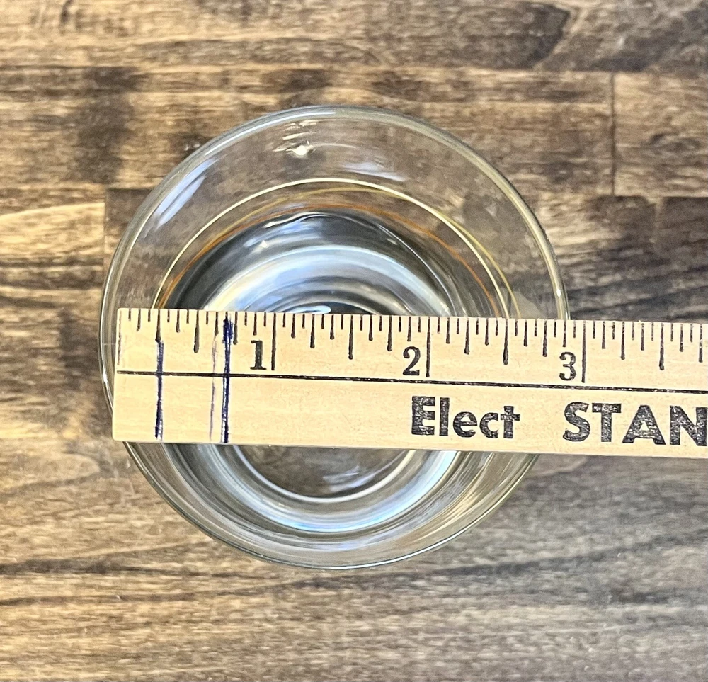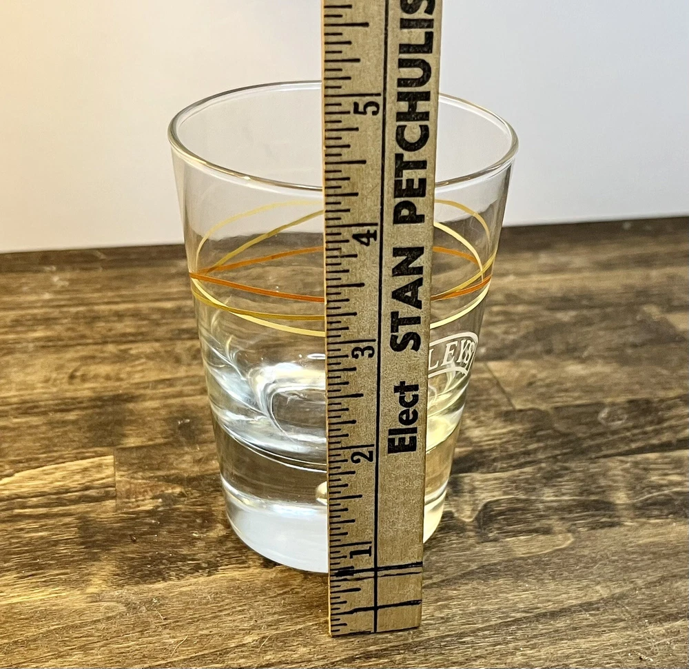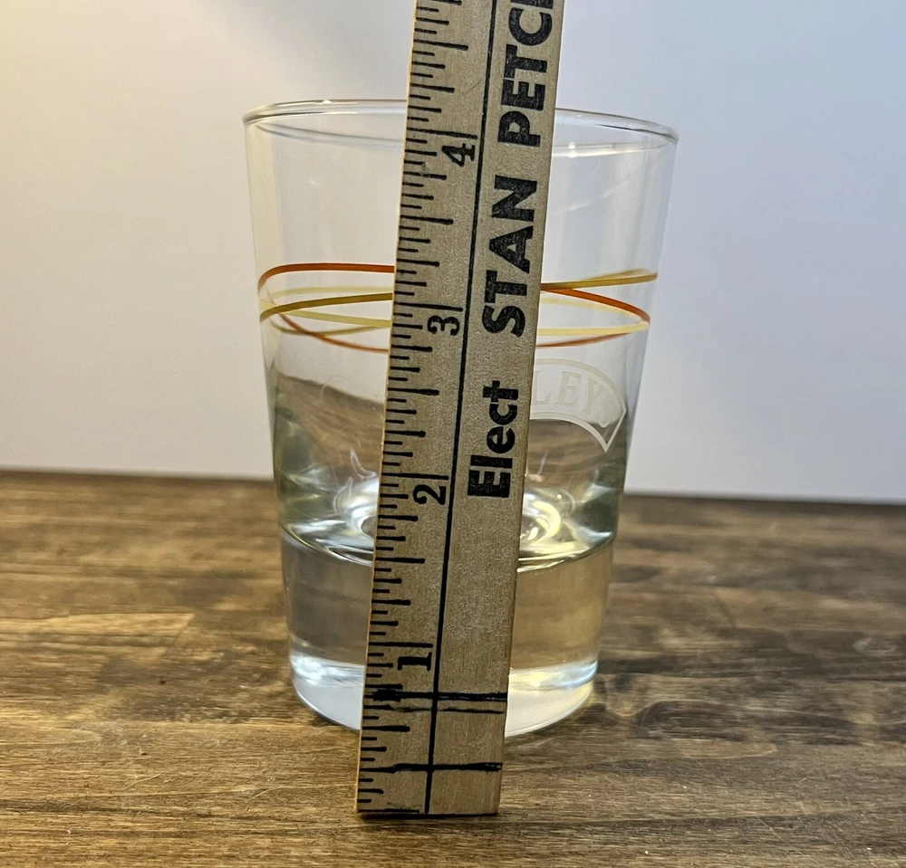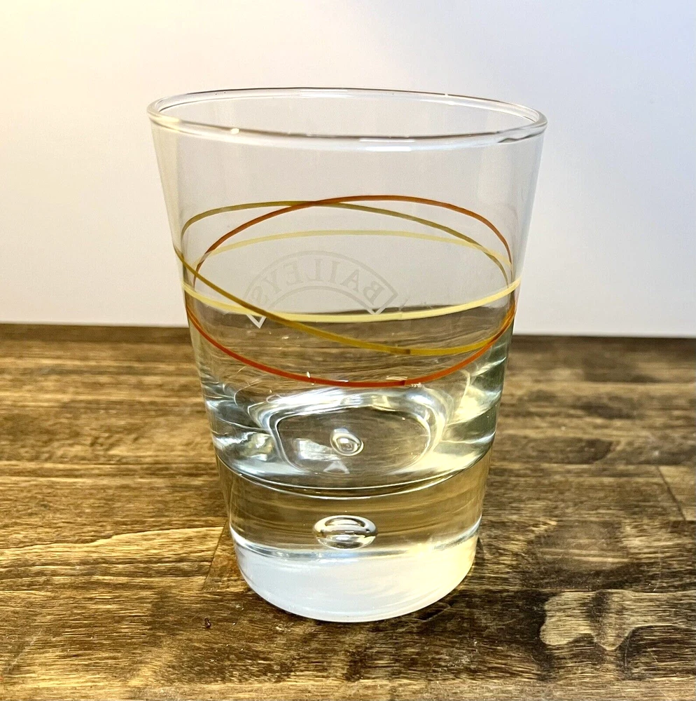 Baileys Irish Cream Highball Glass Bubble Bottom Intertwined Colored Circles 8 oz. Bailey's bubble bottom highball glass with gold and tan elliptical stripes design. These are heavy glasses with a controlled bubble in the center of the bottom. Size:3”w x 4.25” Condition: Great condition. No chips or cracks and the colors are not faded.