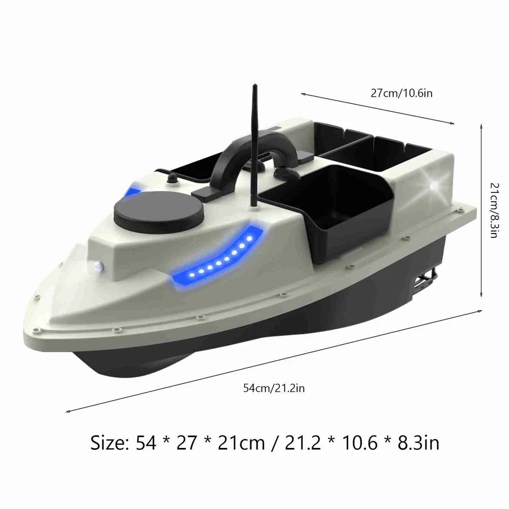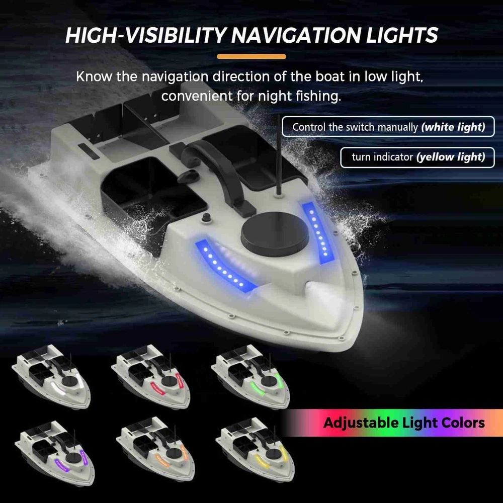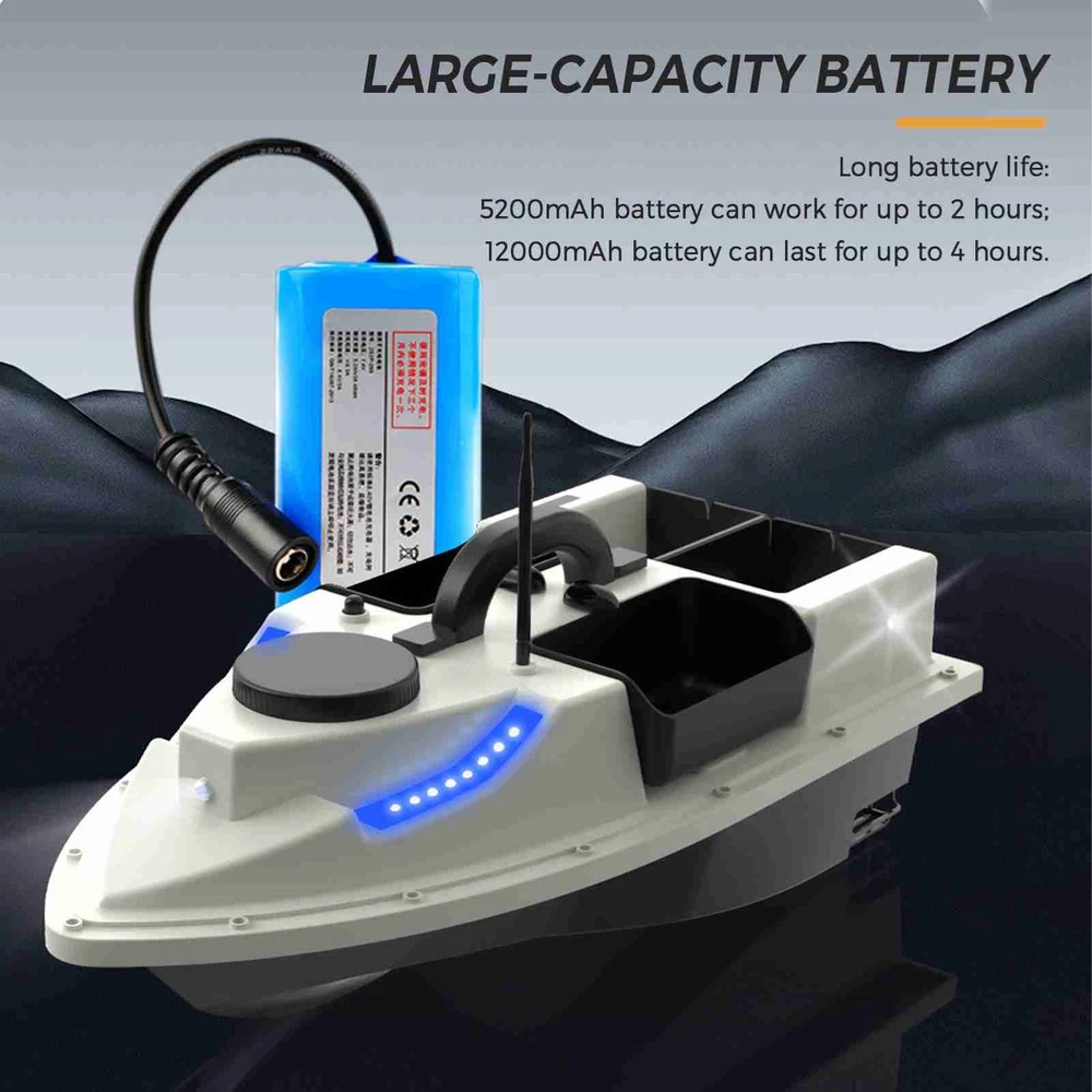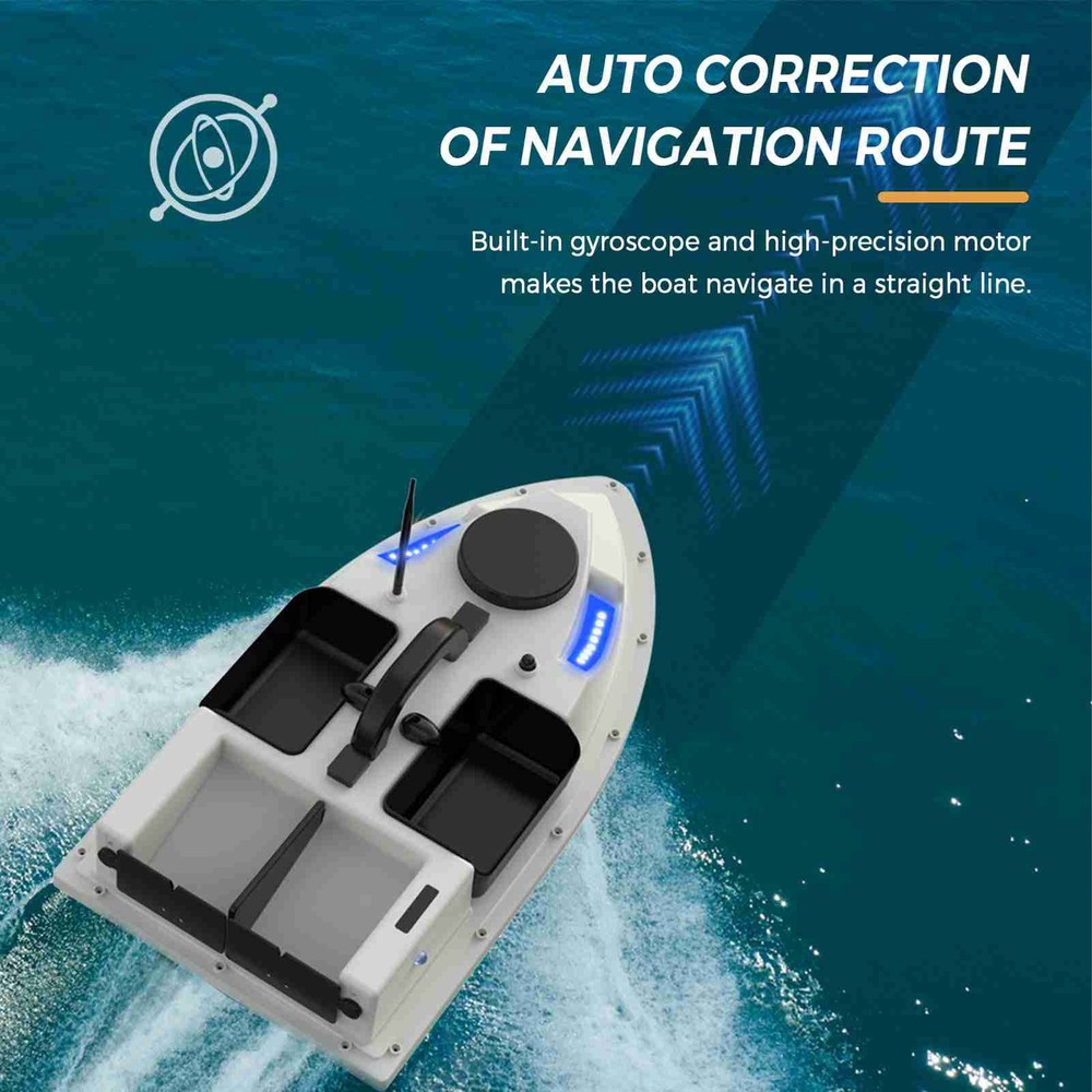 Feature: 1. GPS function allows you to set 99 baiting spots, making it easier to return to your favorite locations. 2. With remote control range up to 500 meters, you can maneuver the boat to your desired fishing spot without ever leaving the shore. 3. Correct navigation route automatically and keep sailing in a straight line even in the waves. 4. This fishing feeder boat can hold up to 2kg of bait, allowing you to cover a larger area and attract more fish. 5. 5200mAh / 12000mAh rechargeable battery for long working life. The boat automatically returns in low battery. 6. Front and rear lights provide increased visibility at night, very convenient for night fishing. 7. Fully enclosed design ensures that it can withstand harsh weather conditions and rough waters. 8. Comes with a storage bag for easy transportation. Specification: Colour: Yellow / White&Black (Optional) Battery Capacity: 5200mAh / 12000mAh (optional) Working Time: Approx. 2 hours (5200mAh); Approx. 4 hours (12000mAh) Remote Range: About 500m Material: ABS + Metal Maximum Load: 2kg / 4.4lb Size: 54 * 27 * 21cm / 21.2 * 10.6 * 8.3in Boat Weight: 1.75kg / 3.8lb Package List: 1 * Fishing Bait Boat 1 * Remote Control 1 * Antenna 1 * Battery for Boat 3 * Battery for Remote Control 1 * Battery Charger 1 * User Manual 1 * Carry Bag
