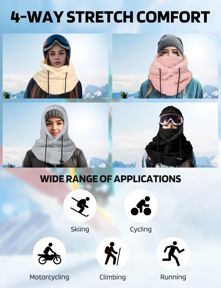 Soft Thick Fleece Lightweight and Cozy: Are you looking to keep your face warm while exploring the outdoors? This balaclava face mask is a good choice for you. This extremely lightweight Balaclava made of 100% fleece polyester fabric, cozy stretchable fleece, will keep you covered with comfortable, breathable material whenever you put it on, keeping you warm in cold weather conditions! Keep your nose, cheeks & most importantly neck toasty warm Warm and breathable Ski Mask Balaclava: The winter hat for women and men features adjustable black knit strings on both sides, allowing for a customized fit for your head and enhanced protection against wind and snow. The appropriate thickness and loose design of the Hood Scarf provide warmth without feeling constrained. The Neck Warmer comes with thicker fluff, effectively warming your neck and face. The slightly elastic design allows you to adjust the coverage on the face and neck Full Facial and Neck Protection: Ideal for various outdoor activities such as snowboarding, hiking, camping, skiing, motorcycling, running, cycling, snowmobiling, biking, trekking, mountain climbing and motorcycling. The multi-purpose face mask balaclava provides comprehensive facial and neck coverage throughout the year. Also handy to have during cold-weather outdoor activities where the wind might kick-up unexpectedly One Size Fits All: One size fits most. Suit for men and women. Adjustable design, so you don't have to worry about size. It can covers deep, down over your whole neck and some on your shoulders. The appropriate thickness and loose design of the Hood Scarf provide warmth without feeling constrained. Protect your face against cold wind and easily adjust the elastic cord on windy days. The Neck Warmer comes with thicker fluff, effectively warming your neck and face Versatile Usage Balaclava for Women: This fleece balaclava can be worn as a neck warmer, half mask or a full balaclava for the best cold weather protection. The material that covers the chin/mouth area can be pulled up to increase the facial coverage, or pulled down and tucked under the chin for eating, drinking, to allow air circulation, etc. Can be worn as full face mask or hat, open balaclava, neck gaiter or saharan Style & ninja hoodie Multiple ways to wear: Our winter face mask can be worn as an open or closed Balaclava hat, scarf, hat or mask, or you can lower your chin or use it as a neck strap to increase ventilation. It can be used alone or as an additional facial protection device under the helmet. The length of the neckline is extra long, so that you can stuff it into the jacket to prevent the wind from coming in