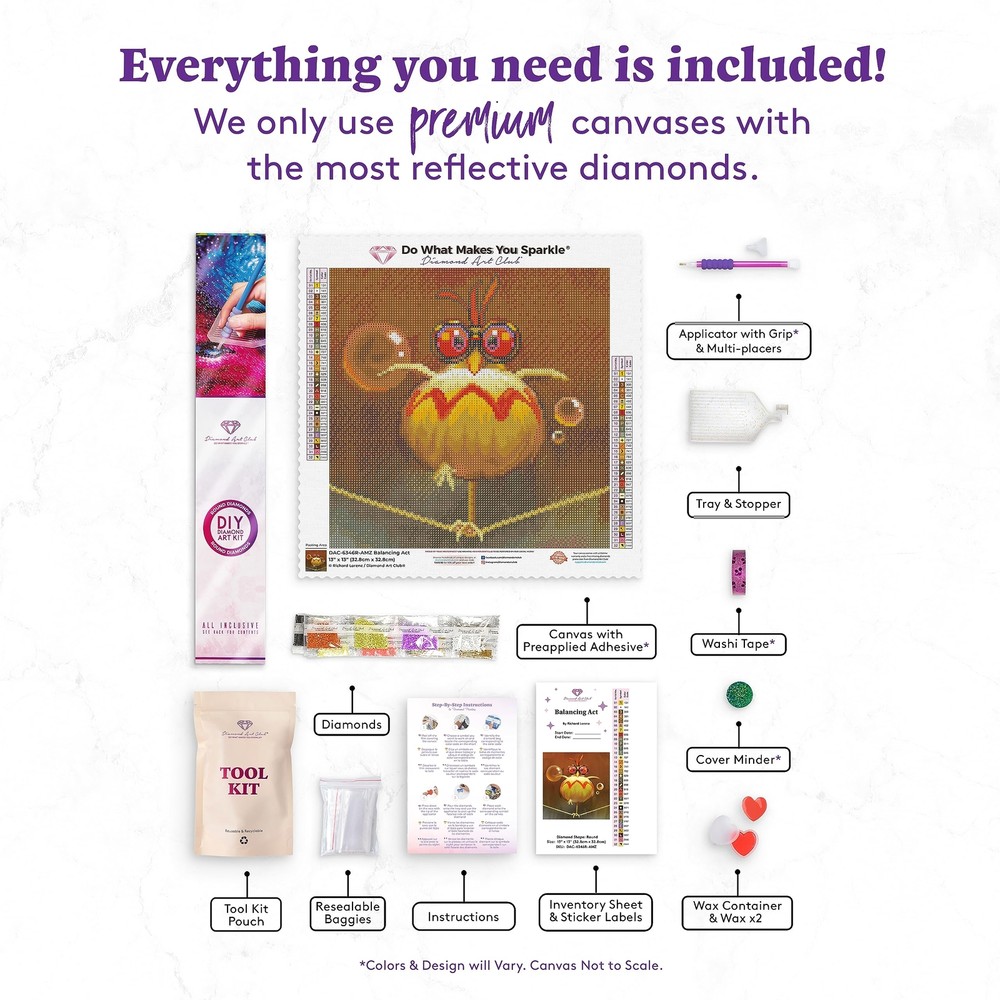 WHAT IS DIAMOND PAINTING?: Looking for a fresh take on cross-stitch, embroidery, or number painting? Simply apply colorful resin rhinestones to our velvety-soft self-adhesive canvas and create sparkling mosaic art. No experience necessary. INCLUDED: A 13" x 13" (32.8 x 32.8 cm) full-drill canvas, round diamonds in 32 colors with 2 aurora borealis diamonds and 2 fairy dust diamonds, 1 applicator with grip, 2 multi-placers, 1 cover minder, 1 tray with stopper, 1 wax container, 2 wax pads, washi tape, resealable baggies, sticker labels, and instructions. Diamond count: 13,689. OUR UNIQUE CANVAS PROCESS: We offer premium patented canvases with licensed art and the shiniest diamonds. Each canvas is hand charted for optimum clarity. Gift this cute bird diamond art painting canvas designed by artist Richard Lorenz to your friends or display it on your own wall! EASY & FUN FOR ALL: Make beautiful large or small diamond art with little effort and no mess! Diamond painting is a relaxing activity where you can create sparkling wall decor with friends and family. It’s perfect for adults and everyone who loves puzzles and DIY art projects. PREMIUM QUALITY: As a US-based company, we strive to manufacture high-quality products free from material defects. Elevate your crafting experience with this luxurious diamond art kit. Inspire creative minds with an exceptional DIY diamond painting today.
