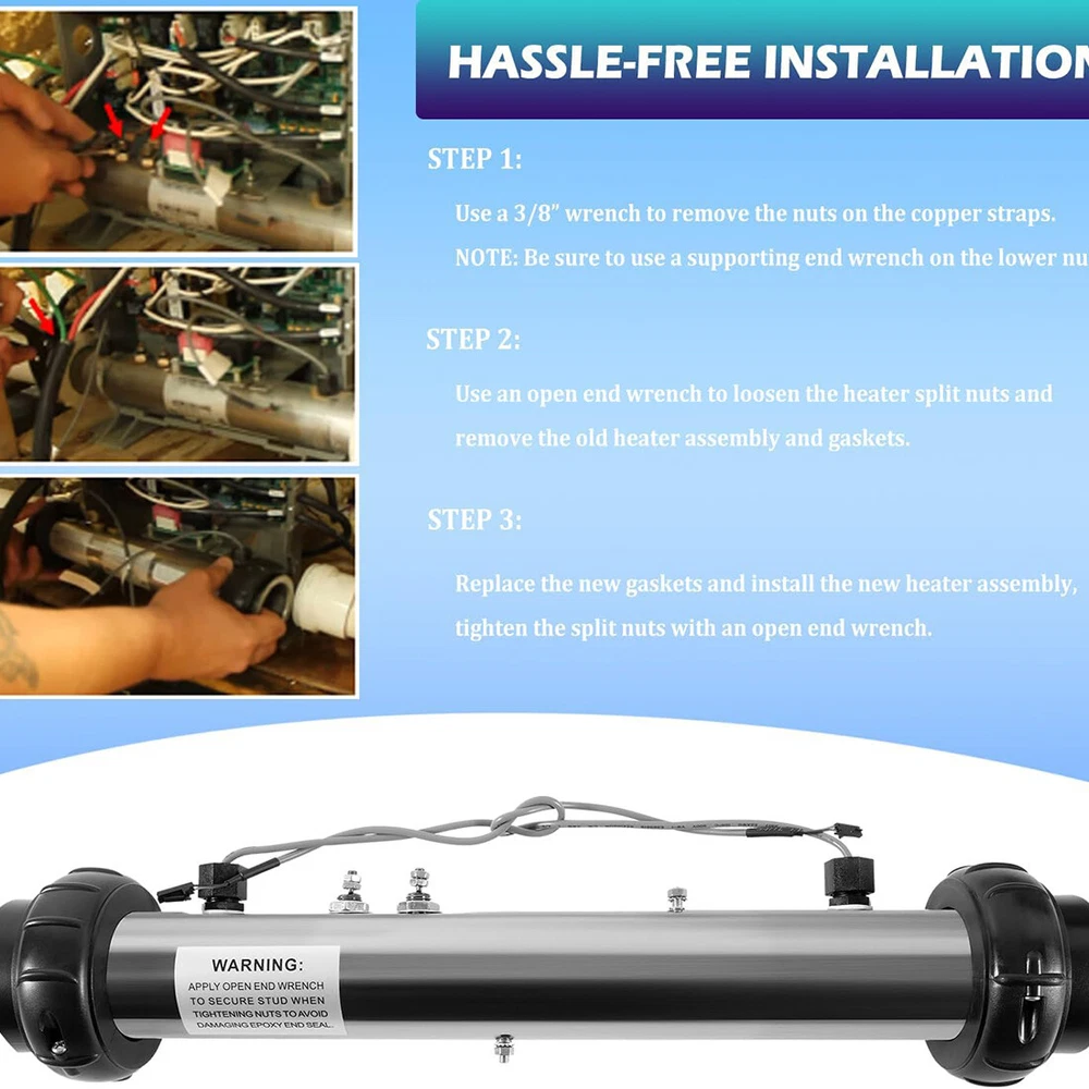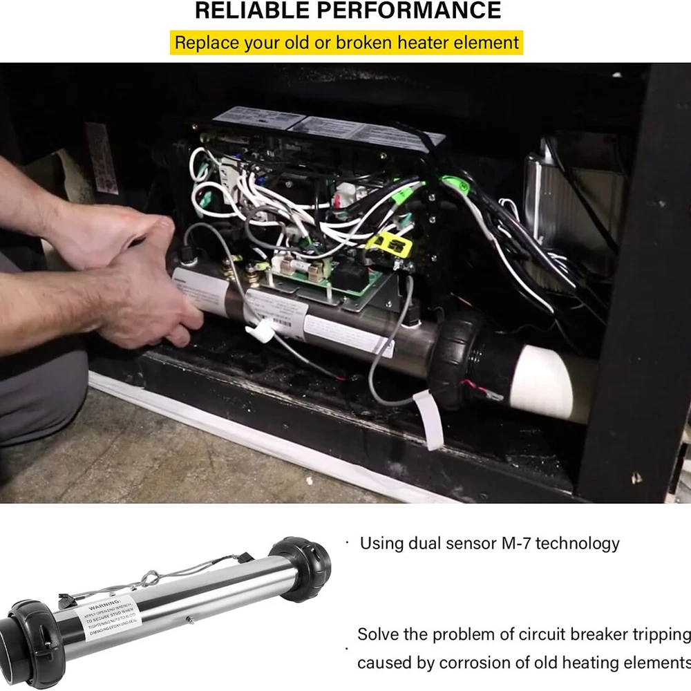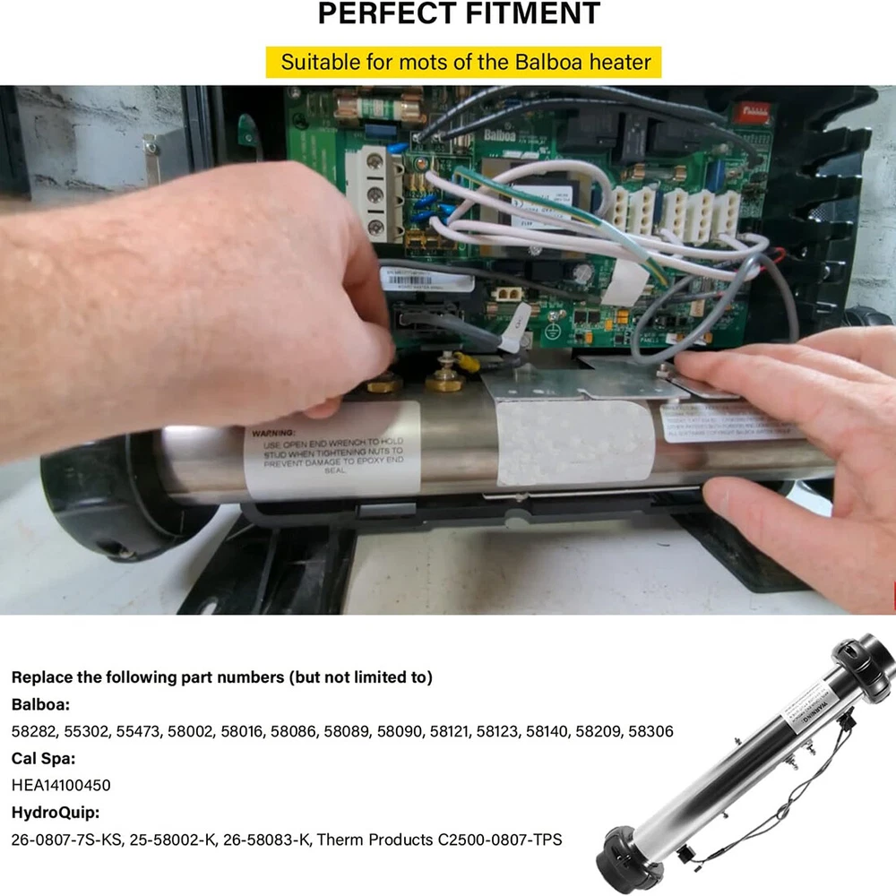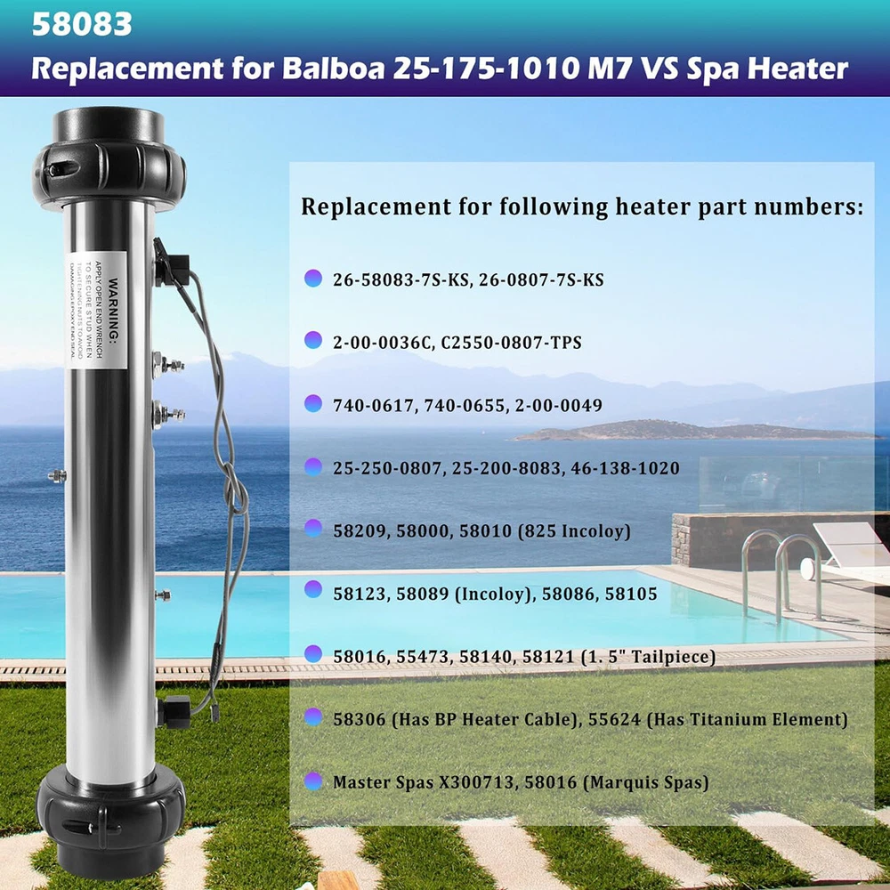 Balboa Water 58083 Heater Tube Assembly 5.5kW 230V with Sensors M7 VS With Studs Fitment: This heater is suitable for Balboa BP Series control systems, such as BP501G1, BP501G3, BP2000G1, BP7, as well as for Balboa VS Series and EL2001 Series control systems, such as VS501Z, VS510SZ, VS520SZ, and EL2001M3 Great Compatibility --- This heater can be a convenient substitution for a great deal of models, including: 26-58083-7S-KS, 26-0807-7S-KS, 2-00-0036C, C2550-0807-TPS, 46-138-1020, 740-0617, 740-0655, 2-00-0049, 25-250-0807, 25-200-8083 58121 (1. 5" Tailpiece), 58209, 58000, 58010 (825 Incoloy), 58123, 58089 (Incoloy), 58086, 58105, 58016, 55473, 58140, 58306 (Has BP Heater Cable), 55624 (Has Titanium Element), Master Spas X300713, 58016 (Marquis Spas) Features: 1) This heater can be a convenient substitution for a great deal of models, including 26-58083-7S-KS, 26-0807-7S-KS, 2-00-0036C, C2550-0807-TPS, 58121 (1. 5" Tailpiece), 58209, 58000, 58010 (825 Incoloy), 58123, 58089 (Incoloy), 58086, 58105, 46-138-1020, 58016, 55473, 58140, 740-0617, 740-0655, 2-00-0049, 58306 (Has BP Heater Cable), 55624 (Has Titanium Element), Master Spas X300713, 58016 (Marquis Spas), 25-250-0807, 25-200-8083 2) The 58083 M-7 Heater Assembly can be used as a replacement heater for spas or hot tubs, featuring its own sensors, front-mounted design for user convenience, and easy servicing 3) Equipped with a 316 stainless steel heater housing and a 5.5KW Incoloy Flo-Thru heater element, it also supports Balboa OEM M7 dual sensors 4) Manifold Length: 15", Manifold Diameter: 2", Kilowatt Rating: 5.5KW / 1.375 KW, Voltage Rating: 240V / 120V Package included: 1 heater, 1 pair of 2. 0" heater split nuts, 1 pair of 2. 0" heater tailpieces with o-ring gaskets