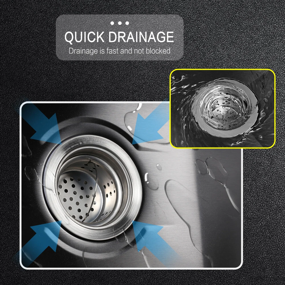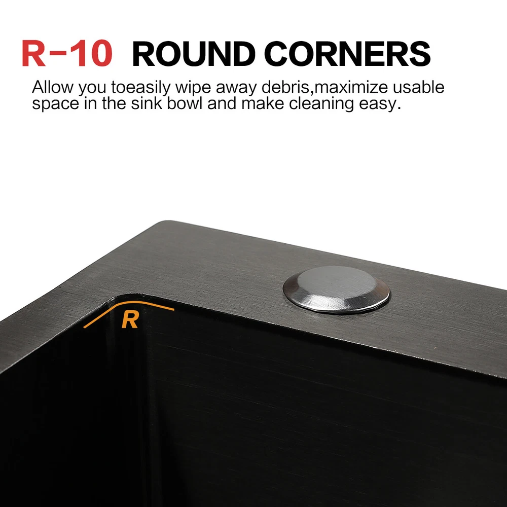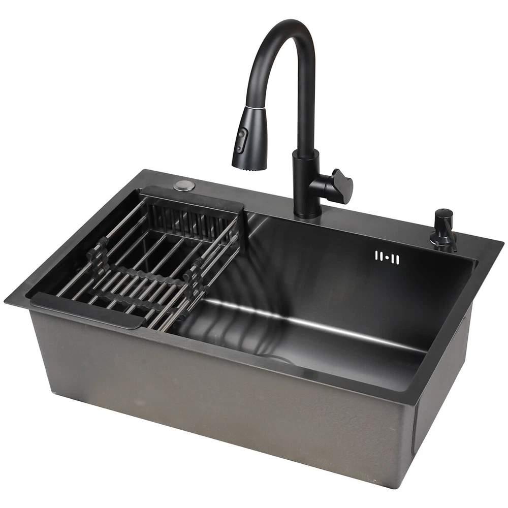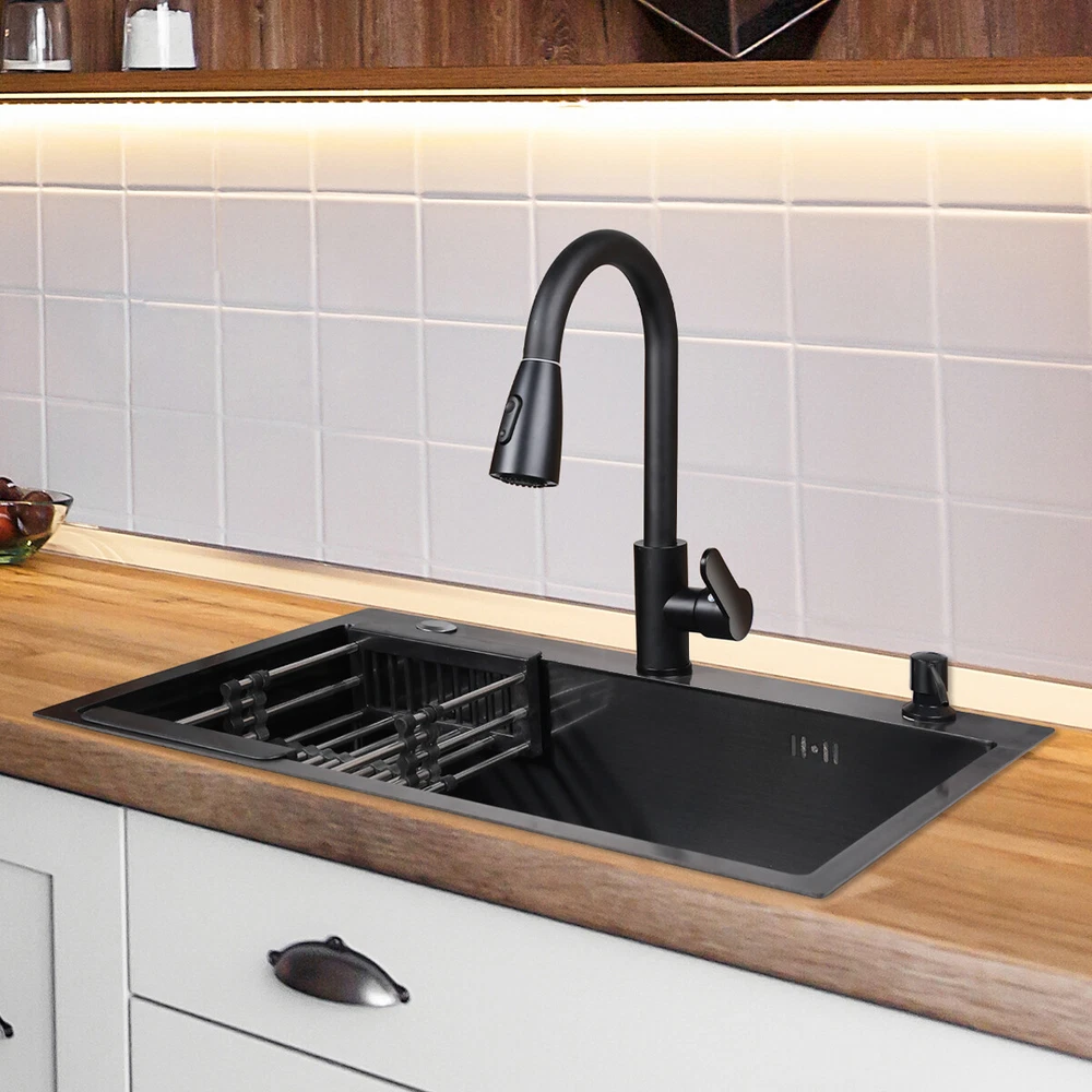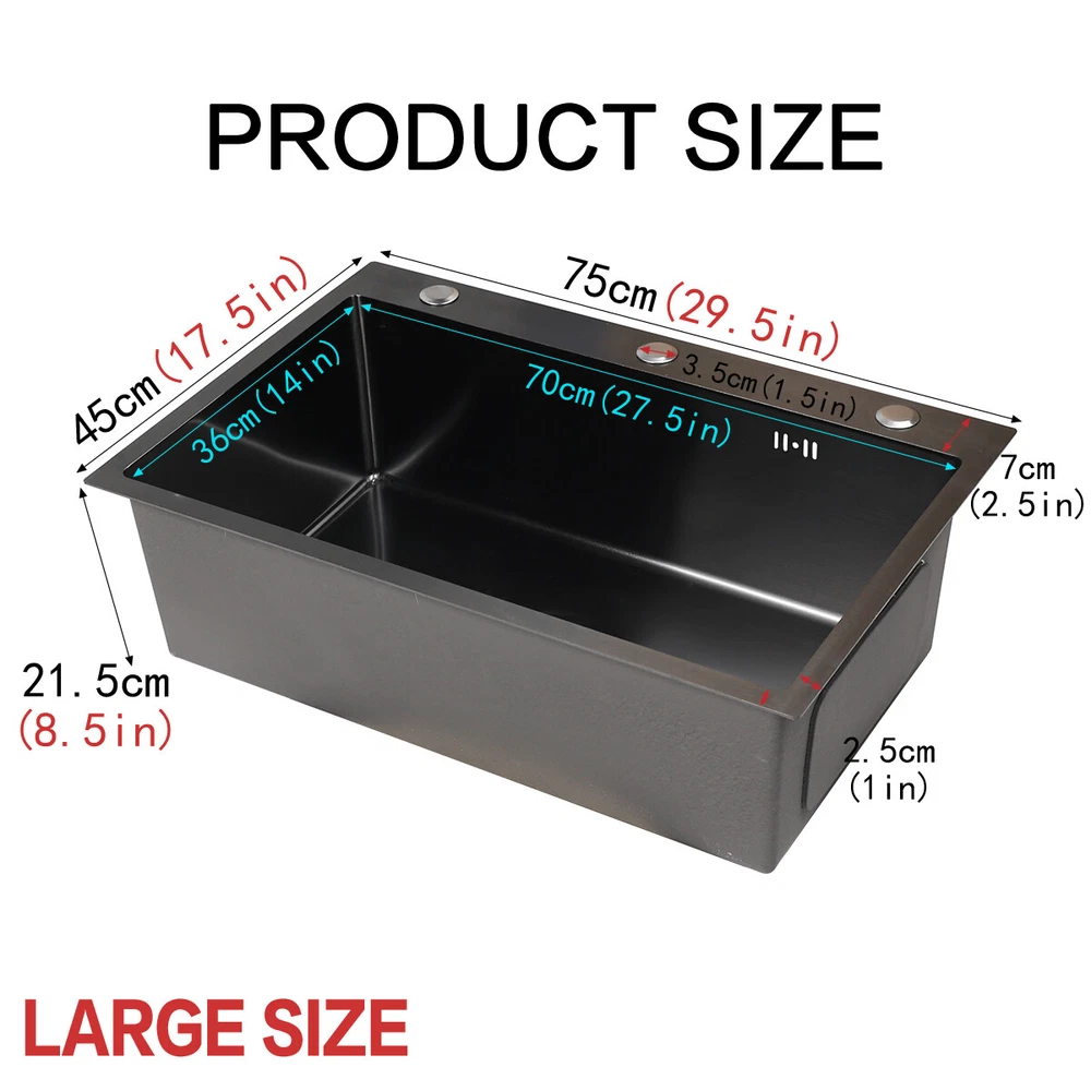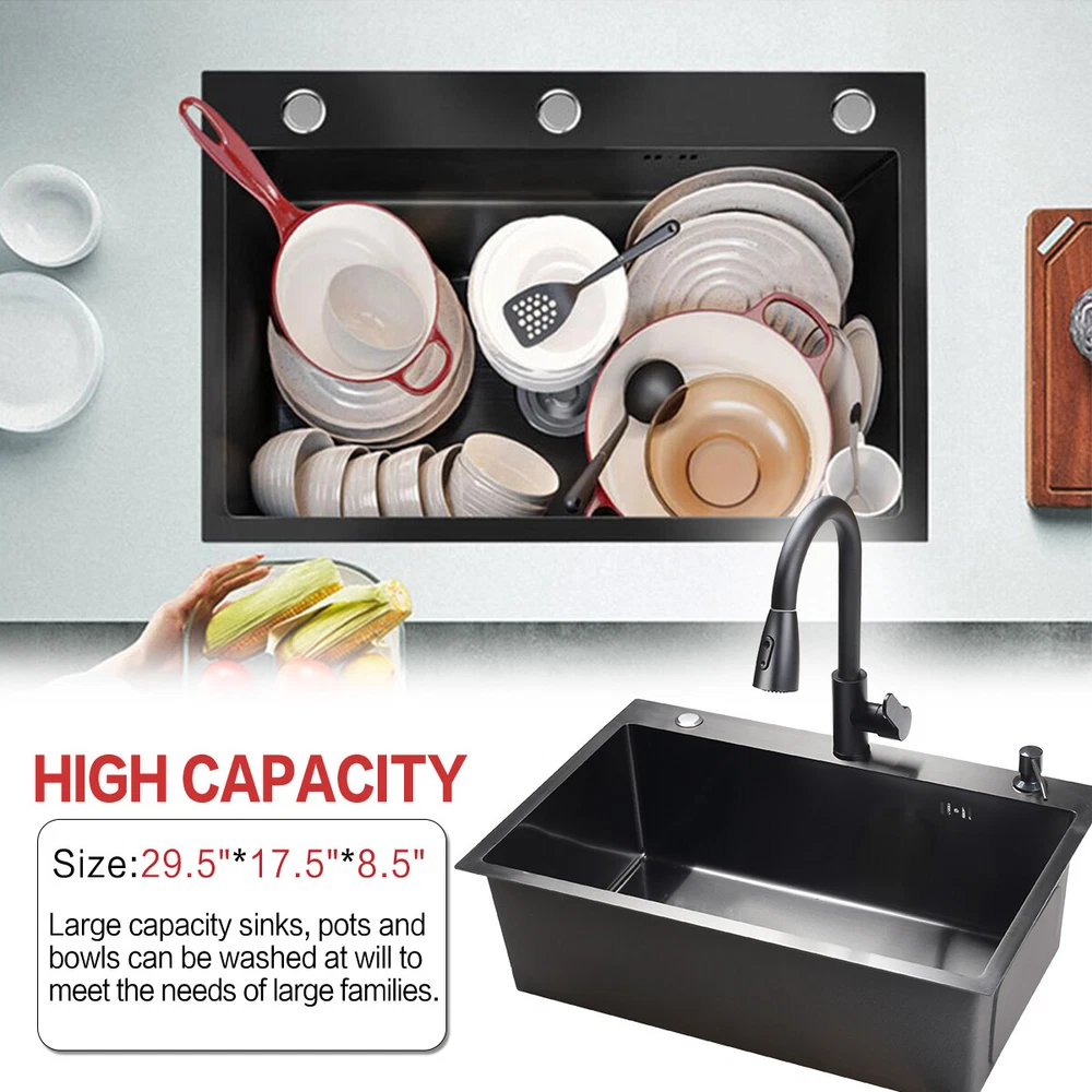 29.5" Black Kitchen Sink Deep Single Bowl 304 Stainles Steel w/ Pull-out Faucet Features Pull-out faucet, 360° cleaning without dead angle, more convenient. Strict selection of stainless steel, thick, durable, and not easily deformed. With 7 layers and 147 processes, it is resistant to dirt and oil stains. After long-term use, it will not scratch or fade, boil at high temperatures, fade, scratch, and leave no marks. Nano coating, which forms beads when falling into water without oil stains, makes cleaning more convenient. Deepen the sink, increase capacity, R10 near right angle, and increase utilization space. The sink has three holes, a kitchen faucet, a soap dispenser, and a water purifier, making it more convenient for you to install according to your habits. The bottom of the sink is coated with anti condensation coating, which prevents cold condensation and keeps the cabinet dry and clean for a long time. With a condensation coating, it effectively prevents cold condensation and keeps the cabinet dry and clean. Without condensation coating, it is easy to condense water droplets, causing mold on the inner walls of the cabinet. EVA sound-absorbing pad alleviates the impact of water flow on the bottom of the sink, reduces vibration, and achieves sound-absorbing effect. High level overflow hole to prevent water from flooding the golden mountains. Enlarge the pore size of the water heater and use multiple filtering cages to ensure fast and non clogging drainage. Scalable drainage basket, adjustable length, space reuse, and larger space. Anti odor drainage hose, anti odor and anti mosquito, resistant to high temperature and quick drainage. Specification Condition: Brand New Color: Black Material: 304 Stainless Steel Faucet Type: Pull-out Faucet Sink Type: Single Bowl Mounting: Drop-in/Top Mount/Undermount Room: Basement, Kitchen, Utility/Laundry Room Size: 29.5*17.5*8.5inch/75*45*22cm Package Includes 1 x 29.5inch Sink 1 x Pull-out Faucet 1 x Pull-out Drainer Basket 1 x Hydathode 1 x Drain Pipe 1 x Soap Dispenser 2 x Water Pipe 2 x Angle Valve Warranty 1.If your item has been damaged in transit or becomes faulty during the warranty period, please email us with pictures or video to show the problem. 2.Please check everything carefully after you receive the parcel, as any damages except DOA (Dead-On-Arrival) are not covered if it's the fault of the consumer. 3.Please submit all enquires via the “Ask a Question” tab, located at the bottom of this page. 4.If your question cannot be answered, please send us a message and we will reply within 12 hours during business days, and within 72 hours during weekends. 5.Replies will go to your registered eBay account. We are happy to resolve any issue, so please contact us before leaving feedback.