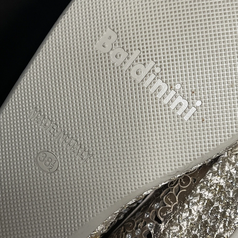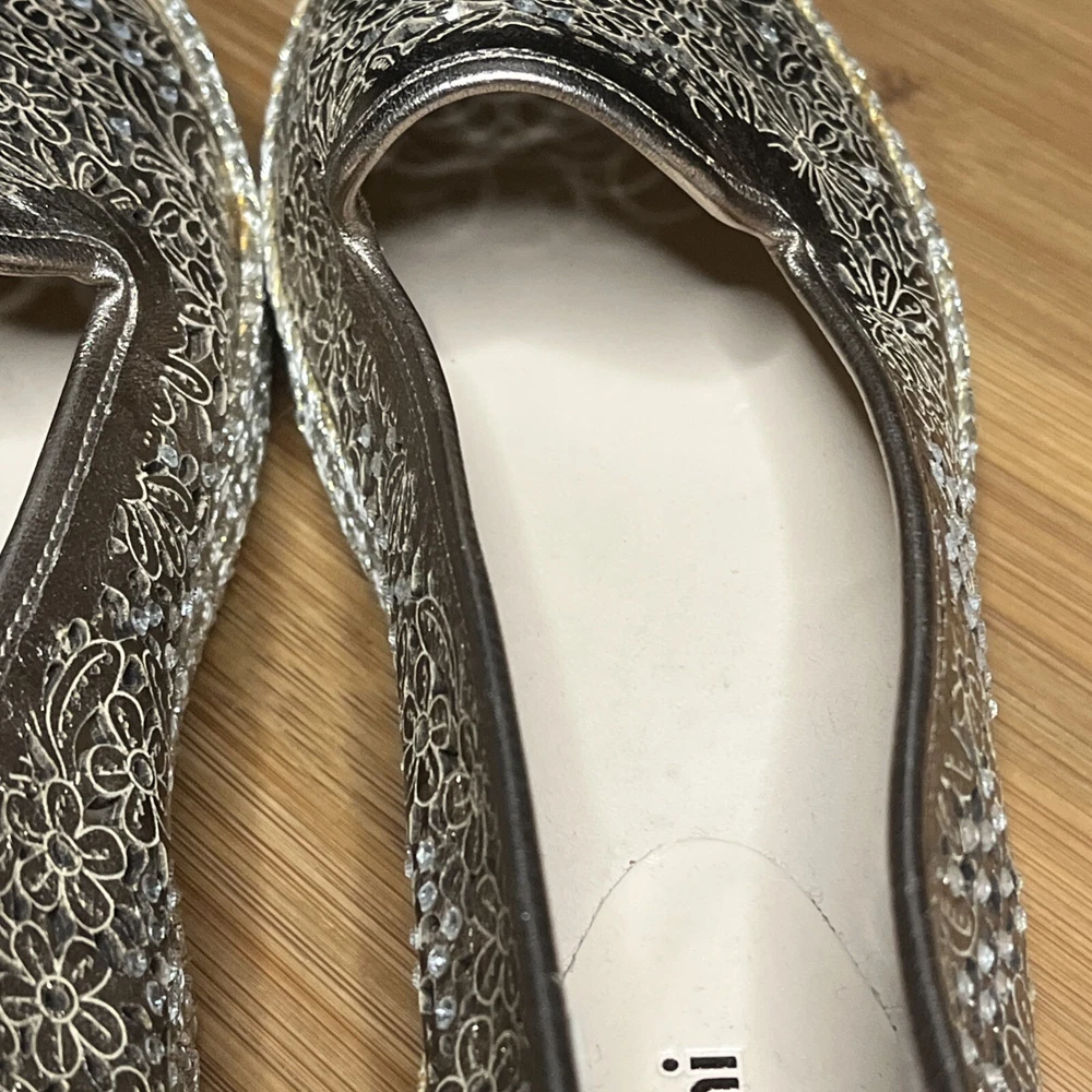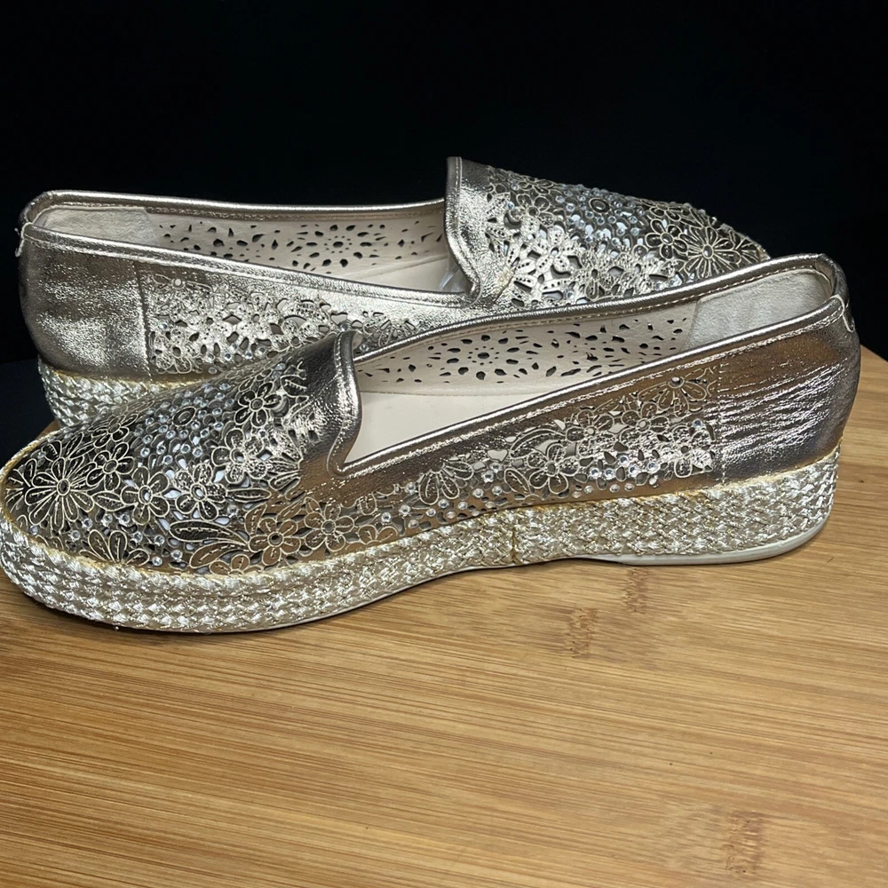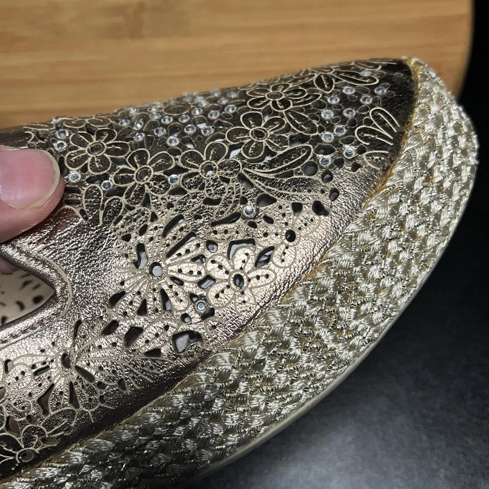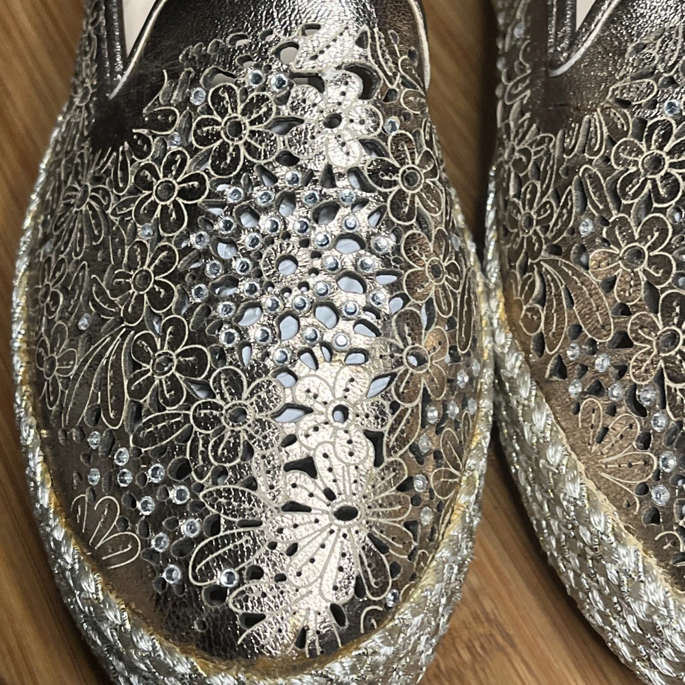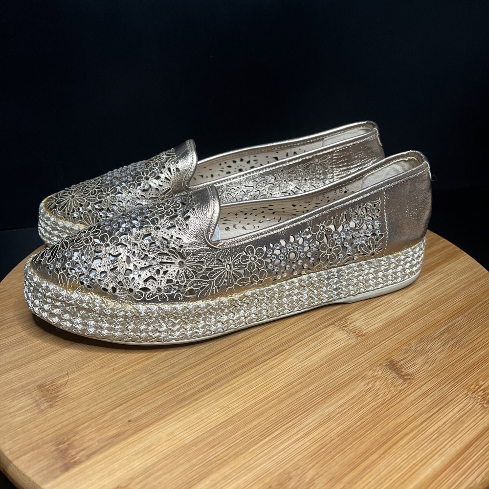 These Baldinini Espadrilles in a stunning gold color feature an almond toe shape with laser-cut floral accents adorned with crystals, giving off a bohemian and metal-themed vibe. The slip-on style and flat heel make them perfect for casual and activewear occasions, while the slip-resistant rubber outsole and lightweight design ensure comfort for walking and daily wear. Crafted in Italy with leather upper and faux leather insole, these stylish shoes in size US 8 (UK 6, EU 38.5) are a chic and versatile addition to any wardrobe.
