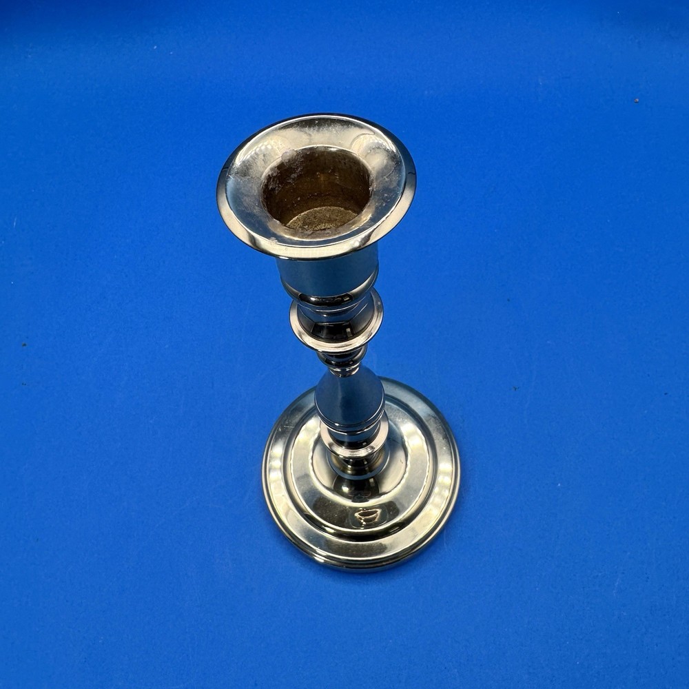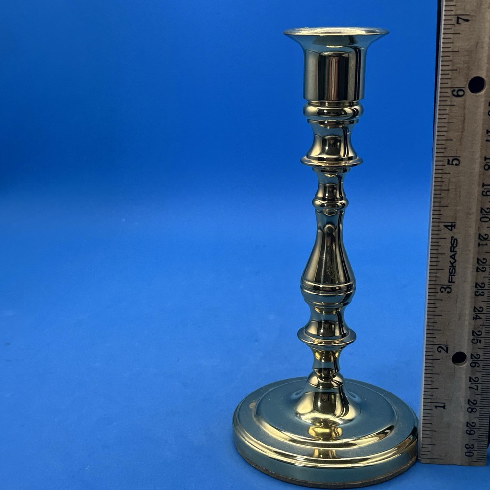 The product described is a vintage 7" brass candle holder in a colonial style, made by the brand Baldwin. The candle holder is polished brass with a gold color, adding a touch of elegance to any decor. Perfect for collectors or those looking to add a touch of historical charm to their home, this candle holder is a beautiful and timeless piece that will enhance any space.