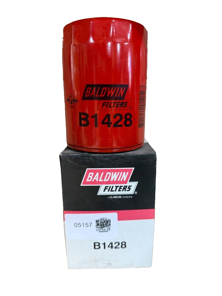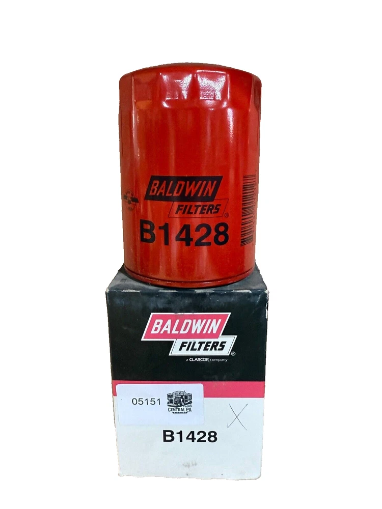 This is a Baldwin Oil Filter B1428, featuring a Spin-On mounting style with a thread diameter of 13/16"-16. It comes with a gasket and is made of metal with a painted finish. The filter has a diameter of 3 11/16 inches and a length of 5 11/32 inches. It is designed for easy installation on the front of a vehicle. The gasket material is rubber, and the filter is manufactured in the United States. No warranty is provided for this new old stock (NOS) item.