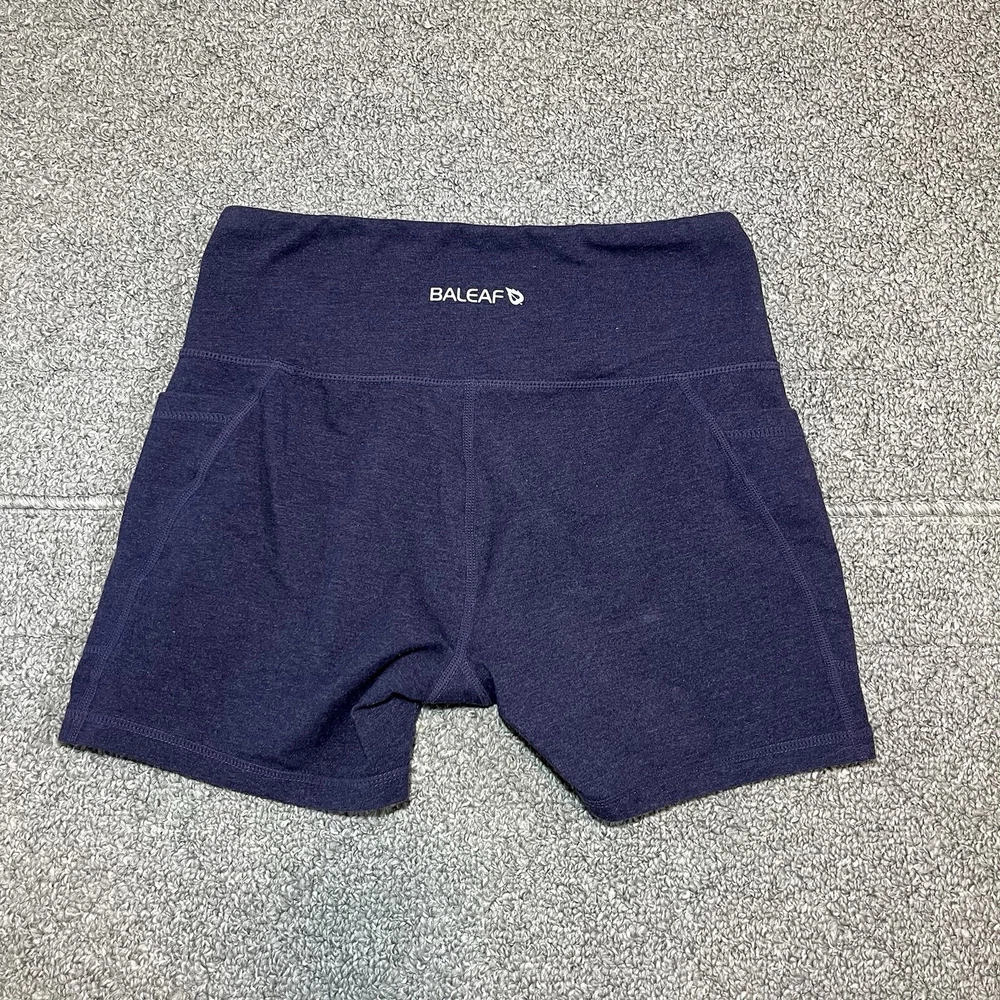 Baleaf Athleisure Workout Shorts with Pockets Womens Size Small Blue See measurements for accurate fit. Waist 12 inches across. Inseam 5 inches Rise 8 inches All measurements are done flat lay