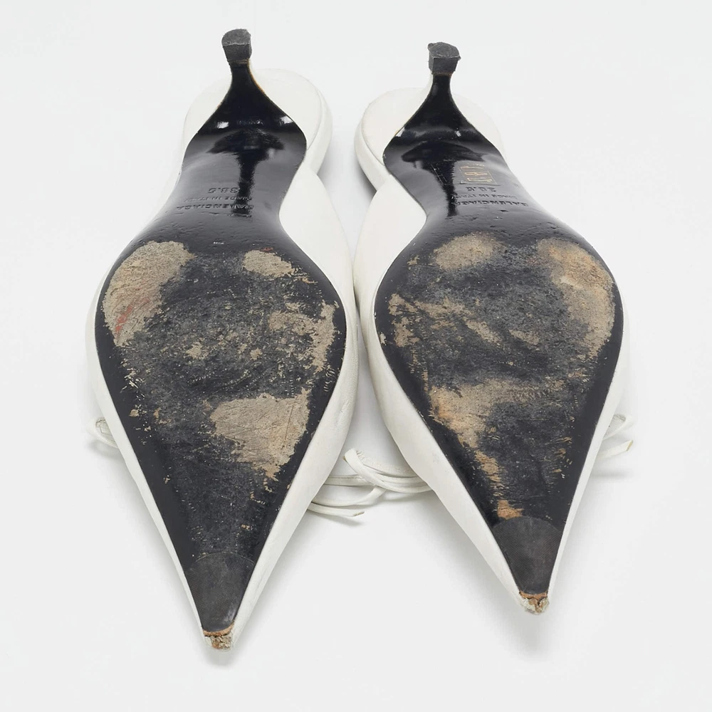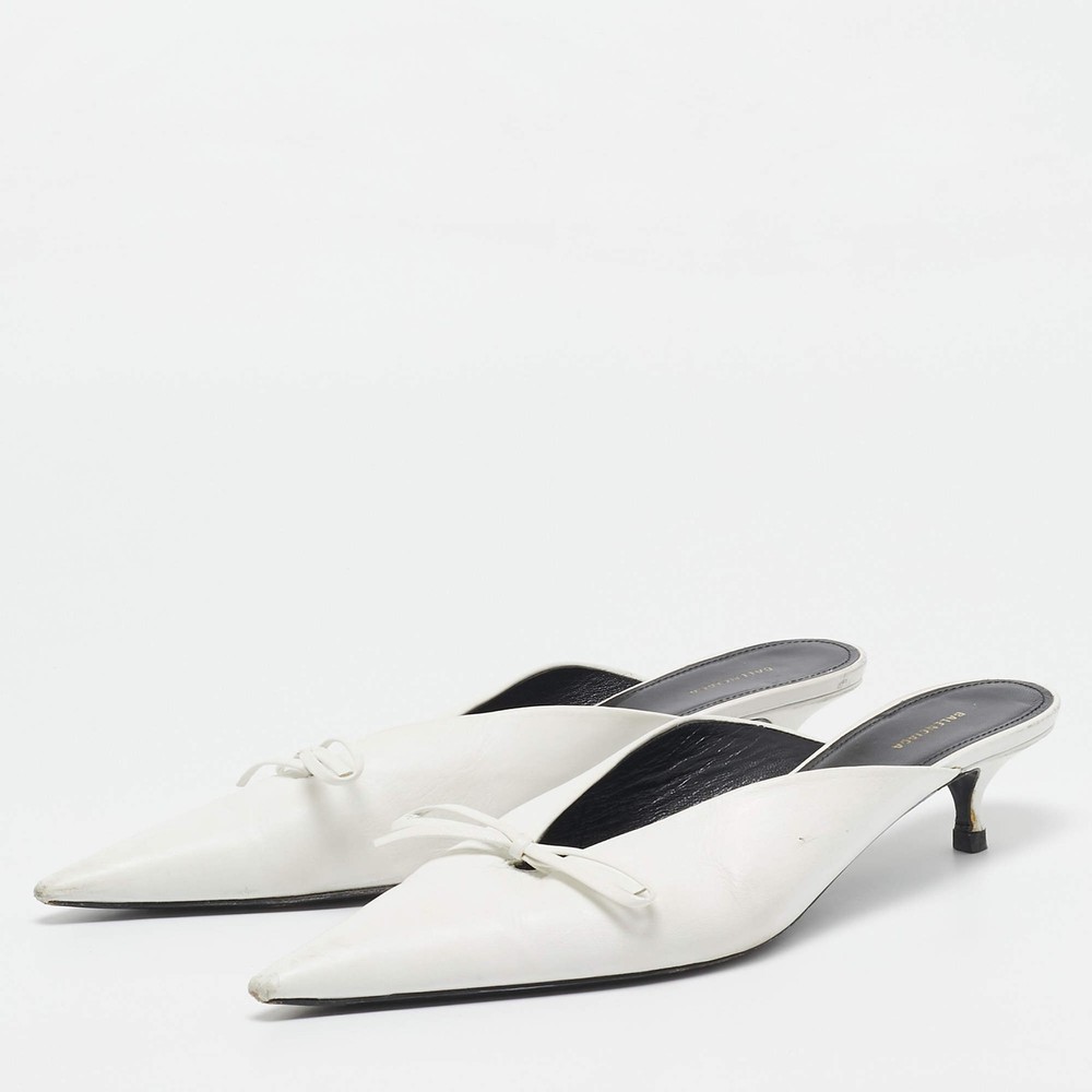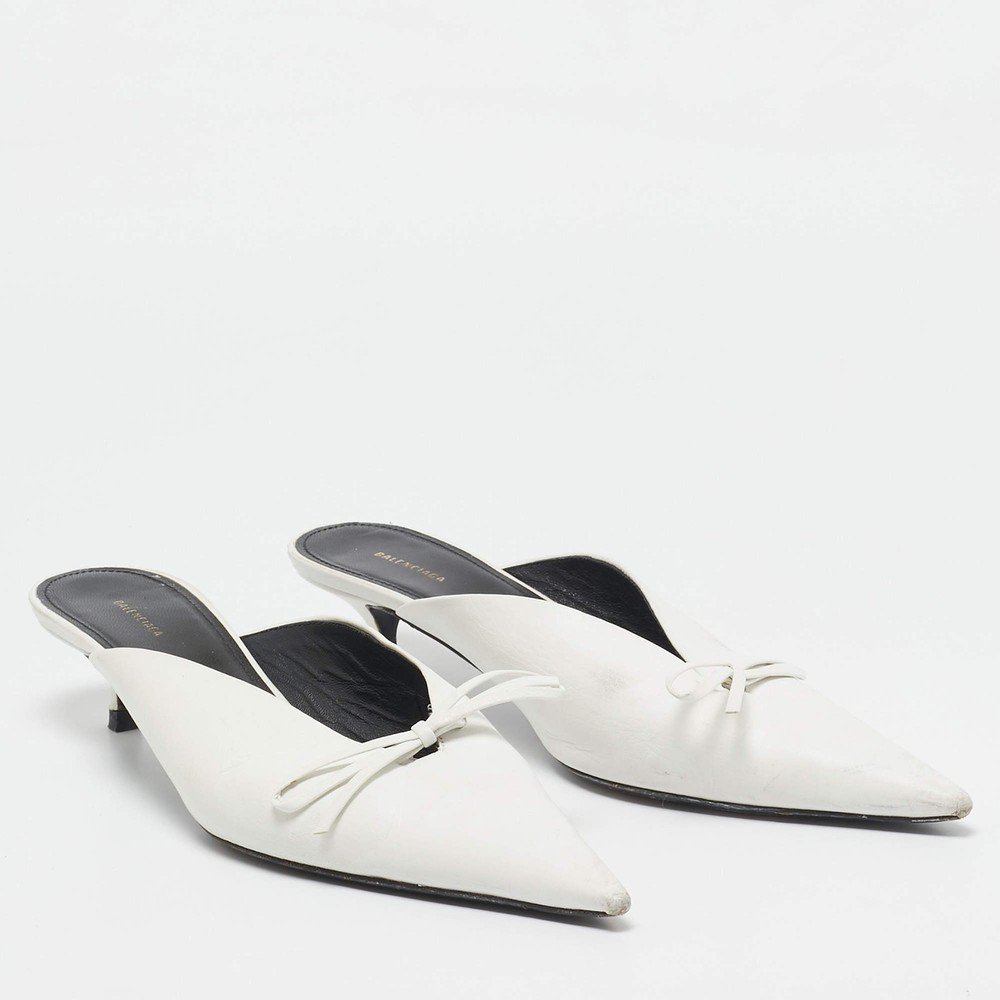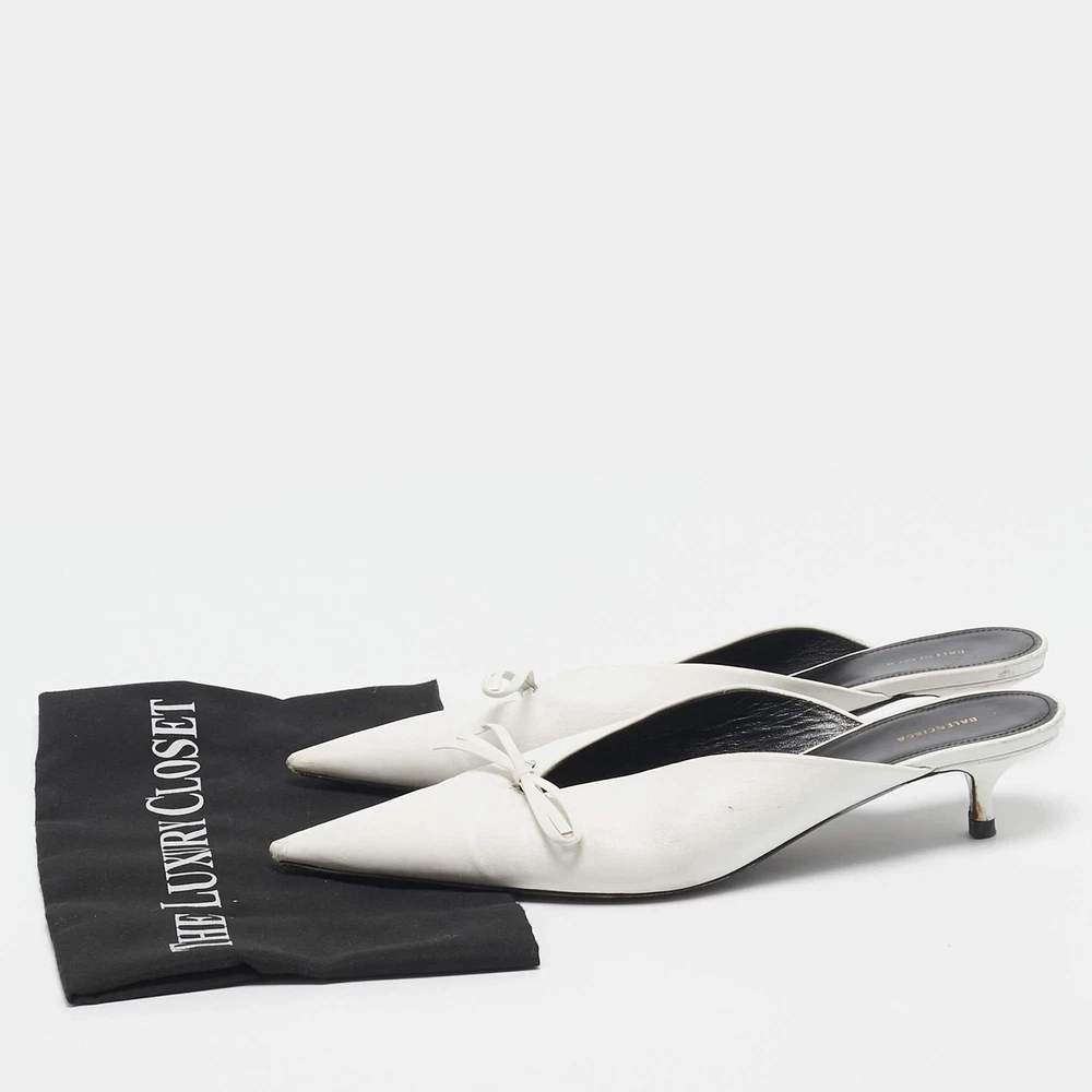 Our eBay Store About Us Contact Us Add to Favorite Sellers Balenciaga White Leather Knife Bow Mules Size 38.5 Balenciaga’s Knife Bow mules in crisp white leather are the epitome of modern minimalism with a sculptural edge. The sharply pointed toe and elegant bow detailing create a striking silhouette that’s perfect for elevating evening or daytime looks. Product Details Brand Balenciaga Color White Includes The Luxury Closet Packaging Outsole Length 27 cm Outsole Width 8 cm Size 38.5 Certified by The Luxury Closet This item has gone through a detailed authentication process overseen by our experts. We offer a lifetime guarantee of authenticity on all our items. How We Check The in-house team of experts at The Luxury Closet is highly trained to verify the authenticity and the condition of the luxury products. They ensure that only 100% authentic items are put on sale.The evaluation process is unique with its own mix of assessment criteria and differs according to the category. Each item is evaluated based on the following combination of hallmarks, hardware, stitching, symmetry, material, craftsmanship, stamping, codes, hologram stickers, and packaging. Our authenticators also check if the items have been modified or amended (e.g., aftermarket diamonds, replaced batteries, repaired bags, etc.) International Buyers Import duties, taxes and charges are not included in the item price. These charges are the buyers responsibility. Please check with your country’s customs office to determine what these additional cost will be prior to buying.