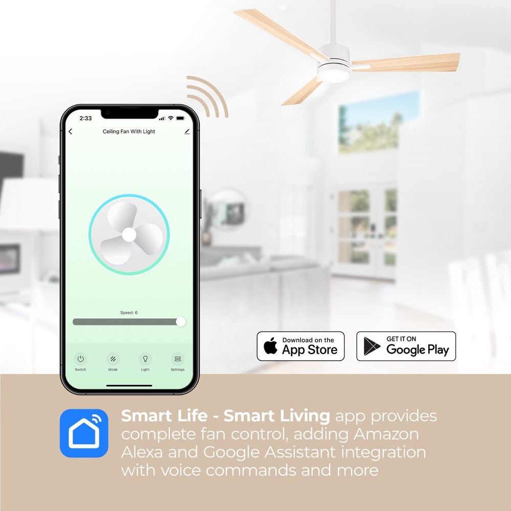Bali Smart 3-Blade Ceiling Fan 2700K-6000K CCT Selectable LED Light Kit with Remote Control and Reversible Blades Works With iOS or Android App. SMART: APP-enabled controls, download the Smart Life app on your iOS or Android device to adjust fan speed, change light kit color temperature and brightness, set schedules, grouping, and toggle summer/winter mode. LOCAL CONTROLS: Installs onto an on/off wall switch to easily switch power on and off. Includes an intuitive white remote control with wall mounting cradle for seamless controls of all basic fan and light functions. EFFICIENT AND SILENT: Powered by ultra-efficient and completely silent 6-Speed Reversible DC motor, these fans are up to 70% more energy-efficient than traditional fans and undergo rigorous testing to ensure smooth, wobble-free performance. CUSTOMIZABLE LIGHTING: Features a replaceable LED luminaire with brightness control range 100% to 10% and multiple color temperature range (2700K-6000K and everything in-between). CERTIFICATIONS & INSTALLATION: ETL, cETL, UL, cUL, and CSA certified for covered indoor or outdoor use. Compatible with sloped ceilings up to 32 degrees. Includes a 6in downrod, additional downrods can be purchased separately for longer lengths. Suggest: Modern Forms Downrod XF-XX. STANDARDS: ETL & cETL UL #1598 Listed for Wet Locations. Five year manufacturer's warranty.
