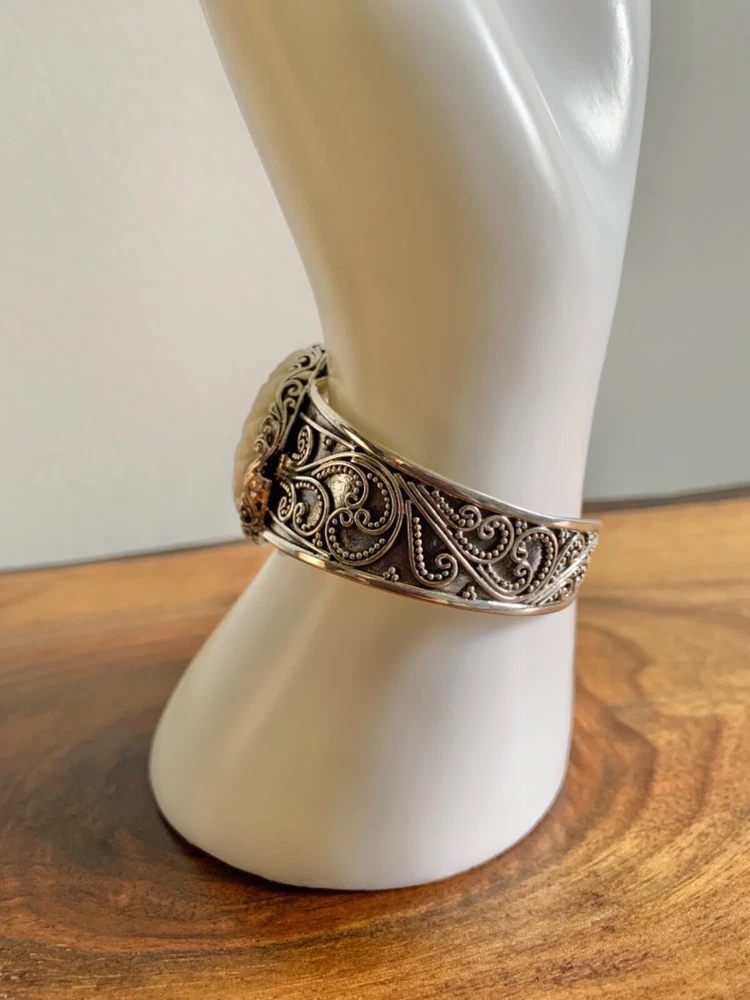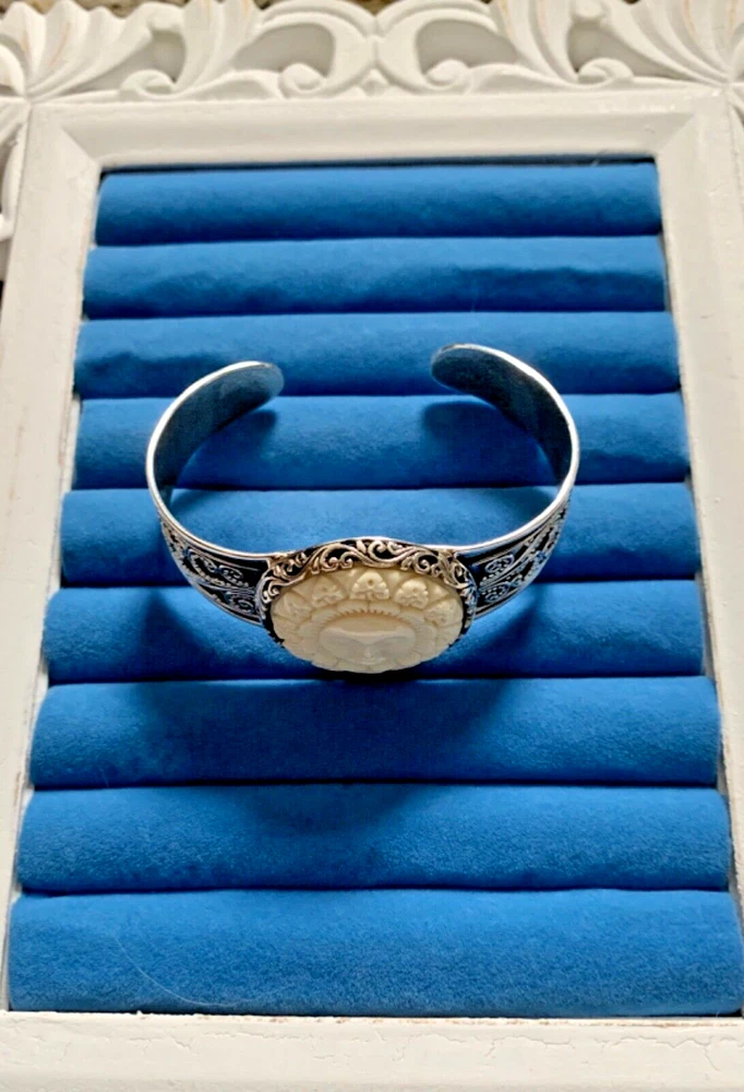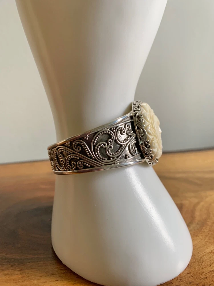 Add a touch of elegance to your wrist with this stunning Bali Goddess Carved Cuff Bracelet. The cream-colored stone is beautifully complemented by the sterling silver metal, making it a perfect accessory for any outfit. The cuff style adds a unique touch to the bracelet, making it stand out from other pieces. The 7.50-inch size ensures a comfortable fit for most wrists. This handcrafted piece is made with 925 metal purity, ensuring its high quality. The Bali Goddess Bracelet is a must-have for any jewelry collection. Was: $159.99 On Sale: $119.88