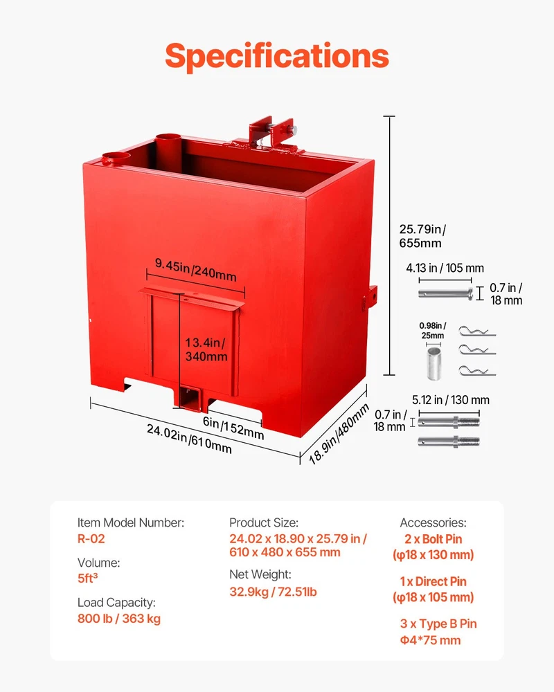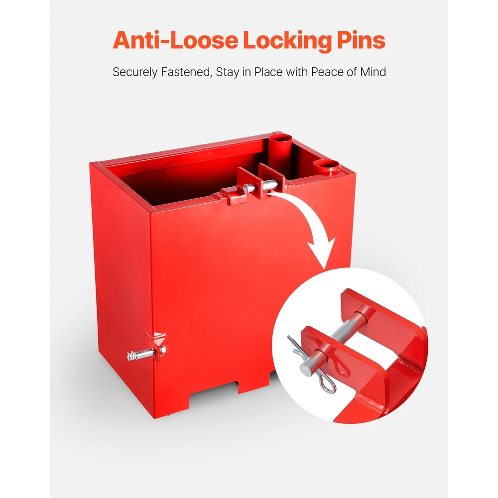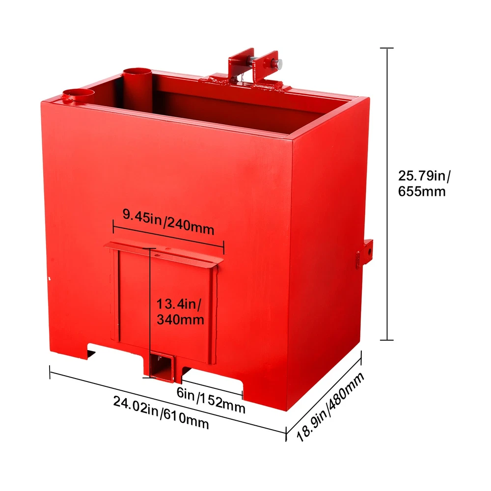 Tractor Ballast Box The ballast box is designed for 3-point Category 1 tractors and fits various machinery models. Made from heavy-duty steel with a double-layered paint finish, it supports up to 800lbs. The 4.3ft³ storage holds sand, concrete, cement, steel, and more, with a sliding door for easy emptying. This tractor ballast features a dual-layer protective finish: an inner rust-resistant coating provides robust protection for the steel base, while the outer glossy topcoat delivers a smooth, polished surface for enhanced durability and aesthetics. This tractor ballast box is equipped with widened handles on both sides, allowing for flexible rotation. The lifting angle is unrestricted, making it suitable for both single-person and multi-person use, ensuring easier and more convenient handling. Addressing on-the-go tool organization challenges, the integrated 3-inch diameter vertical tube enables secure, upright storage of agricultural tools, avoiding tilting and simplifying field accessibility. Designed with a square structure for maximum capacity, our tractor weights accommodate diverse materials—sand, concrete, cement, steel—and excel in multiple scenarios: farmlands, construction sites, spring/summer planting, autumn harvesting, and winter snow/ice removal operations. Features & Details Outstanding Stability: Our ballast box is constructed with a heavy-duty, sturdy steel structure, optimized welding techniques, and double-layered thickened paint, effectively reducing the risk of tipping. It ensures security and reliability under various challenging work conditions 800LB High Load Capacity: This tractor ballast box supports up to 800lbs, significantly improving tractor balance and avoiding tipping caused by uneven front-to-rear weight distribution. It meets the demands of various heavy-duty tasks Installation Made Easy: Equipped with a standard 3-point hitch system and detailed installation instructions, users can easily complete the installation without the need for professional tools, saving valuable time and ensuring an effortless experience Convenient Sliding Door: The unique sliding front door allows users to easily adjust the weight of the items inside the box, enabling quick unloading and improving operational efficiency Wide Compatibility and Versatility: Compatible with direct tractor 3-point hitch connection. If using a quick hitch adapter, check for compatibility. It serves efficiently as a ballast box and can also function as a tool storage box, helping to keep the workspace neat and organized SHIPPING ABOUT US PAYMENT RETURNS CONTACT WARRANTY Welcome to our eBay store. As a leading and emerging company in manufacturer and exporting business, we are specialized in Business and Industrial Products, Sporting Goods, Pet Products, Home and Garden products for more than 10 years. We believe that it is our vision and mission to provide innovative products with best service and competitive price to satisfy you. Our goal is to make sure that you can find exactly what you are looking for and make it easy for you to place your orders. We accept PayPal payment,PayPal Credit,Credit card or debit card and so on. Payment should be completed within 4 (Four) days of auction closing. Or unpaid dispute will be filed for closing auction. We will leave a positive feedback immediately after payment is received. We appreciate a positive feedback as much as you do. If for some reason there is any issue with the purchase, please contact us prior to leaving feedback, we will be glad to work together and provide a satisfying solution. Please be aware that PO Box cannot receive items, please DO NOT fill in the PO Box address. DELIVERY DAYS: 3-7 BUSINESS DAYS 3 BUSINESS DAYS SHIPPING OUT SHIP FROM CA & TX & NJ & GA & NC &OR WAREHOUSE California Warehouse: City of Industry, CA Texas Warehouse : Houston, TX New Jersey Warehouse : Perth Amboy, NJ New York State Warehouse: Perth Amboy, NJ Georgia Warehouse: Austell,GA North Carolina Warehouse: Grove NC Oregon Warehouse: AIRPORT WAY Portland,OR All of our items are backed with a 30-day return policy. We ensure all our items are new and in excellent condition prior to shipping. In case you receive the item that is not to the standards above, please contact us via e-Bay messages. All returns must be in new original condition as received and should be shipped with delivery confirmation Please note that all returns must be pre-approved by us. Unauthorized returns will not be accepted. If you need to return, please check twice to confirm the item not work and contact our customer service representative, let us know the detailed problem and send us some pictures for confirmation. We ONLY accept returns with original package. Please make sure that item has NO man-made sabotage. Used items will not be accepted for return. Email Customer Support: 9:00am-2:00am PST Sunday-Friday All emails will be responded to within 12-24 hours This item comes with 12 months Warranty from the date of customers purchased it. Special circumstances will be listed clearly in the listing. If your item has been damaged in transit or become faulty in warranty period, please email us with pictures or video to show the problem. Please do check everything carefully after you received the parcel, any the damage except DOA (Dead-On-Arrival) would not be covered if it's your fault. Replacement products are provided with the same warranty as the returned products. Tractor Ballast Box The ballast box is designed for 3-point Category 1 tractors and fits various machinery models. Made from heavy-duty steel with a double-layered paint finish, it supports up to 800lbs. The 5ft³ storage holds sand, concrete, cement, steel, and more, with a sliding door for easy emptying. This tractor ballast features a dual-layer protective finish: an inner rust-resistant coating provides robust protection for the steel base, while the outer glossy topcoat delivers a smooth, polished surface for enhanced durab