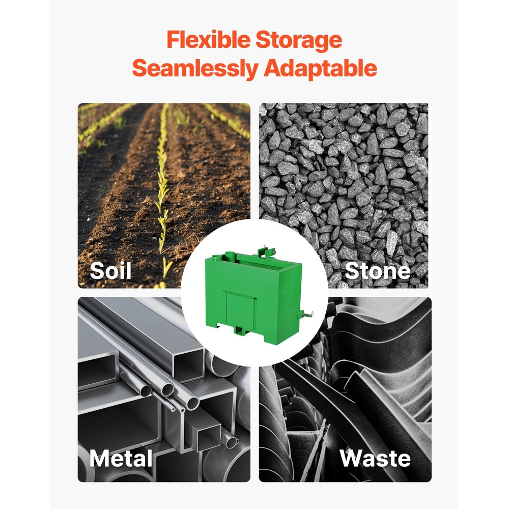 Tractor Ballast Box This 800-pound ballast box boosts tractor stability with heavy-duty steel construction, a 4.3ft³ container, and 3" pipe racks for sand/concrete storage. Its sliding door allows weight adjustment while the universal 3-point hitch fits Kubota/John Deere models, ideal for your farmwork needs. Exceptional Convenience All Accessories Included Expert Powder Coating Keep Tractor Balanced Tough Welded Construction Ideal for 3-Point Cat. 1 Key Features Smelting Experience flawless connection and exceptional stability. This ballast box is seamlessly compatible with your 3-point Category 1 tractor, making your work more efficient and effortless. Professional Welding Enjoy the convenience of thoughtful design. Our tractor ballast features a sliding front door and a 2-inch receiver, allowing for easy handling and smooth operations, making each task simple and efficient. Cutting All the essential accessories are included, ensuring an effortless experience as you complete every task with ease. This makes your work more efficient and less stressful. Features & Details Superior Quality and Stability: Our ballast box is constructed with heavy-duty, robust steel, optimized welding techniques, and double-layered thickened paint, significantly enhancing stability during operation. It effectively reduces the risk of tipping, ensuring security and reliability under various demanding work conditions 800LB Load Capacity: This tractor ballast box supports up to 800lbs, improving tractor balance and avoiding tipping caused by uneven front-to-rear weight distribution. It features a 4.3ft³ large storage space and a 3-inch wide pipe rack for holding heavy items like sand and concrete, making it ideal for farm and construction site needs. Even under heavy loads, it maintains excellent stability Installation Made Easy: Installation is a breeze with just a few simple steps! Equipped with a standard 3-point hitch system, it comes with detailed installation instructions and diagrams. No professional tools are required, saving you valuable time. The complete set of installation accessories ensures a quick setup on farms or construction sites, significantly enhancing user convenience. Each product includes a full accessory list, including pins and nut locks, for effortless installation Convenient Design: Our tractor weights feature a sliding front door that makes it easy to open and empty when weight reduction is needed. It also includes integrated pipe racks for storing tools Compatibility and Versatility: This tractor ballast weight is compatible with popular brands like Kubota and John Deere, ensuring wide adaptability. It serves not only as an efficient ballast box but also as a tool storage box, helping you keep your workspace clean and organized SHIPPING ABOUT US PAYMENT RETURNS CONTACT WARRANTY Welcome to our eBay store. As a leading and emerging company in manufacturer and exporting business, we are specialized in Business and Industrial Products, Sporting Goods, Pet Products, Home and Garden products for more than 10 years. We believe that it is our vision and mission to provide innovative products with best service and competitive price to satisfy you. Our goal is to make sure that you can find exactly what you are looking for and make it easy for you to place your orders. We accept PayPal payment,PayPal Credit,Credit card or debit card and so on. Payment should be completed within 4 (Four) days of auction closing. Or unpaid dispute will be filed for closing auction. We will leave a positive feedback immediately after payment is received. We appreciate a positive feedback as much as you do. If for some reason there is any issue with the purchase, please contact us prior to leaving feedback, we will be glad to work together and provide a satisfying solution. Please be aware that PO Box cannot receive items, please DO NOT fill in the PO Box address. DELIVERY DAYS: 3-7 BUSINESS DAYS 3 BUSINESS DAYS SHIPPING OUT SHIP FROM CA & TX & NJ & GA & NC &OR WAREHOUSE California Warehouse: City of Industry, CA Texas Warehouse : Houston, TX New Jersey Warehouse : Perth Amboy, NJ New York State Warehouse: Perth Amboy, NJ Georgia Warehouse: Austell,GA North Carolina Warehouse: Grove NC Oregon Warehouse: AIRPORT WAY Portland,OR All of our items are backed with a 30-day return policy. We ensure all our items are new and in excellent condition prior to shipping. In case you receive the item that is not to the standards above, please contact us via e-Bay messages. All returns must be in new original condition as received and should be shipped with delivery confirmation Please note that all returns must be pre-approved by us. Unauthorized returns will not be accepted. If you need to return, please check twice to confirm the item not work and contact our customer service representative, let us know the detailed problem and send us some pictures for confirmation. We ONLY accept returns with original package. Please make sure that item has NO man-made sabotage. Used items will not be accepted for return. Email Customer Support: 9:00am-2:00am PST Sunday-Friday All emails will be responded to within 12-24 hours This item comes with 12 months Warranty from the date of customers purchased it. Special circumstances will be listed clearly in the listing. If your item has been damaged in transit or become faulty in warranty period, please email us with pictures or video to show the problem. Please do check everything carefully after you received the parcel, any the damage except DOA (Dead-On-Arrival) would not be covered if it's your fault. Replacement products are provided with the same warranty as the returned products. Tractor Ballast Box This 800-pound ballast box boosts tractor stability with heavy-duty steel construction, a 5ft³ container, and 3" pipe racks for sand/concrete storage. Its sliding door allows weight adjustment while the universal 3-point hitch fits Kubota/John Deere models, ideal for your farmwork need