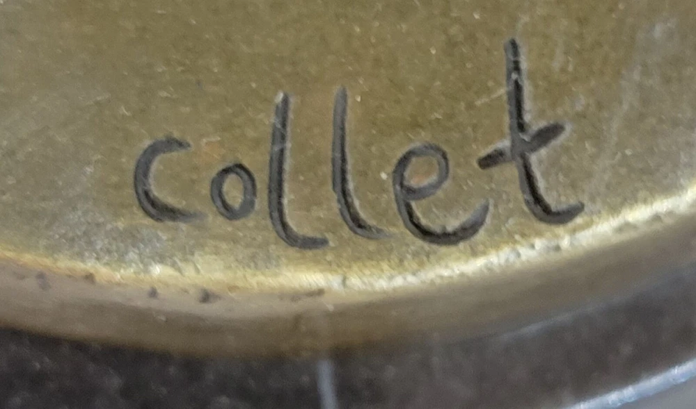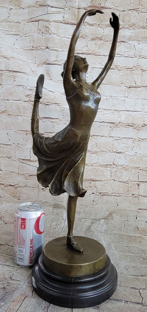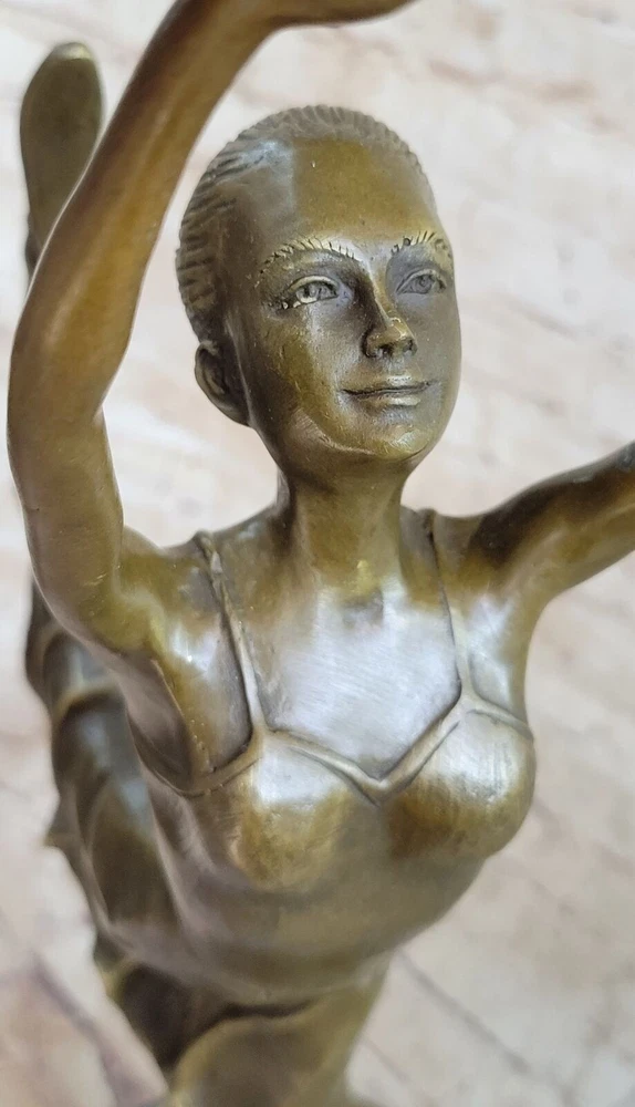 Condition : This sculpture is in perfect condition.nbsp; Bronze Dimensions with Marble Base: Height 19" x Width 10" Marble size: Diameter 6.5" Height without base: 17.5" Weight : 12 LBS Inventory:31YCN1398331 This captivating bronze sculpture portrays the beautiful ballet dancer Natacha Nattova, capturing the grace and elegance of her performance that so enamored a Prussian Prince. As you gaze upon the sculpture, the depth and warmth of the patina evoke a sense of calmness and tranquility, as if it were a snapshot of a lullaby frozen in time. With meticulous attention to detail, the sculpture depicts Natacha delicately pointing her toe, turning her body with grace, and even positioning her fingers in a polite manner. Her ballet dress, adorned with roses on the bodice and flowing at the hips, adds to the dimension and fluidity of her movement. From her ballet slippers criss-crossing around her ankles to her finely tied hair and delicate facial features, every aspect of Natacha's portrayal exudes beauty and charm. It's no wonder the prince was captivated by her presence. Signed by the artist Collet and mounted on a round marble base, this bronze sculpture is a timeless masterpiece that captures the essence of grace and romance in ballet. COLLET BALLERINA DANCER SIGNED BRONZE STATUE FIGURE HOT CAST SCULPTURE SALE Video will open in a new window Using the eBay App? Paste link into a browser window: [isdntekvideo]