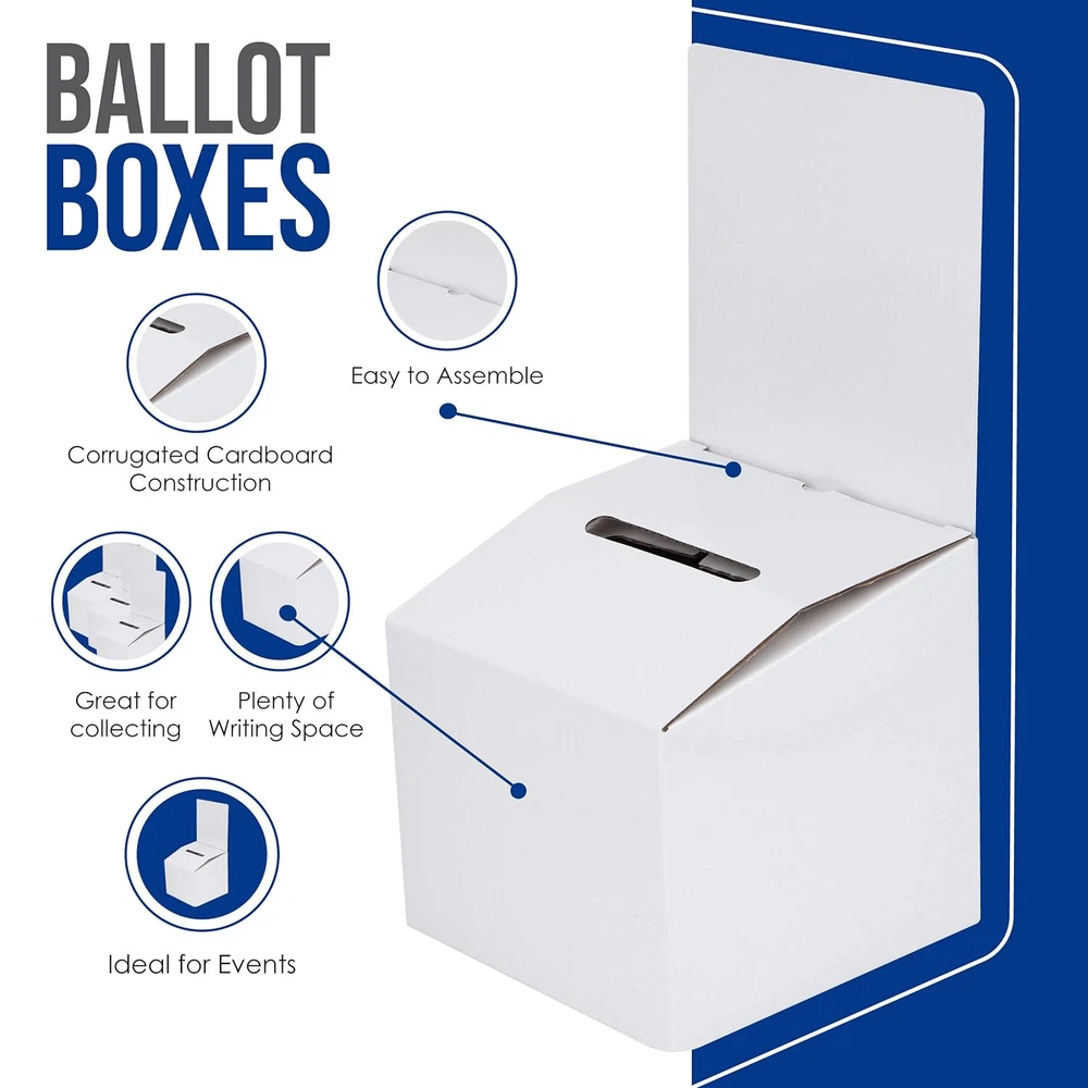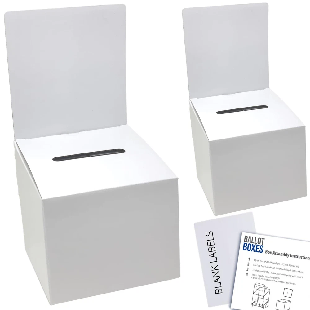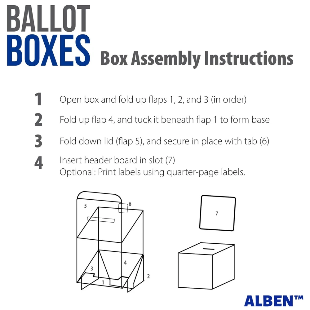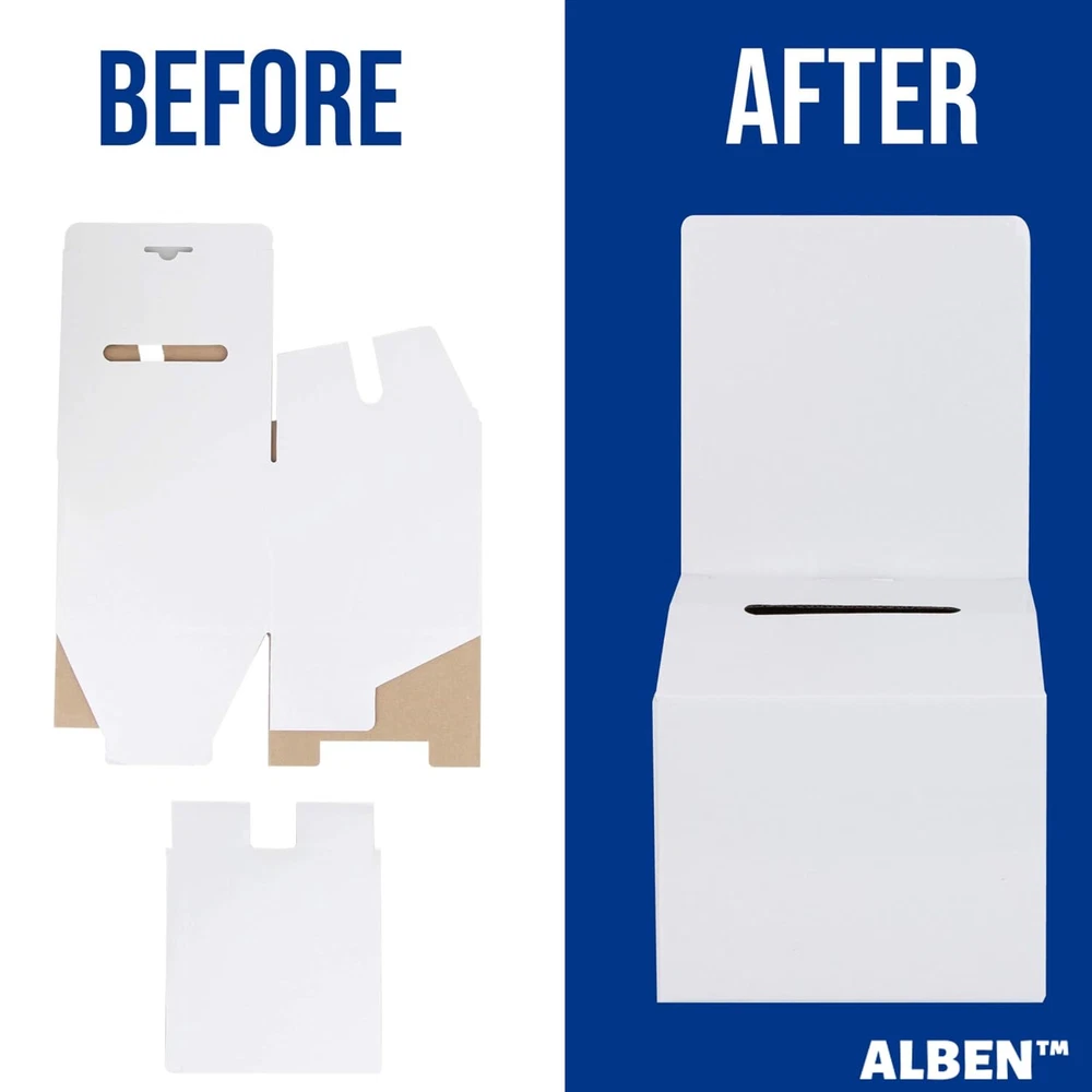 High Quality Value Pack–Alben’s Cardboard Ballot Box with Header Set includes 2 Ballot Boxes cardboard design with a glossy finish and ideally sized measuring 6 x 6 x 6 inches with a 6 x 6-inch header and a 3 1/2 x 1/2-inch slot 4 Blank Labels for Customization-Our large raffle box set can be customized using the included printable balot boxes labels (6 x 4 inches) or with your own art materials Easy Assembly-Our raffle ticket box cardboard set quickly folds into a ballott box shape no glue or tap required; Each small ballot box cardboard set is strategically made with an inner corrugated cardboard and a white outer smooth glossy finish making these voting boxes lightweight yet sturdy and durable Multipurpose-Our donation box cardboard set is ideal as a voting box, fundraiser box, cardboard donation box, raffle ticket boxes, cardboard suggestion box, contest entry box, tip box card box for wedding reception and more Warranty–We ensure that our cardboard donation boxes for fundraising will meet your expectations and offer returns no questions asked; If you have issues, do not hesitate to contact us and we will be more than happy to ensure you have a positive experience while using our raffle boxes 2 pack set Product Description MULTIPURPOSE Our ballot box is ideal as a: voting box fundraiser box suggestion box contest entry box raffle box. and more! EASY ASSEMBLY Our raffle ticket box cardboard set quickly folds into a ballot box shape, with no glue or tape required. Each small ballot box cardboard set is strategically made with inner corrugated cardboard and a white smooth glossy finish making these voting boxes lightweight yet sturdy and durable. INCLUDES BLANK LABELS FOR CUSTOMIZATION Our large raffle box set can be customized using the included printable ballot box labels (6 x 4 inches) or with your own art materials. Product Specifications Ballot Box Dimensions 6" x 6" x 6" Removable Header Dimensions 6" x 6" Slot Dimensions 3 1/2" x 1/2" Included Label Dimensions 6" x 4"