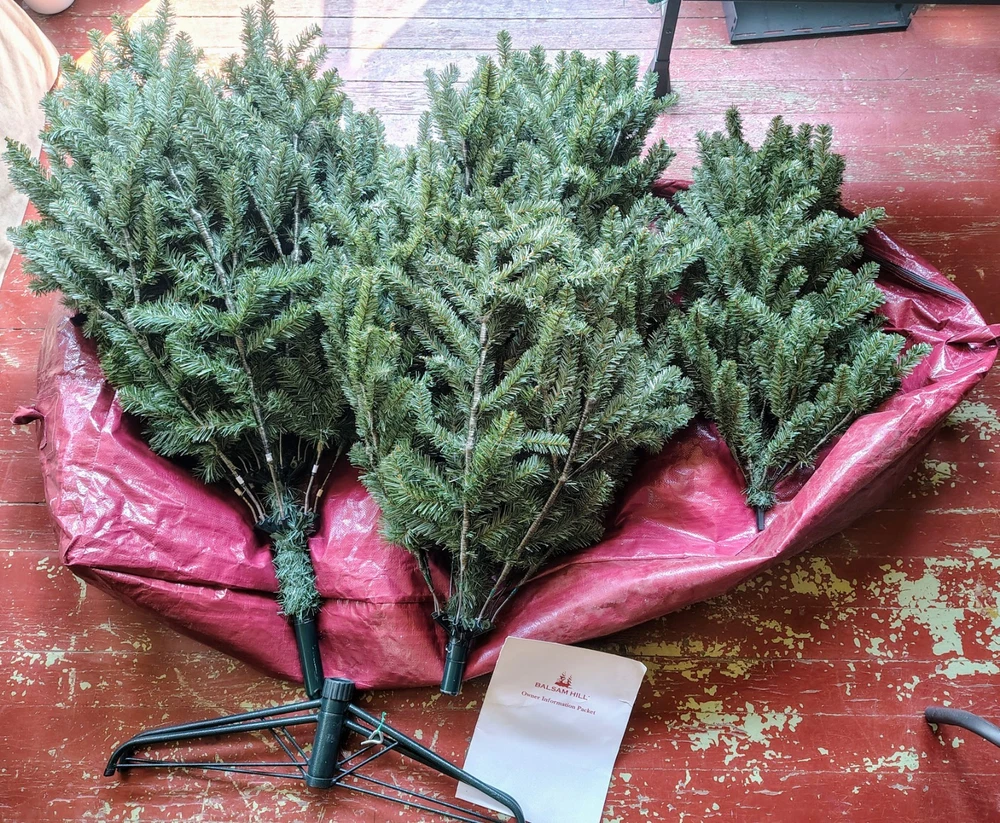 This is an extremely well made Balsam Hill Artificial Christmas Tree. It's been used twice, being disassembled and stored inside the included storage bag each time. The large, durable storage bag holds all 3 tree pieces, 5 light ropes, plus the base very easily. The branches effortlessly fold up and down. The design perfectly mimics an actual Blue Spruce pine tree. Your holiday visitors will be shocked to find that this is actually an artificial Christmas tree. Additionally, because of the high quality materials and construction, this tree makes a significantly smaller mess than a real tree. The tree ranges from 7 to 7.5 feet tall, depending on how you shape the top few branches and what you decide to top it with. I am also including 5 strings of Christmas lights that I've used to light the entire tree in the past. (3) Blue light strings, 25' each. (2) White light strings, 25' each. The retail price on the tree was $799 when I purchased it brand new. I'm asking $250 OBO. Unfortunately, due to the weight of everything included, and the ever increasing rates service rates of USPS and FedEx, I cannot offer free shipping. Any reasonable offers will be considered. Message me with any questions. Thanks for looking!