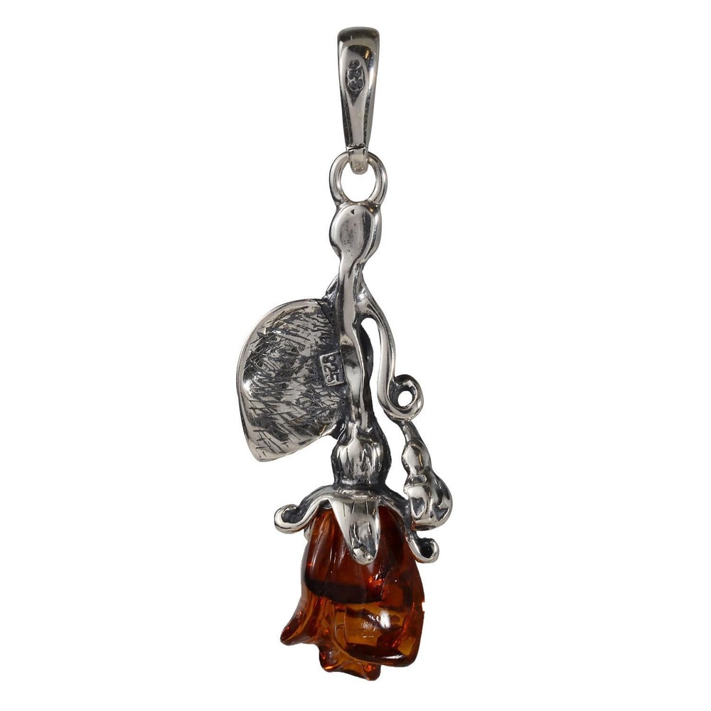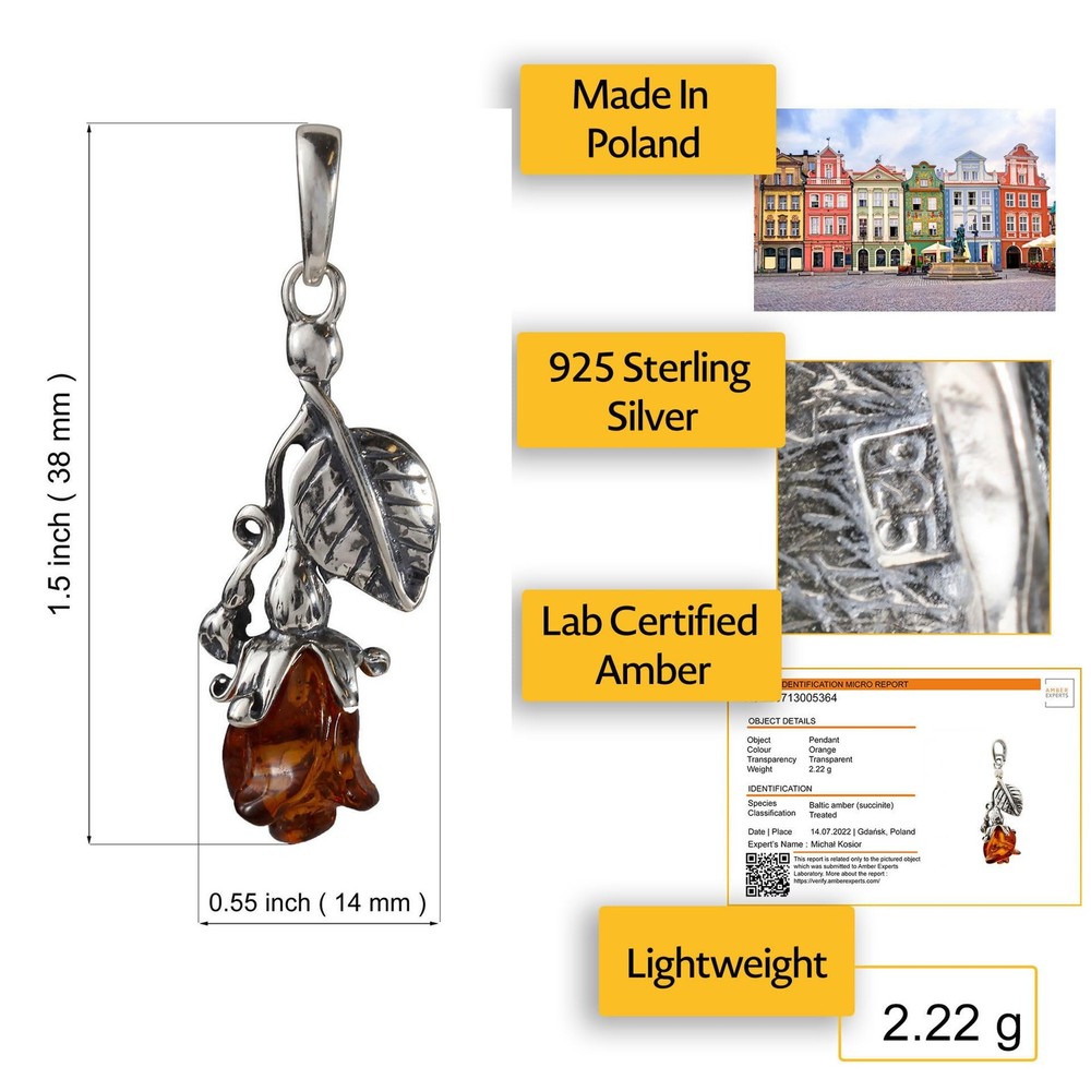 Our sterling silver and Baltic amber pendant "Rose" is designed with bright Baltic amber crafted in a shape of a rose with incredible precision and sense for details. "Rose" is based on timeless and elegant design that features endless tiny fossils being visible through the transparent surface of soft Baltic amber and is a perfect addition to your wardrobe, as well as an incredible accessory. It brings exemplar beauty to every woman's style, as "Rose" portrays softness, elegance and a will to invest in love and caring for others. That is why this amber pendant would make an excellent present idea meant for your significant other, your dearest friends, or your family. There is no such treasure as "Rose" elsewhere in the world, our pendant being handcrafted and completely unique, featuring multiple swirly and shiny petals of the flower rose that emphasizes one's sense of deeper connection and creating everlasting bonds. Sterling silver leaf hanging on the side of the pendant truly makes a beautiful addition to this masterpiece and completes the look. The leaf, along with the silver element surrounding it, holds the amber stone in place and gives it protection, as well as it makes "Rose" shine brighter. β GENUINE BALTIC AMBER. Size and weight: Total Length: 1.5"; Width: 0.55"; Stone Size: 0.4" x 0.3"; Total weight: 2.22 g; Chain Length: 18" β¨ INCLUDES STERLING SILVER CHAIN - For additional convenience, the silver pendant necklace for women hangs from an 18-inch chain with a delicate design. This allows easy placement around the neckline for an eye-catching accent to any ensemble. π 925 STERLING SILVER - The intricately designed setting of this stylish stone pendant is made from .925 sterling silver, giving it an air of quality and refinement that is hard to find in mass-produced pieces. π JEWELRY CERTIFICATE - Enjoy the peace of mind of knowing that your celestial pendant comes with a certificate ensuring its genuine Baltic amber origins and sterling silver craftsmanship π Ready for GIFT-GIVING - This gemstone necklace pendant makes the perfect gift on birthdays, weddings, graduation, Christmas, Mother's Day, Valentine's Day Make this season more special by gifting a loved one with this exquisite amber stone pendant presented in a lovely gift pouch. Show your loved one how much you care with these pieces of amber jewelry!