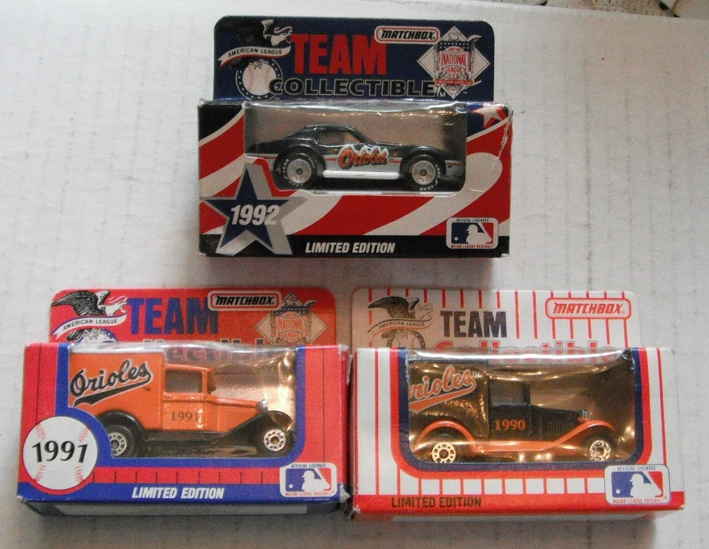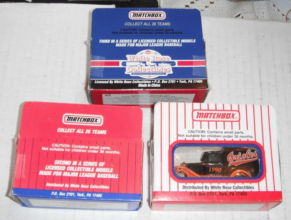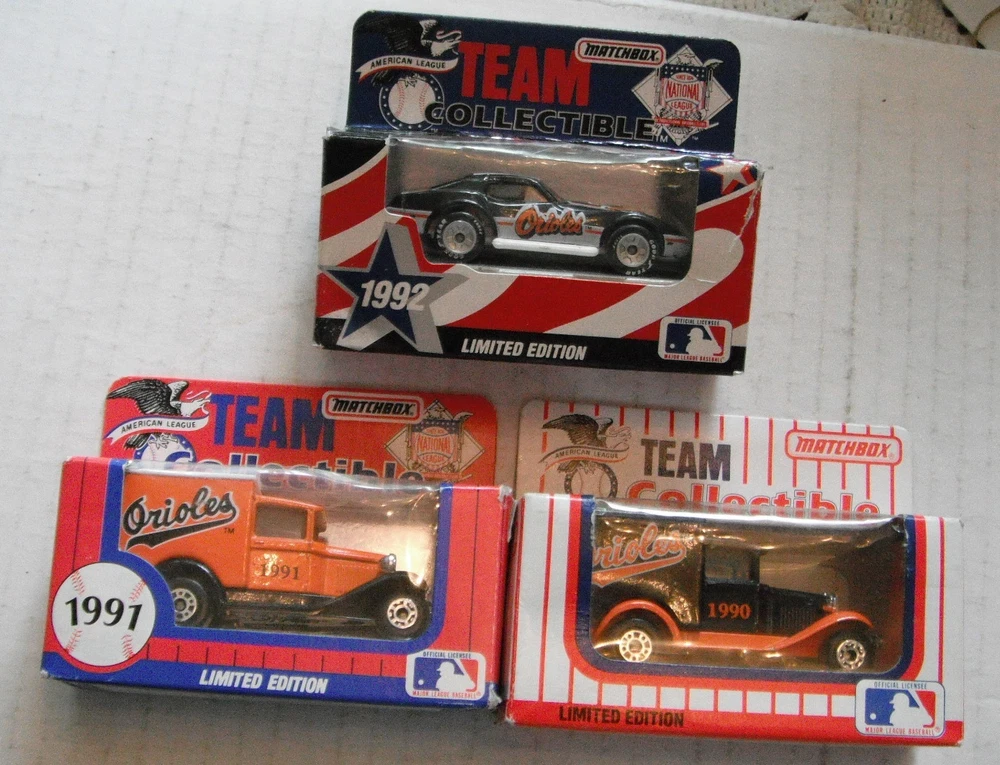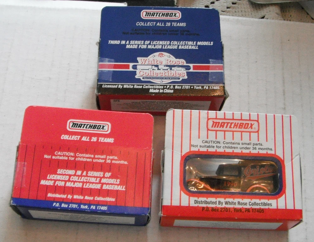 ITEM DESCRIPTION::--- -- -------.....3 Oriole vehicles for one price...... These Matchbox toy trucks are in excellent like new condition--looks like items were stored in the boxes over the year.. ..Nothing is broke or missing on truck and each comes with original display box, though boxes and plastic have some wear and tear at places...Items were made in Asia for White Rose Collectibles of York, Pa........I will break up the lot if you don't want all the items.....All items must be mailed.......................................... ---1990 model # 1 in series......Delivery truck is approx 2.875" long , 1.5 " high, 1.25" wide.....not sure of scale, but probably 1:80 or 1:90.....made in Macao.......box has lite wear and tape....no markings that this is first in series.... ---1991 model # 2 in series......Delivery truck is approx 2.875" long , 1.5 " high, 1.25" wide.....not sure of scale, but probably 1:80 or 1:90.....made in China.......box has wear and tape.....has 2" tear in plastic.....box marked second in series... ---1992 model # 3 in series......Corvette is approx 2.875" long , .875 " high, 1.25" wide.....not sure of scale, but probably 1:80 or 1:90.....made in China.......box has wear and tear and tape.....has 1.25" tear in plastic.....box marked third in series... *************SHIPPING COSTS---See calculator for cost based on buyer's location.*************************** --PAYMENT --due in 10 days and payable in US dollars........You can use the checkout page or wait for an invoice from me..If you want to combine items to save on shipping costs, you should wait for an invoice from me..Any questions--just send me an email...... --SHIPPING ...All shipments to and from us must go thru the US Postal Service..Will usually ship in 4 days and will normally combine (but not always) to save you money.... Having mailed thousands of packages over 40+ years, I know how to pack and will not cut corners to save a little postage...All items will be packed safely to try to avoid shipping damage....US shipping rates covers mailing to our 50 states only......I will not falsify customs documents on foreign sales, and the buyer must pay any import duties or taxes imposed by their home country on the importation of goods into the buyer's home country... --RETURNS ...I want the buyer to be happy with their purchases and allow a hassle free return privilege....Naturally, I expect you to return the same item in the same condition that I sent out....Normally, no postage or handling will be refunded...To ensure I get the same item back that I sent, I try to mark items (hidden), maintain pics, and copy centerfolds, etc..Kindly send me an email on your intent to return an item.. --POLICIES --postage, payment terms, sales tax, etc are my rules--please do not try to change them....State sales tax may be collected...