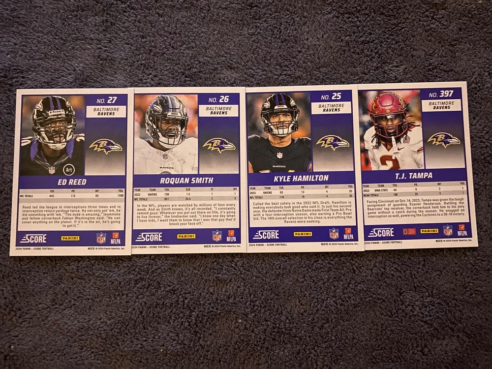 The product is a lot of four standard-sized 2024 Panini Score sports trading cards featuring the Baltimore Ravens football team. These cards are part of the base set manufactured by Panini for the 2024 season. Each card likely showcases different players or moments from the Ravens' season. This lot would be a great addition to any football card collection, especially for fans of the Baltimore Ravens looking to collect cards from the 2024 season.
