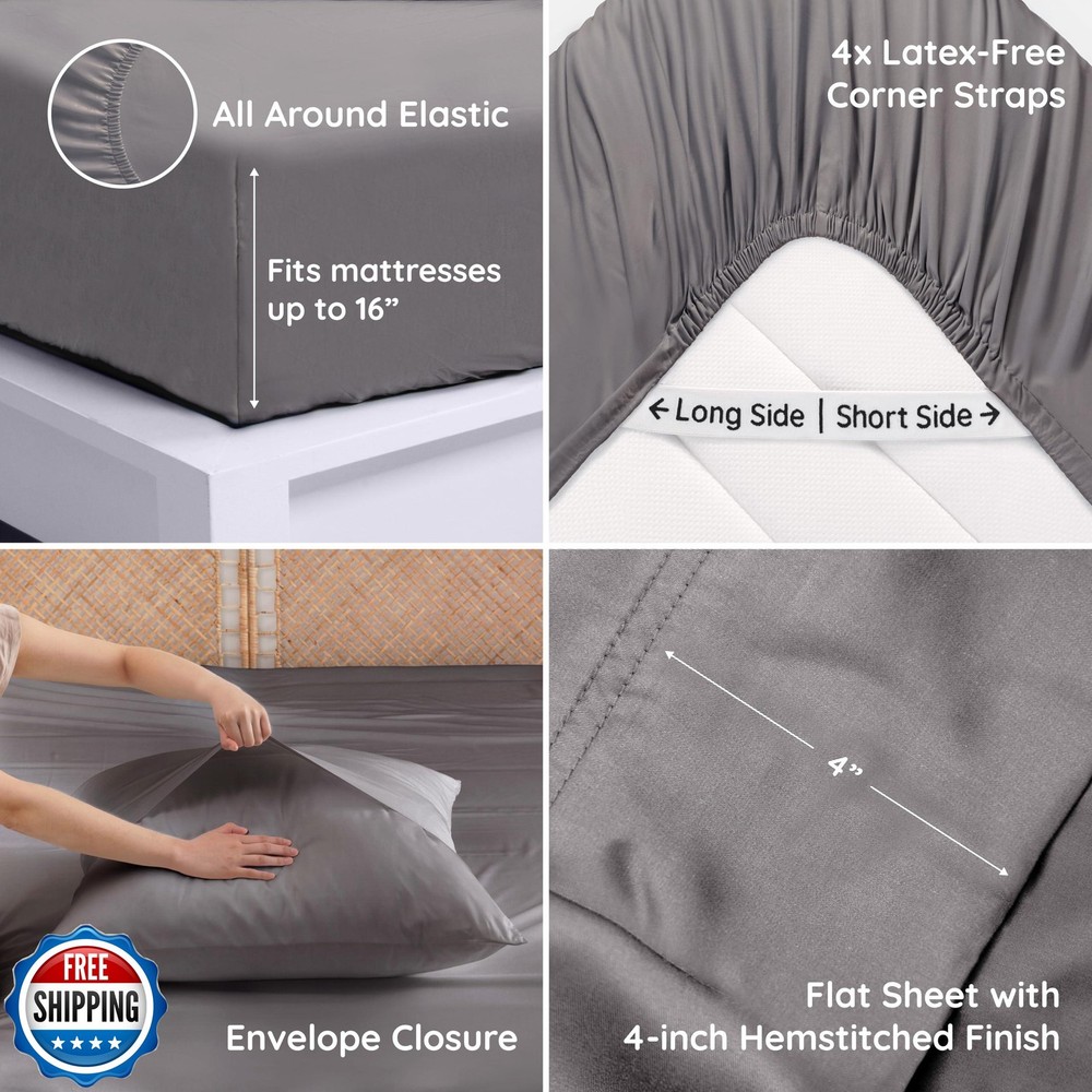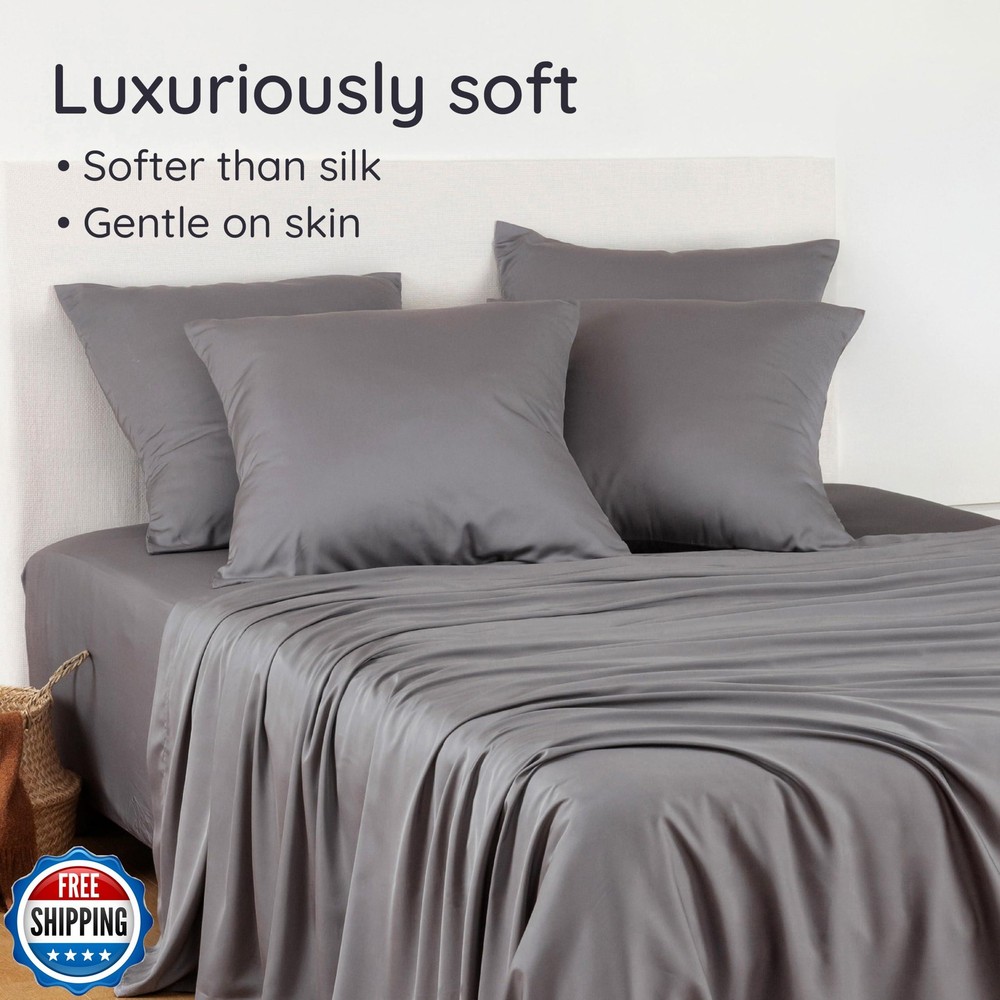 Bambaw King Sheets Set 4pcs, 100% Viscose Derived from Bamboo Sheets, King Size Cooling Sheets Set, Hotel Luxury Bed Sheets Set, Deep Pockets Fits Up to 16'' Mattresses, King Sheets Soft (Dark Gray) Features Imported 100% Viscose Derived from Bamboo: These 100% viscose derived from bamboo sheets king size deliver the purest, most natural luxury. Free from blends with other fabrics or synthetic materials, they are FSC and OEKO-TEX Standard 100 certified, ensuring they are sustainably sourced and as gentle on the environment as they are on your skin. Cooling Comfort: This king size cooling sheets set is designed with thermoregulating fabric that keeps your temperature perfectly balanced. Its breathable properties ensure you stay cool, dry and comfortable. Lightweight and airy, this cooling deep pocket king sheet set is ideal for hot sleepers and those prone to night sweats, delivering year-round comfort. Feel the Difference: Experience a soft sheet set that’s smoother than silk and softer than cotton. The fibers are designed to create a clean and cozy sleep environment for ultimate relaxation. Your Perfect Bedding Set: This 100% viscose derived from bamboo king sheets set includes 1 king fitted sheet (78" x 80"), 1 king flat sheet (108" x 102") and 2 king pillowcases (20" x 36"). The pillowcases feature a sleek 8" envelope closure flap for a polished look and a secure fit, while the flat sheet is finished with an elegant 4" hem. Stay in Place: This fitted sheet accommodates mattresses up to 16" thick, featuring a full elastic band around the edge for a snug and secure fit. Four latex-free corner straps, labeled with placement directions, make setup simple and ensure your sheet stays perfectly in place all night long. Effortless Care & Enduring Quality: Designed for easy maintenance, this sheet set is machine washable at low temperatures on a gentle cycle and tumble dryable on low. The fabric becomes softer with every wash, while resisting pilling and fading for lasting durability. With a 100% customer satisfaction commitment, our dedicated team is here to ensure your complete happiness. Shipping Free & Fast Shipping: We offer free shipping to most of the USA with a normal delivery time of 3-7 days. However, due to the current situation, additional delivery time (up to 3 weeks) may be required for some items. Alternative Carriers: We may use alternative carriers (e.g., USPS, FedEx, UPS) to ensure your package arrives safely and on time. Due to the use of multiple carriers, we are unable to provide a tracking number automatically. Handling Time: Orders are processed and shipped within 1-2 business days of receiving cleared payment. Shipping Restrictions: Shipping to Alaska, Hawaii, Puerto Rico, Guam, and other US territories may incur shipping charges or delivery restrictions. Please contact us before ordering, or your order can be refunded/cancelled. State Restrictions: Certain items may not be shipped to California due to state regulations. Contact for Tracking Updates: If you require tracking updates or have any concerns about the delivery of your order, please feel free to contact us, and we will be happy to assist you. Return Policy 30-Day Hassle-Free Returns: If you are not completely satisfied with your purchase, you can return the item for free within 30 days of receiving it for a full refund or exchange. Easy Return Process: Contact us, and we will provide you with a prepaid return shipping label and detailed instructions. No Restocking Fee: There are no restocking fees for returns. However, the buyer is responsible for return shipping costs if the return is not due to a seller"s error. Refund Processing: Refunds will be processed within 1 business day of receiving the returned item in its original condition. Feedback Your feedback is extremely important to us. We strive to provide the best products and customer service possible. If you are satisfied with your purchase, please take a moment to leave us a positive review. If you have any concerns or issues with your order, please contact us before leaving negative feedback. We are committed to resolving any problems and ensuring your satisfaction. Contact Us If you have any questions or concerns, please feel free to reach out to our customer support team. You can contact us through the eBay messaging system. We are available Monday to Friday, 9:00 am to 5:00 pm EST, and we will do our best to respond to your inquiry within 24 hours. Thank you for supporting our small family business!