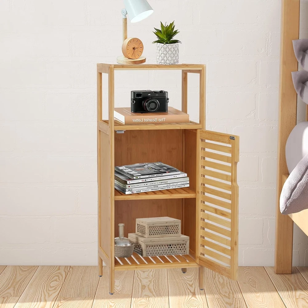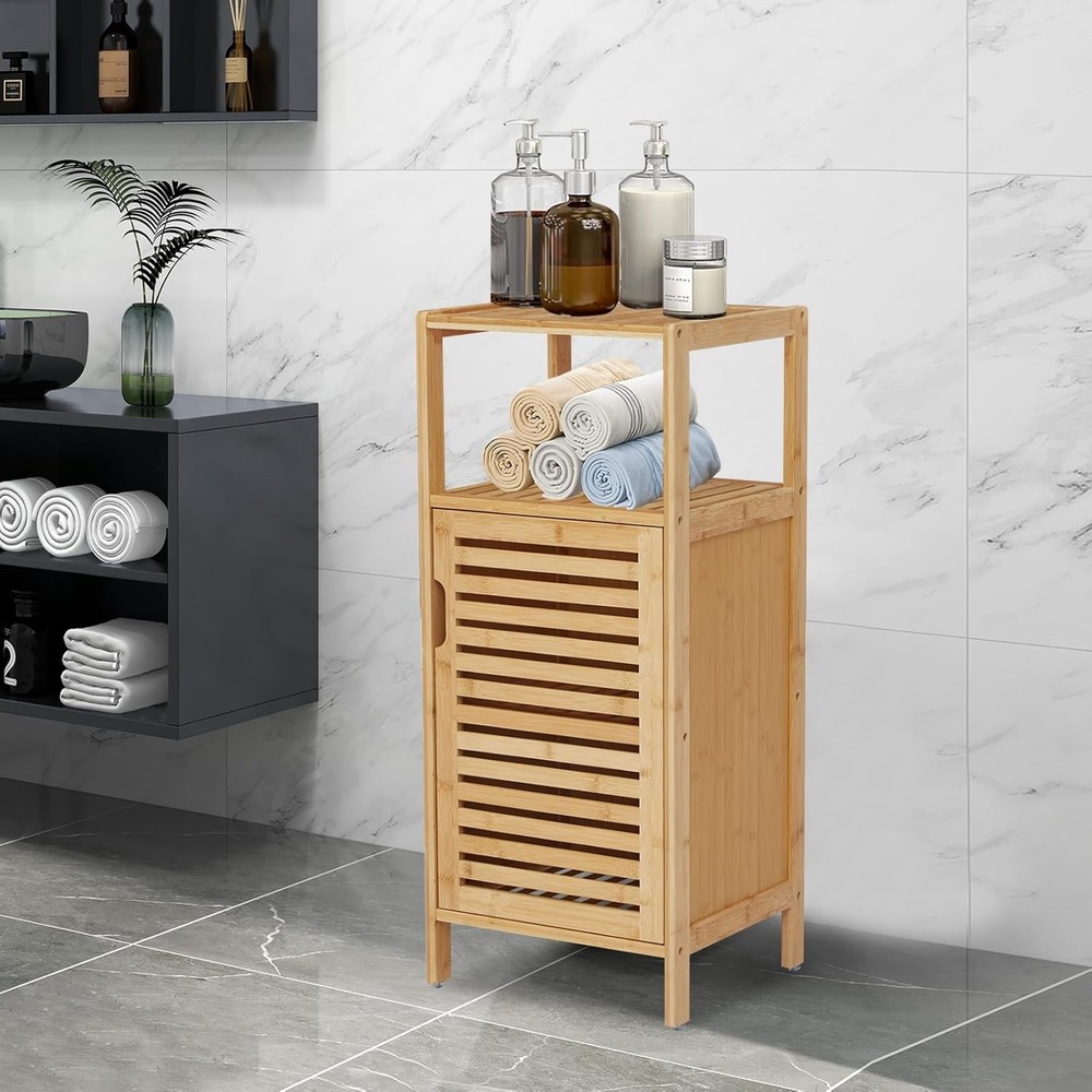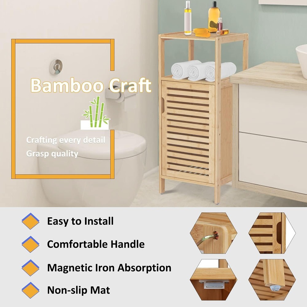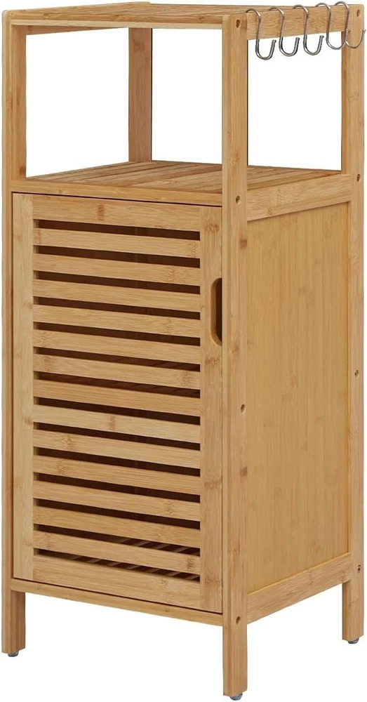 Product Description About this item Ideal for bathroom: The compact size of this bamboo bathroom cabinet makes it perfect for small spaces. Placed in the corner of your bathroom, the bathroom cabinet can well organize all kinds of bathroom supplies, such as towels, shower gel, toothcups, and other items to make your bathroom well organized. At the same time, this small cabinet for bathroom can also be placed in the bedroom, living room, and other places, suitable for a variety of scenes. Exquisite design: This small bathroom cabinet has a sophisticated design that blends well with a variety of decor styles. Both practical and aesthetically pleasing, it adds a sense of ambiance to the space while providing additional storage, especially for bathrooms with small spaces. Natural bamboo product: We have selected high-quality natural bamboo, carbonized and baked to make it stronger and more durable. The shelf is designed to last longer by using a specially crafted, eco-friendly paint. Easy daily cleaning: The processing of waterproof varnish makes your daily cleaning work simple and efficient. A dab with a rag will remove the stain. After daily use, please put the bamboo products in a ventilated and dry place to dry to extend their service life. Simple installation process: We have prepared matching installation tools for you so that you can easily and quickly complete the installation of this perfect product without the need to find out your toolbox. Its quality is far superior to similar products. If quality is your top priority, make sure you choose it! Simple installation process The installation package provides simple installation tools to help you complete the installation more quickly. Five hooks The five attached hooks can be used to hang small items such as towels, scarves, hats, keys and so on. You can freely fit them on either side, which adds extra storage space. Snug handle Hollow-out handle, reasonable use of product internal space, to create a more comfortable use experience. Removable non-slip pad Non-slip pad is removable, you can choose whether to install. bamboo bathroom cabinet No matter be kitchen, bathroom, sitting room, porch, entryway is applicable, improve the quality of life for your family quickly! Brand new quality bamboo cabinet! Classic and simple forest style, primitive log color, this is a beautiful and good quality bamboo storage cabinet. Two levels of open shelving, paired with two levels of separate storage with doors, allow you to place more items. The five attached hooks can be used to hang small items such as towels, scarves, hats, keys and so on. You can freely fit them on either side, which adds extra storage space. Specification: Dimension:12.8" x 14.4" x 33.9" Color: Nature Material: Bamboo Net Weight:15.7 lbs Weight Capacity of Each Layer:6.6lbs On Aug 7, 2025 at 01:36:39 PDT, seller added the following information: