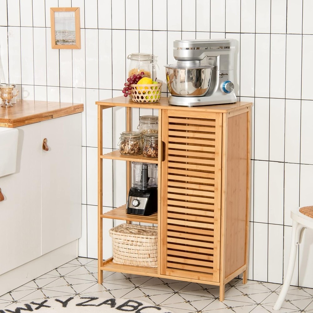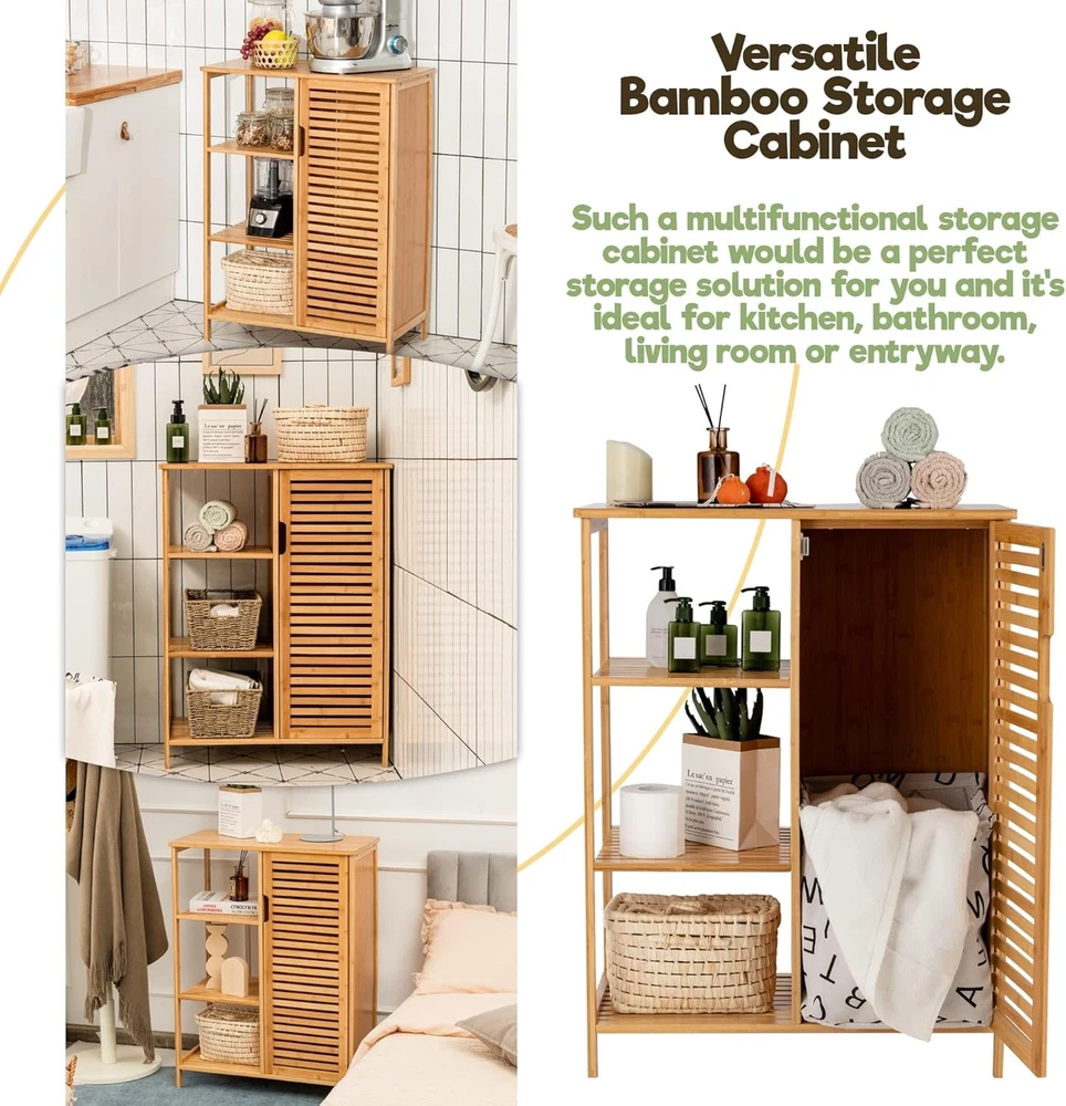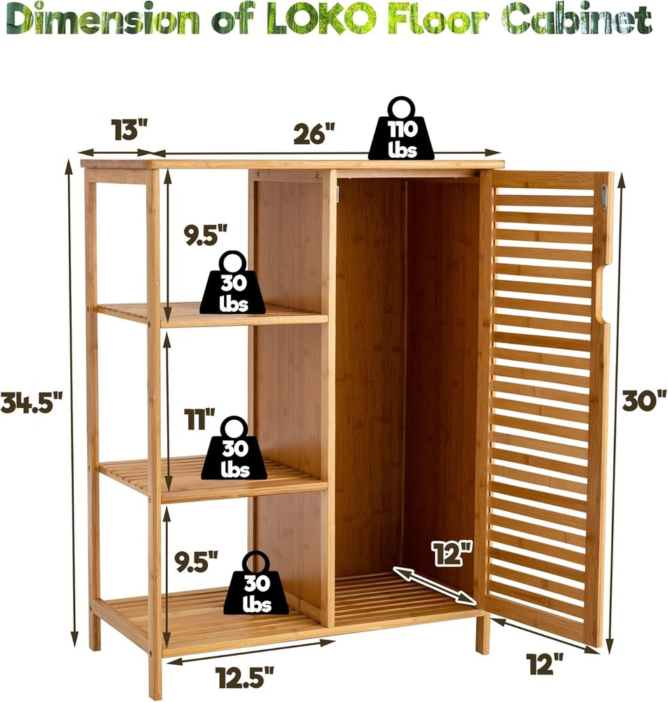 Product Description About this item • 【A Nice-looking Existence】We were totally astonished by the first sight of this bamboo cabinet and it was just gorgeous! Many of our customers told us that it looks pretty nice in their houses when they had it set up. And we’ve been more than happy to learn about this from our customers. We believe that you will love the way it looks. • 【Ample Storage Space Provided】Constructed of solid bamboo and MDF, the whole bamboo bathroom storage cabinet is made to give strong support to items on or in it. The top board is rather smooth while it could hold up to 110 pounds. The rest three open slatted shelves could each hold items within 30 pounds. The storage cabinet with door next to the three open shelves could hold tall items. • 【Put it Anywhere You Like】You could call it the way you like for its versatility. It works great in the bathroom thanks to its waterproof surface as a bathroom floor cabinet by holding the bath essentials. In the living room, it can be regarded as a bookshelf, giving you ample space for your beloved books. Are you looking for a shoe storage cabinet? Well, this one would also function well! • 【Assembly Required? Yes!】Assembly would not take too much time with the straightforward instruction and necessary hardware included. After you’ve set it up, you will love this floor cabinet! Start to earn compliment from your guests now with LOKO bamboo bathroom cabinet. • 【What LOKO Cares】We will exert great effort to make things right for you. Should you have any problems with this bamboo floor cabinet, just contact us at your convenience and we will offer you with feasible solutions. On Aug 14, 2025 at 20:51:27 PDT, seller added the following information: