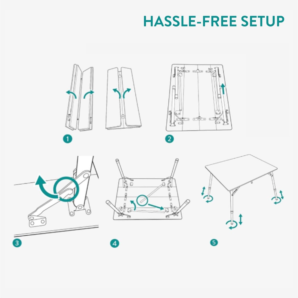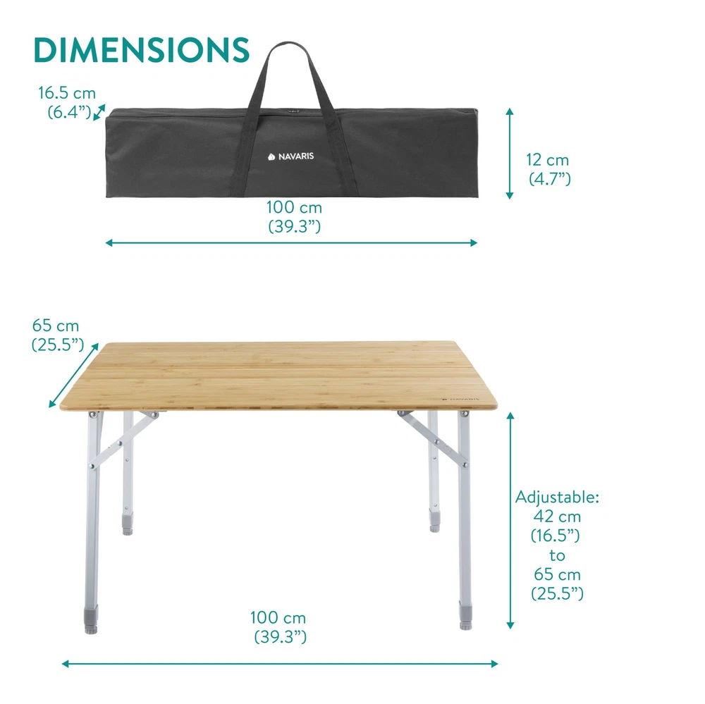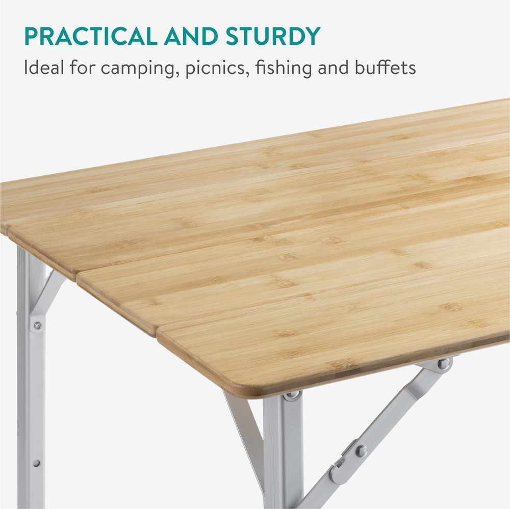 Looking for the right camping tables that fold up for easy transport? Our easy-fold-up adjustable height camping table is a durable and sturdy solution, with an included carry bag for extra convenience. This camping foldaway table has slanted adjustable aluminium telescopic legs so you can adjust to the height that works for you. It makes a great campervan table, fold up picnic table, and beach table — use it on all your outdoor adventures with confidence. Use a clean, soft and damp cloth for cleaning the table top. Remove dirt and sand from the table-legs after use. Otherwise, the height adjustability of the table-legs may be affected by dirt. Do not leave outside when it's raining. Highlights: - Outdoor-Friendly - Easy-Fold & Transport - Water-Resistant Top - Stable Design SPECIFICATIONS Measurements (full size): 31.5" x 25.6" x 23.6" (80 cm x 65 cm x 60 cm) Weight: 9.3 lb (4.2 kg) Maximum load: 66 lb (30 kg) Materials: Bamboo, aluminum Colors: Bamboo top, silver legs Product Info 1x Foldable bamboo camping table 1x Carry bag Perfect for Travel: Our portable camp table is the ideal camping and outdoor event accessory. It's easy to unfold and transport anywhere you need camping tables or a foldable picnic table. Adjustable Height: This bamboo table features smoothly height-adjustable telescopic legs so you can adjust the height to your needs. The table can be adjusted between 42 - 65 cm (16.5 - 25.6"). Strong and Stable: Our strong portable folding table can hold up to 30 kg (66 lb). The legs are designed with a slightly diagonal angle to ensure the table is stable and won't wobble. UV and Water-Resistant: This table is made to last in tough outdoor conditions. The top is water-resistant, so you can easily wipe away any water that splashes on it. It's also UV-resistant to ensure long days in the sun won't ruin its appearance. Foldable Convenience: This bamboo table is easy to fold down and pack away. With an included carrying case, it's incredibly easy to transport and bring wherever your adventures take you.