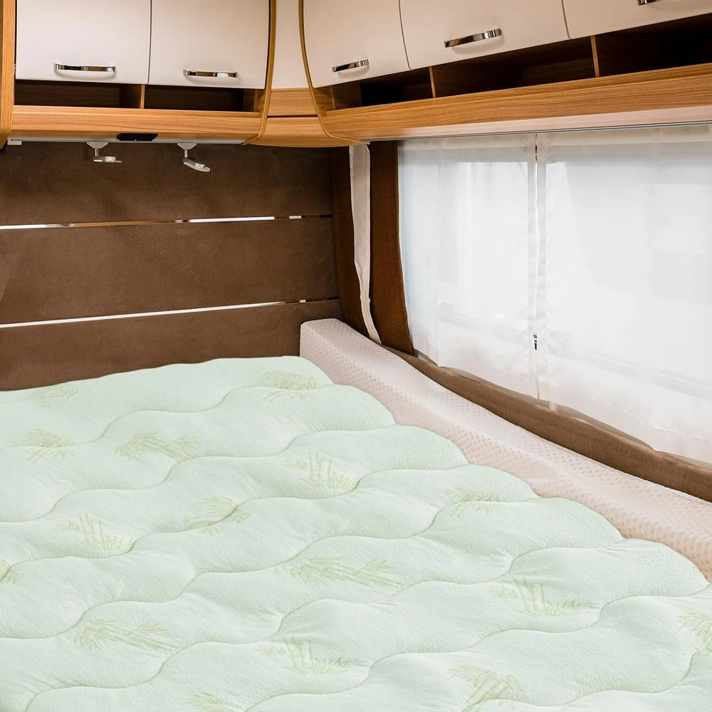 Product description Dual Layer Design: 1 inch soft fiber + 1 inch supportive foam. This short queen mattress topper uses 40% viscose made from bamboo and 60% polyester fabric, the composition is designed to prevent you from feeling stuffy and sweaty, and features 2 in 1 dual layer design, with a layer of support foam pad and a layer of squishy quilted polyester fiber which offers your the support during rest, along with the right softness and comfort, too. Unique Wavy Pattern: Measuring 60" wide by 75" long, the short queen mattress topper for RV camper with unique wavy pattern padding, viscose made from bamboo, which is skin-friendly to the touch and sleeping more comfortable. Keep your body stretched naturally, so you can easily enjoy a deep sleep. Adjustable Elastic Strap: Viscose made from bamboo foam RV short queen mattress topper, features non-slip backing material to prevent movement and 4 adjustable elastic bands secure the bed topper to the mattress eliminating the need for re-adjustments and avoid moving around, easily attach the topper to the mattress in your RV or camper. From camping to everyday living, this mattress topper will give you and your family a great night’s sleep. Eay to Use: Our mattress topper is easy to set up, all you have to do is open the package, unroll it, and please leave it in a well-ventilated place for 24-48 hours to allow the smell of new foam to dissipate and restore its shape and thickness. Fits in your RV or camper, it's the ideal solution for those seeking the comforts of home while on the go. Satisfaction Service: We will do our best to serve you until you are satisfied. If for any reason you are not satisfied with your viscose made from bamboo RV short queen mattress topper, please tell us directly. Handling & Delivery We offer Free Shipping on all orders! Your order will be shipped within 2 working days after receiving payment. In an unlikely event that your order is lost or damaged in transit, it is eligible for full refund or replacement. We ship to continental US address ONLY, we are unable to ship to PO Boxes or APO/FPO addresses. Return Policy If you are not satisfied when you receive your item, please contact us for a replacement or money back. If the item is defective, we will send you a replacement without any extra charge, or offer a full refund after we receive the defective item, but return shipping should be paid by buyer. All items qualify for returns within 30 days of receipt. Returned packages must be the original package. Contact us We will respond emails within 24 hours, within 36 hours on weekend.