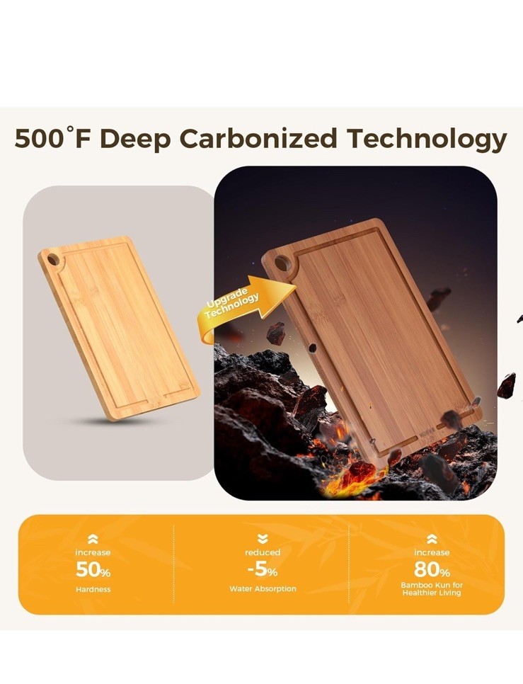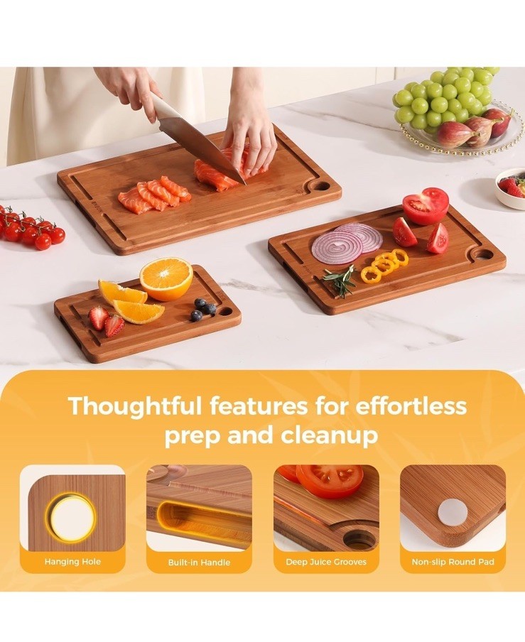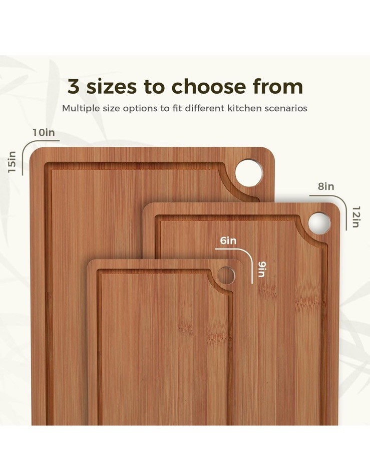 New item! 【Various Sizes to Meet Every Kitchen Need】 This three-piece bamboo cutting board set (15" x 10", 12" x 8", and 9" x 6") easily handles a variety of kitchen tasks, from chopping meat to slicing fruits and vegetables. The large cutting board makes it easy to chop larger ingredients, while the medium and small cutting boards are perfect for quick prep or serving cheese or charcuterie. 【Extra Durable and Eco-Friendly Construction】 These cutting boards are charred at 500°F (260°C) to absorb only 5% moisture. Made from sustainably sourced organic bamboo, which grows 30 times faster than hardwood, they are both environmentally friendly and durable. Cross-laminated for added toughness, these kitchen bamboo cutting boards resist warping and cracking with everyday use, enhancing their stability. 【Smart Features for Easy Use】 All bamboo cutting boards for kitchen feature built-in handles for easy lifting and dual-sided functionality—one side with a deep groove to contain liquids, the other with a wide groove for versatile prep. Non-slip pads and hanging holes ensure stability and space-saving storage, combining the practicality of wood cutting boards with modern convenience. 【Low Maintenance & Hygienic】 After use, simply rinse these cutting boards for kitchen with water—no complex cleaning needed. For maintenance, apply food-grade oil to form a protective layer, enhancing water resistance and preventing cracks. The natural bamboo surface stays smoother than typical wooden cutting boards, ensuring long-term hygiene.