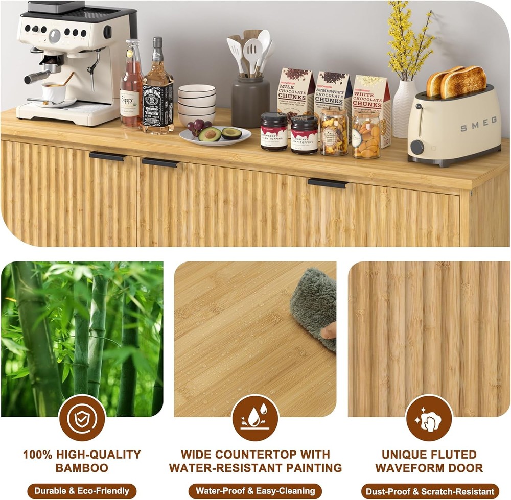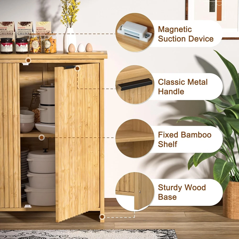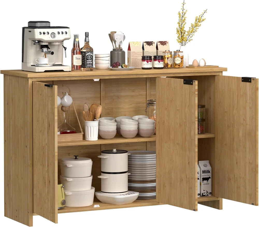 Product Description About this item Ample Storage Space with Fixed Shelf: This buffet sideboard is featured with a large shelf which make it easy to storage inside and organize the room. The flat table top provides you a spacious storage space to place decorations, collection or necessities, keep your room tidy and orderly. The textured fluted doors not only add privacy, but also keep the dust out. Feel free to place your belongings in our buffet cabinet High-quality Bamboo Material: This premium pantry storage cabinet is made of non-toxic, eco-friendly bamboo with waterproof coating which is durable and sturdy, you just need to clean it by wiping with a damp cloth for daily maintain. The high-quality bamboo ensures the durability of the cabinet. This pantry would be a perfect choice to your needs of finding something functional and decorative Minimalist & Practical Design: The fluted cabinet boasts a minimalist profile and doors with a unique hand-carved waveform panel, setting it apart from ordinary furniture pieces. The added magnetic suction devices ensure the doors close securely, making it convenient for you to easy access to stored items while maintaining a sleek and seamless appearance.This distinctive design adds a touch of sophistication and style to your living space, enhancing the overall aesthetic appeal of your home decor Versatile Multifunctional: The fluted sideboard can be widely used as a storage cabinet, coffee bar cabinet, accent storage cabinet and TV console as you need. All-match design indoor furniture fits the kitchen, living room, dining room, office. The multi-functional purpose makes it convenient for you to place it anywhere in your home Dimensions: Overall size: 47.7" L x 14" W x 31.6" H. Tabletop weight capacity: 132.2 LBS. Middle shelf weight capacity: 88.1 LBS. Bottom shelf weight capacity: 99.2 LBS On Aug 12, 2025 at 03:04:12 PDT, seller added the following information:
