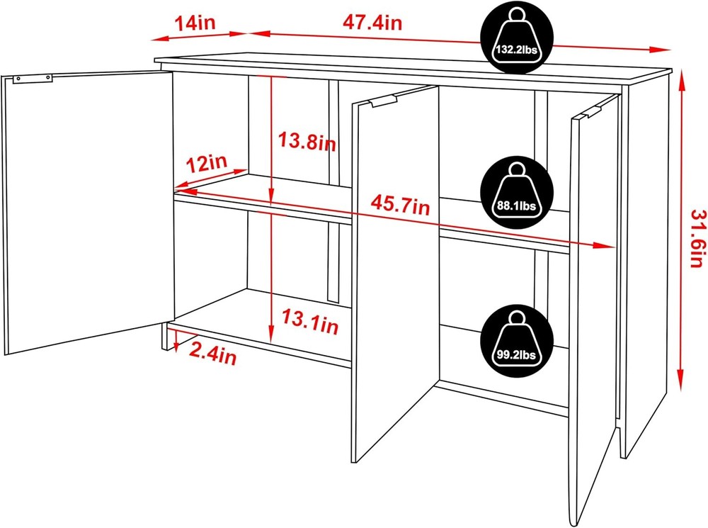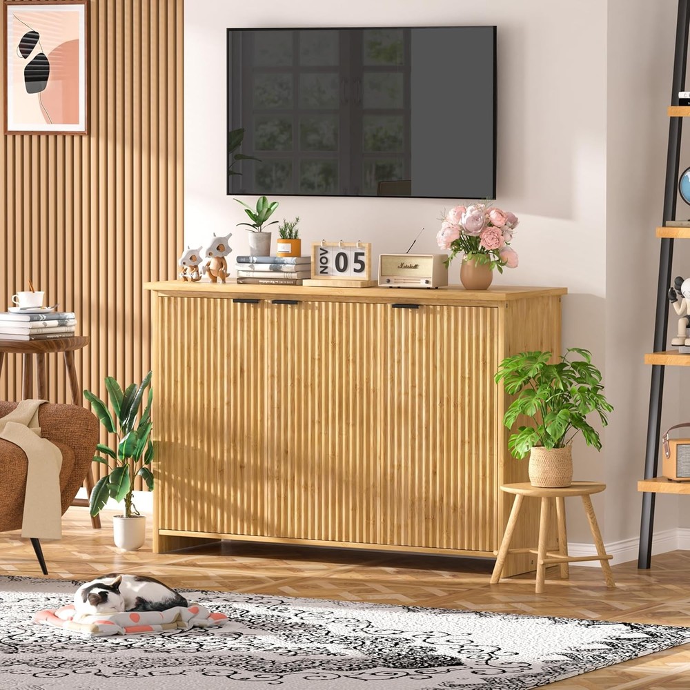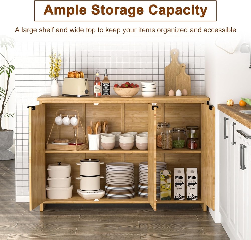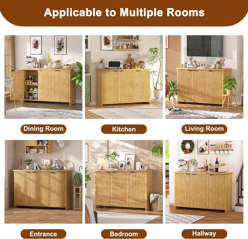 Product Description About this item Ample Storage Space with Fixed Shelf: This buffet sideboard is featured with a large shelf which make it easy to storage inside and organize the room. The flat table top provides you a spacious storage space to place decorations, collection or necessities, keep your room tidy and orderly. The textured fluted doors not only add privacy, but also keep the dust out. Feel free to place your belongings in our buffet cabinet High-quality Bamboo Material: This premium pantry storage cabinet is made of non-toxic, eco-friendly bamboo with waterproof coating which is durable and sturdy, you just need to clean it by wiping with a damp cloth for daily maintain. The high-quality bamboo ensures the durability of the cabinet. This pantry would be a perfect choice to your needs of finding something functional and decorative Minimalist & Practical Design: The fluted cabinet boasts a minimalist profile and doors with a unique hand-carved waveform panel, setting it apart from ordinary furniture pieces. The added magnetic suction devices ensure the doors close securely, making it convenient for you to easy access to stored items while maintaining a sleek and seamless appearance.This distinctive design adds a touch of sophistication and style to your living space, enhancing the overall aesthetic appeal of your home decor Versatile Multifunctional: The fluted sideboard can be widely used as a storage cabinet, coffee bar cabinet, accent storage cabinet and TV console as you need. All-match design indoor furniture fits the kitchen, living room, dining room, office. The multi-functional purpose makes it convenient for you to place it anywhere in your home Dimensions: Overall size: 47.7" L x 14" W x 31.6" H. Tabletop weight capacity: 132.2 LBS. Middle shelf weight capacity: 88.1 LBS. Bottom shelf weight capacity: 99.2 LBS On Aug 12, 2025 at 03:04:12 PDT, seller added the following information: