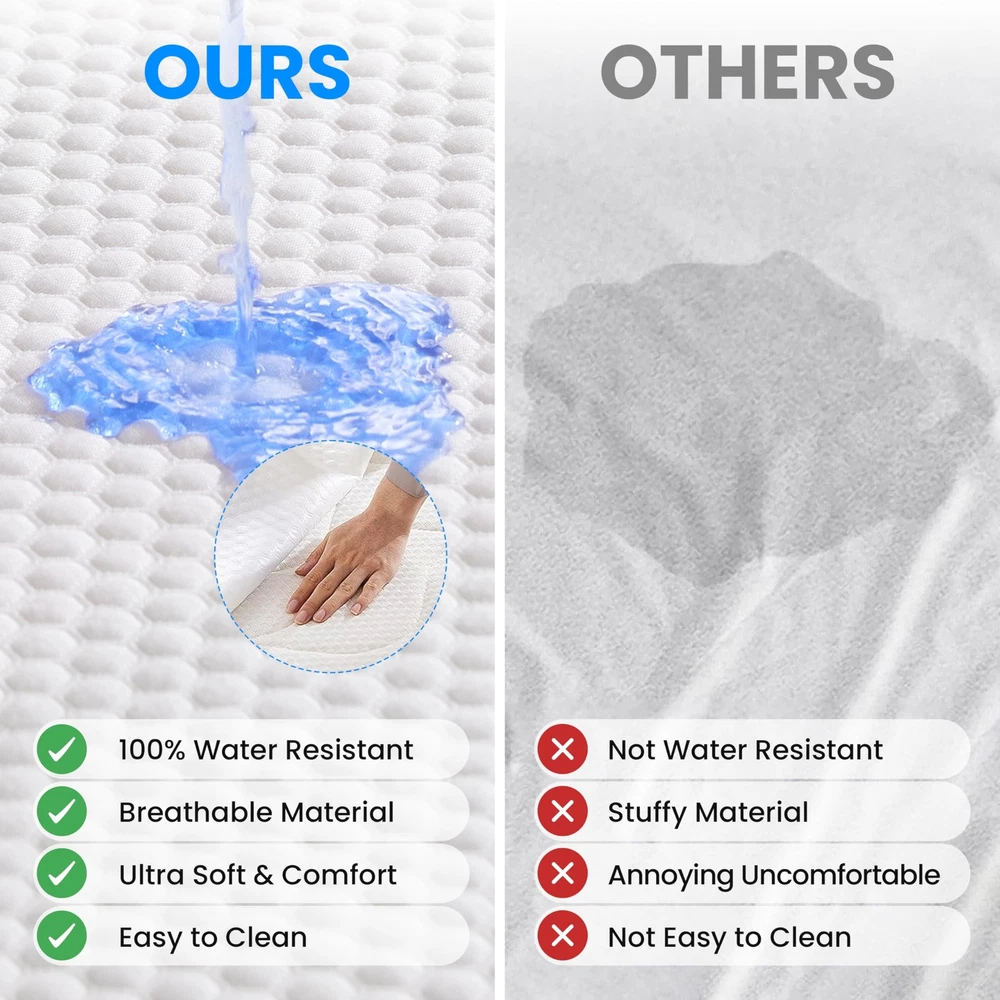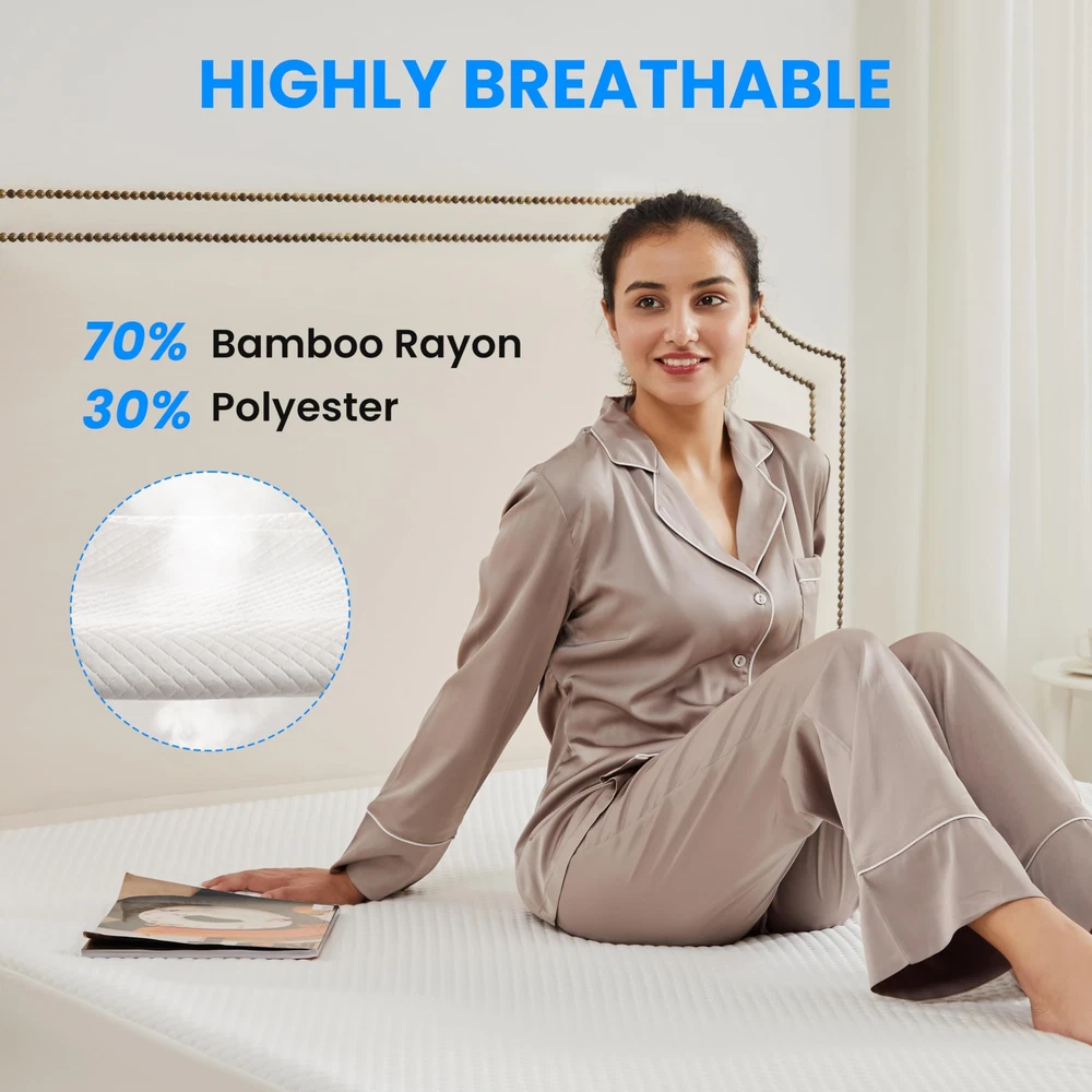 About this item 70% Bamboo Rayon,30% Polyester 100% waterproof protection: Feature an advanced water-resistant TPU membrane, which, through thousands of tests, not only upgraded to protect your treasured mattress from sweat, urine and stains, but also keeps breathable and noiseless in sleep time Breathable material: Made from natural & skin-friendly bamboo fabric, more cozy and breathable than cotton terry waterproof mattress cover.The bamboo fiber cover has good wicking property, wicks away moisture & regulates heat for an optimal sleeping Sleep in silence: Superb quilting of 3D air fabric produces no crinkling or rattlingsound as you move. Enjoy a peaceful, undisturbed sleep for families, new mothers, kids, pets and the elderly with the high quality and soft pad protector Deep pocket & all around elastic: With a deep pocket up to 19'', the mattress cover fits most regular mattresses, including memory foam, latex, and springs. The stretchable pockets make it easy to adjust, staying in place without slipping Machine washable: NO chemical bleach and no harmful substances.Just toss it into the machine and wash it in the cold water. Easy&convenient. Tips: do not iron, do not bleach, do not dry clean. Remains waterproof even after being machine-washed many times