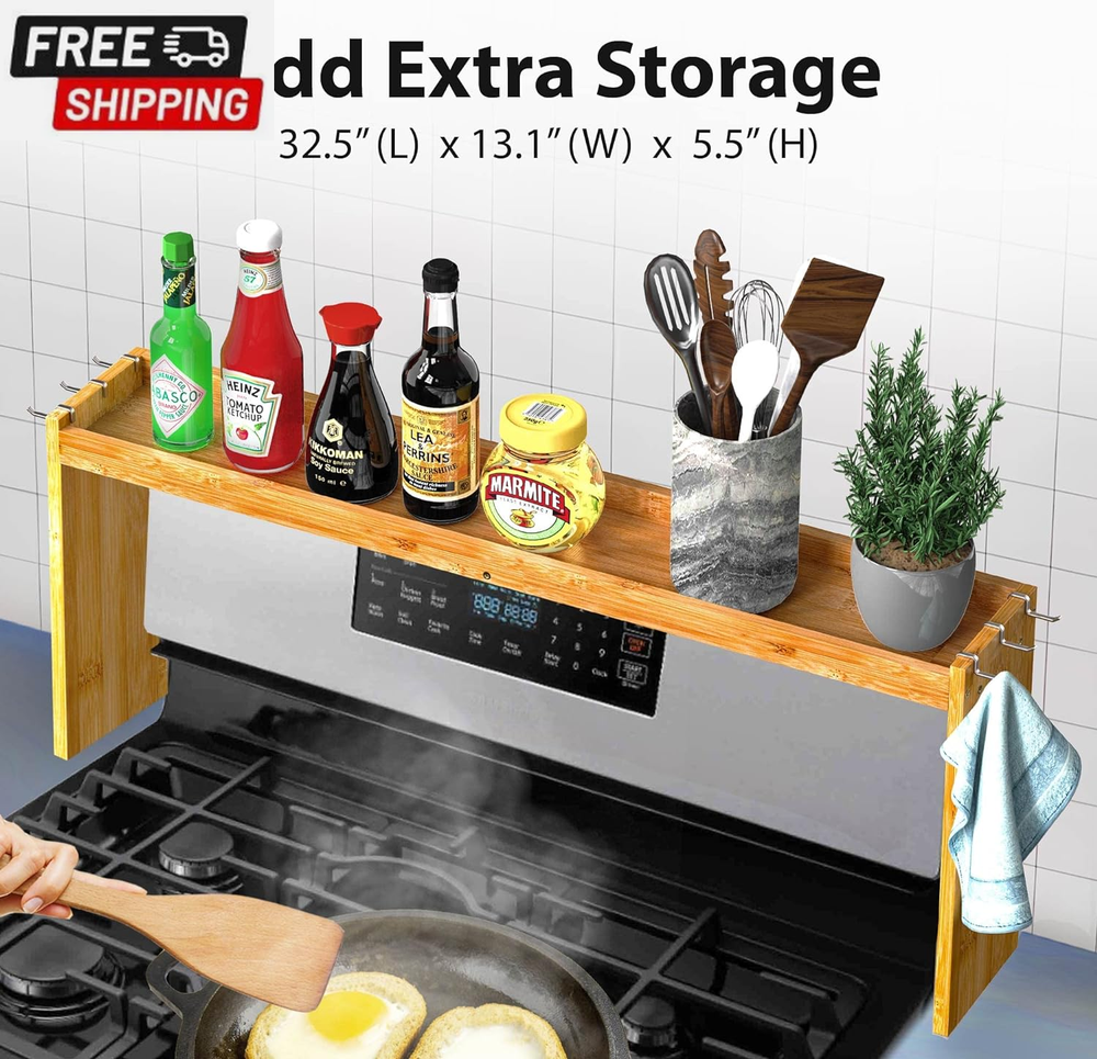 IIIOIIIA Bamboo over the Stove Spice Shelf for Kitchen Storage, 31.5" Kitchen Spice Rack Organizer Stove Top Shelf with 6 Hooks, 11.4" Height Extra Storage Countertop, Easy to Assemble Premium bamboo material adds modern style and extra storage space for spices and kitchen items Prevents items from falling with front, back and side lips made of sturdy stainless steel Creates more usable space with 6 hooks and non-slip pads for maximum kitchen organization Easy to clean bamboo surface simply needs wiping with a neutral detergent Worry-free purchase with refund or replacement available if not completely satisfied Product Description Shipping Fast shipping is very important for us. Our standard US shipping service is FREE. Your order will be shipped within 2-3 business days upon full payment received. Your order will be delivered within 2-3 business days after the handling time. We only ship to the confirmed PayPal address. We reserve the right to cancel any order for any reason at any time. We are not responsible for undeliverable addresses. Returns and payment We offer a 30 days return policy from checkout winning date. We allow only PayPal as payment method FeedBack Your feedback very important to us, after you get your package and you are satisfied with our service please leave us positive feedback If you have any problem with your order / any questions please before leave any type of feedback For any questions, using eBay contact system Please visit our eBay store to check out other items for sale! Thank you for shopping at our store.