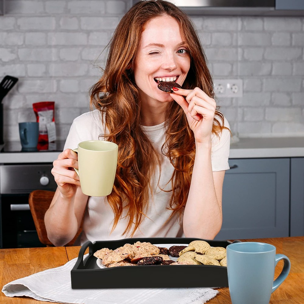Our tray with handles are sturdy and beautiful. You can keep snack tray in your living room, kitchen, bedroom, bathroom. These black serving trays are crafted from bamboo and will help you do the tasks you need. Use ottoman tray to serve snacks fruits breakfast in bed tray at hotels bars or coffee shops. Our cosmetics Decorative tray are also for jewelry, remote, glasses, ornaments, magazines. Two large handles design not only looks beautiful,but also makes Large Wooden Tray more easy to grip and transport; raised edge could prevent food and plates from falling. You can put serving tray with handles on an bed, coffee table and couch. The easy arrangement food trays can put cups, plates, food, vegetables, sugar etc. As a room tray decor which saving a lot of space for your living room and kitchen. Comes with 2 sizes the large serving tray 16.5X12.2X 2 inches and small tray 15.5X11.2X 2 inches. The beautiful kitchen tray serve food and beverages or for decorating living rooms. The versatile and practical uses make bamboo tray a great gift for anyone; You can put black coffee table Tray using restaurants, office, party, wedding, Indoor & Outdoor.