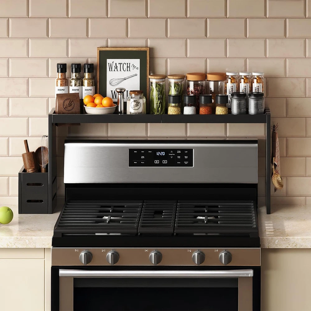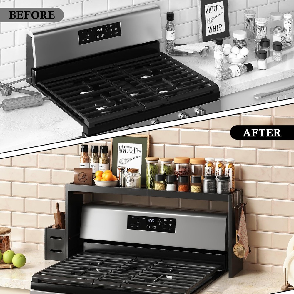 Bamboo Stove Shelf with EVA Kitchen Liner,31in Over The Stove Shelf,Cutlery Holder & 6 Hooks,For Back Of Stove Kitchen Storage stove shelf for back of stove over the stove shelf stove shelf stove top shelf over stove shelf over the stove spice rack oven shelf for top of stove above stove shelf over stove shelf for back of stove over the oven shelf oven shelf stove spice rack shelf magnetic stove top shelf spice shelf stove shelf for back of stove over the stove shelf Best Kitchen Stove Shelf Solutions: Our 31-inch Bamboo Stove sits securely over your stove,instantly adding premium storage space for spices, oils, and kitchen essentials – without stealing counter space! Features a built-in cutlery holder and 6 sturdy hooks for utensils, keeping everything within reach while cooking Secure And Stable Fit Design:This over the stove shelf features premium EVA kitchen anti-slip mats, providing exceptional grip and heat/oil resistance for your countertop surface. The non-slip pads on the bottom enhance stability, ensuring the rack and its contents stay firmly in place. Safety First! Durable Stylish & Easy Clean: Stove shelf crafted from premium moisture-resistant bamboo,this stove shelf for the back of the stove adds modern style to your kitchen. Its smooth bamboo surface paired with EVA Kitchen Liner—just wipe with a damp cloth or mild detergent. Maintenance is a breeze! Easy Installation: Designed specifically for standard stove shelves,Assembly steps come with installation instructions to help you complete setup quickly. Trim the EVA Kitchen Mat to your ideal size to protect countertops, install hooks and the Cutlery Holder on the stove shelf, and start organizing! Ready to use in minutes. Premium Value & Satisfaction: More than just a shelf! Get the complete organization solution with included bamboo shelf, protective EVA liner, dedicated cutlery holder, and 6 hooks. Backed by our worry-free guarantee – if you're not completely satisfied, contact us for a solution