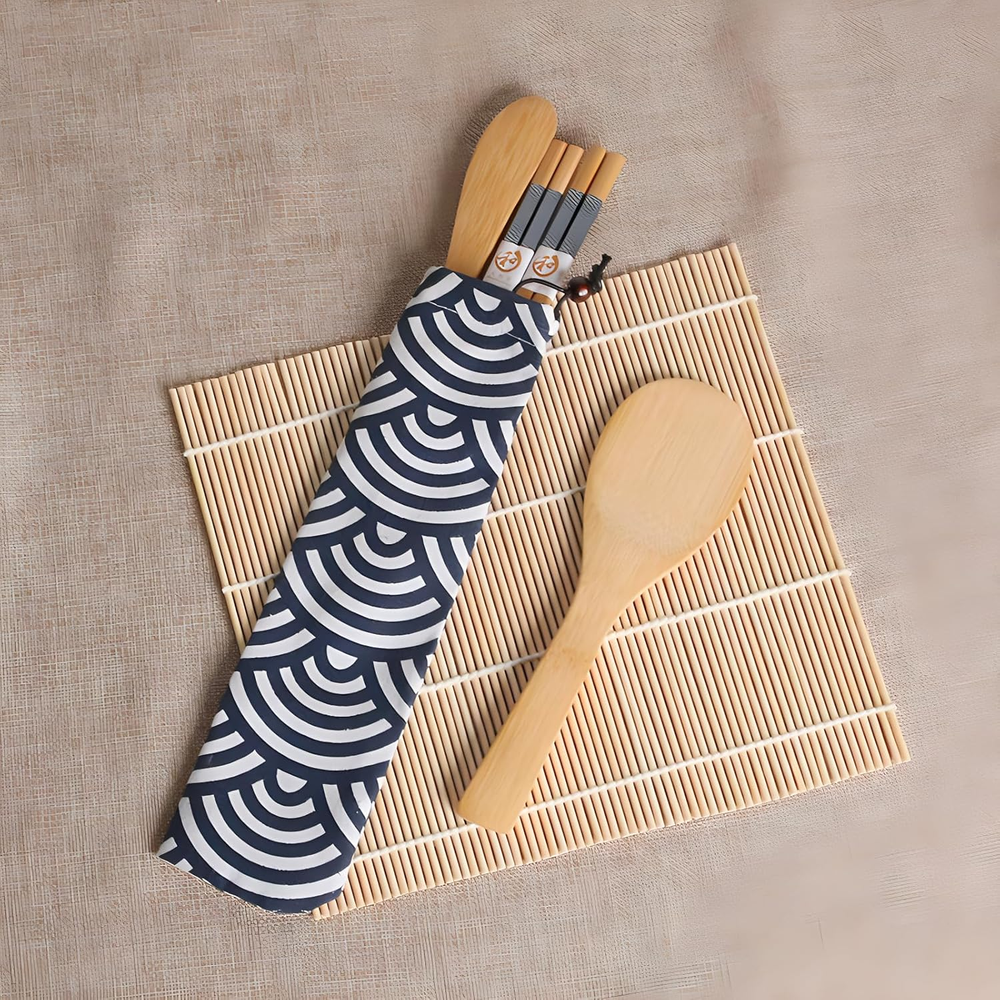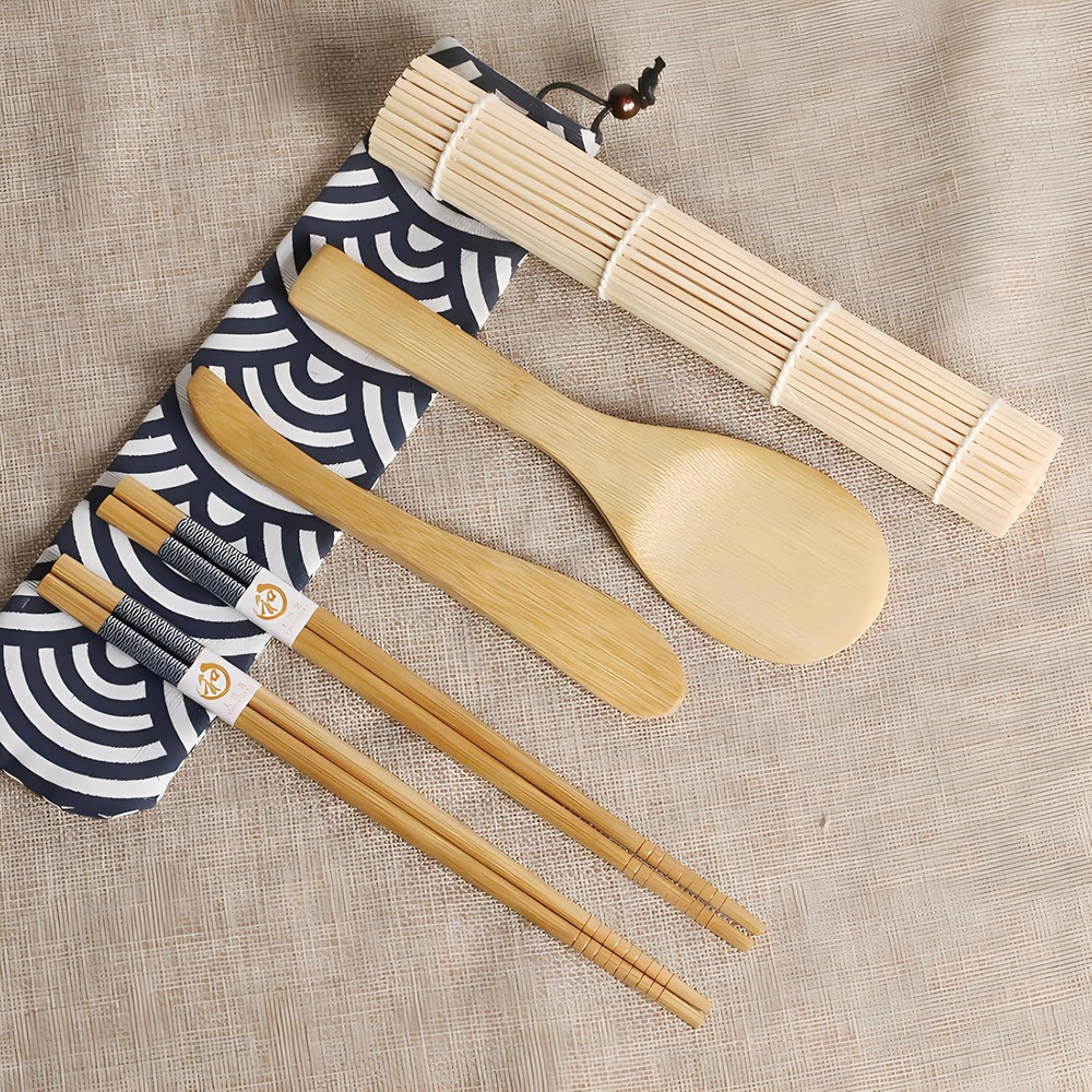 One set includes one mat,one paddle,one spreader,two pairs of chopsticks and one bag Size of the mat:9-1/2-Inch High Quality of all the parts Natural:these are made of natural bamboo.Enjoy the natural life! It is a MUST-HAVE set for sushi fans This set of sushi kit is a nice kit for beginners
