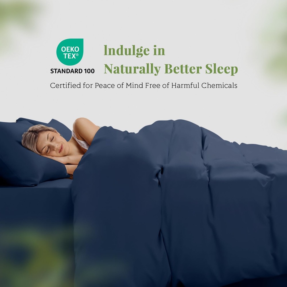 Discover our viscose derived from bamboo Duvet Cover Set, perfect for hot sleepers and all seasons. Moisture-wicking and breathable, it ensures a comfortable night's sleep. Features corner ties and a zipper for easy comforter insertion. Durable and fade-resistant, it's the ideal bedding upgrade. ORGANICALLY GROWN & OEKO-TEX CERTIFIED: Our Duvet Cover Set is crafted from 100% VISCOSE DERIVED FROM BAMBOO, sourced from sustainably managed and organically grown farms. OEKO-TEX STANDARD 100 Certified, it is free from over 100 harmful substances, ensuring safety and health for you and your family. Always pure, never blended, and made with only the finest materials, our duvet cover offers the best quality available. Sleep better, sleep smarter. COOLING & BREATHABLE ALL NIGHT: Discover pure comfort and luxury with our duvet cover set. Our HOT SLEEPERS SHEETS are ideal for anyone who tends to sleep hot, experiences night sweats, or lives in a warm and humid climate. Viscose derived from bamboo is highly breathable, moisture-wicking, and thermoregulating, keeping you cozy and refreshed all year. You deserve the best sleep, and this set delivers! EASY INSTALLATION & SECURE FIT: These duvet covers, equipped with a hidden zipper and 6 loops (4 corners and 2 sides), offer easy installation and a secure fit. The envelope-style pillowcases make replacement a breeze, combining functionality with chic style. Say goodbye to the hassle and enjoy a seamless bedding experience. BUILT TO LAST & EASY CARE: The duvet cover and pillowcases are crafted with high-quality stitching for long-lasting durability. Enjoy easy care with cold water washing, while experiencing a silky touch that grows softer and more luxurious with every wash. 3-PIECE FULL/QUEEN DUVET COVER SET: Includes 1 Zipper Closure Duvet Cover (90"x90") and 2 Pillowcases with Envelope Closure (20"x30"). *Note: Duvet insert not included. Duvet cover is designed to fit a duvet, not a comforter.