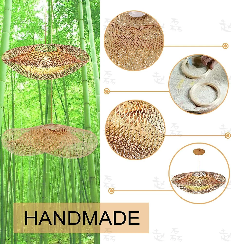 Bamboo Wicker Rattan Shade Pendant Light Fixture Art Asian Hanging Ceiling Lamp Bamboo Weave Ceiling Pendant Light Unique Hand-woven Chandelier Hanging Lamp Product Description: ★ Natural bamboo silk is purely hand-woven. After mildew-proof, moth-proof and insect-proof treatment, it is soaked in water-soluble varnish, which is fashionable and environmentally friendly. ★ Hollow woven lampshade, unique design, uniform light transmission, warm and soft light, and better atmosphere decoration. ★ E27 screw cap, high temperature resistant cap, this is easy to install and use. ★ Thickened baking paint ceiling plate, spin-polished, high-temperature environmental protection paint treatment, durable and rust-proof. ★ Suitable for different styles, recommended occasions: living room, bedroom, dining room, leisure venue, etc. Features: Material: Bamboo Light source: E27 bulb (NOT included) Lighting area: 10-15 square meters Voltage: 85-260v Whether to include bulbs:NO Hanging wire length: 100cm Application: dining room / bra / bedroom / living room / club The package includes: 1x bamboo chandeliers (NOT including bulbs) Payment Delivery details Terms of sales About us Contact us Payment We accept ebay payment 。 Fees such as import duties, taxes are not included in the item price or shipping costs. These charges are the buyer's responsibility. Delivery details Shipping: 2-9 working days to: USA Terms of sales We maintain high standards of excellence and strive for hundred percent customer satisfaction. Feedback is very important to us. We hope that you contact us immediately before you give neutral or negative feedback, so that we can address your concerns. It is impossible to address issues if we do not know about them! About us Your satis faction is our ultimate goal. We work hard to earn your trust and future business. Our certified technicians have tested each item before shipping. The unit comes with 1 year limited warranty on all manufacturing defects. a) If you receive a defective item, you may return it or ask for a discount. Please contact us within 14 days after you receive the package. b) What you returned must be intact and in its original packaging as re? u. Customer is responsible for shipping costs of the returned item. c) We will cover the cost of shipping back t with the shipping rate indicated in the registration page. We will send you a new unit or refund the full payment you paid. Thank you. Contact us Business Hour Business Hour: Monday To Friday: 8:30 AM to 5:00 PM (Beijing China time) Due to time zones, our reply to your questions may not be immediately. But within above working time, we will reply your email within 24 hours. If it's non-workdays, please kindly be patient and wait till Monday. Please contact us with ebay message. Please feel free to contact us if you have any questions. Monday To Friday: 8:30 AM to 5:00 PM (Beijing China time) Due to time zones, our reply to your questions may not be immediately. But within above working time, we will reply your email within 24 hours. If it's non-workdays, please kindly be patient and wait till Monday. Please contact us with ebay message. Please feel free to contact us if you have any questions. * Feature * Creative Design,Durable Material,Beautiful Appearance Features Long Service Life,Exquisite Appearance,High-quality Shipping Notice Can not ship to Puerto Rico,Alaska/Hawaii Type Pendant Brand Unbranded Voltage 85-260v Material Bamboo, Wood Category Multi Light Pendant Uses indoor lighting Item Height 100mm Item Width 60cm/23.62" Bulb base E27 Whether to include bulbs do not include bulbs Style Modern Power Source Hardwired Room Bar, Hallway, Kitchen, Cafe, Restaurant Color Gold Diameter 60cm (23.622inch) Manufacturer Warranty 2 Years On Jan 5, 2025 at 22:54:37 PST, seller added the following information: