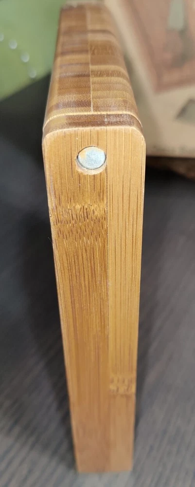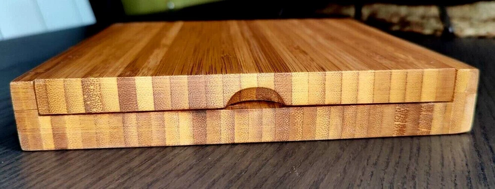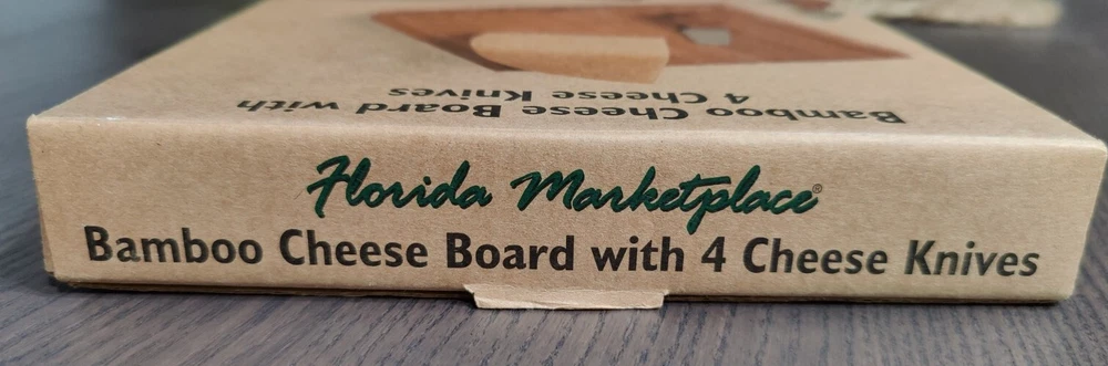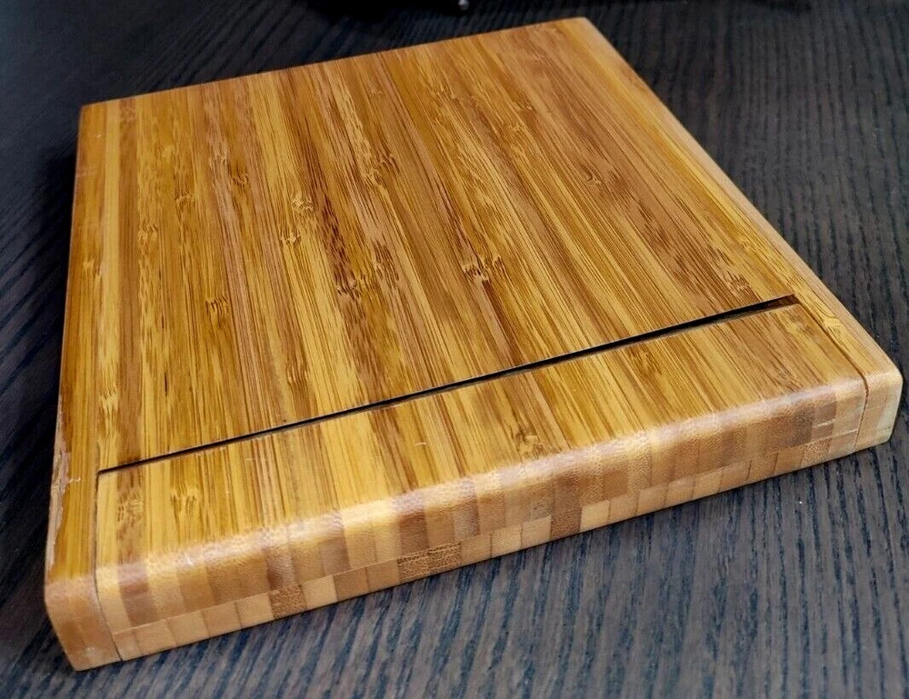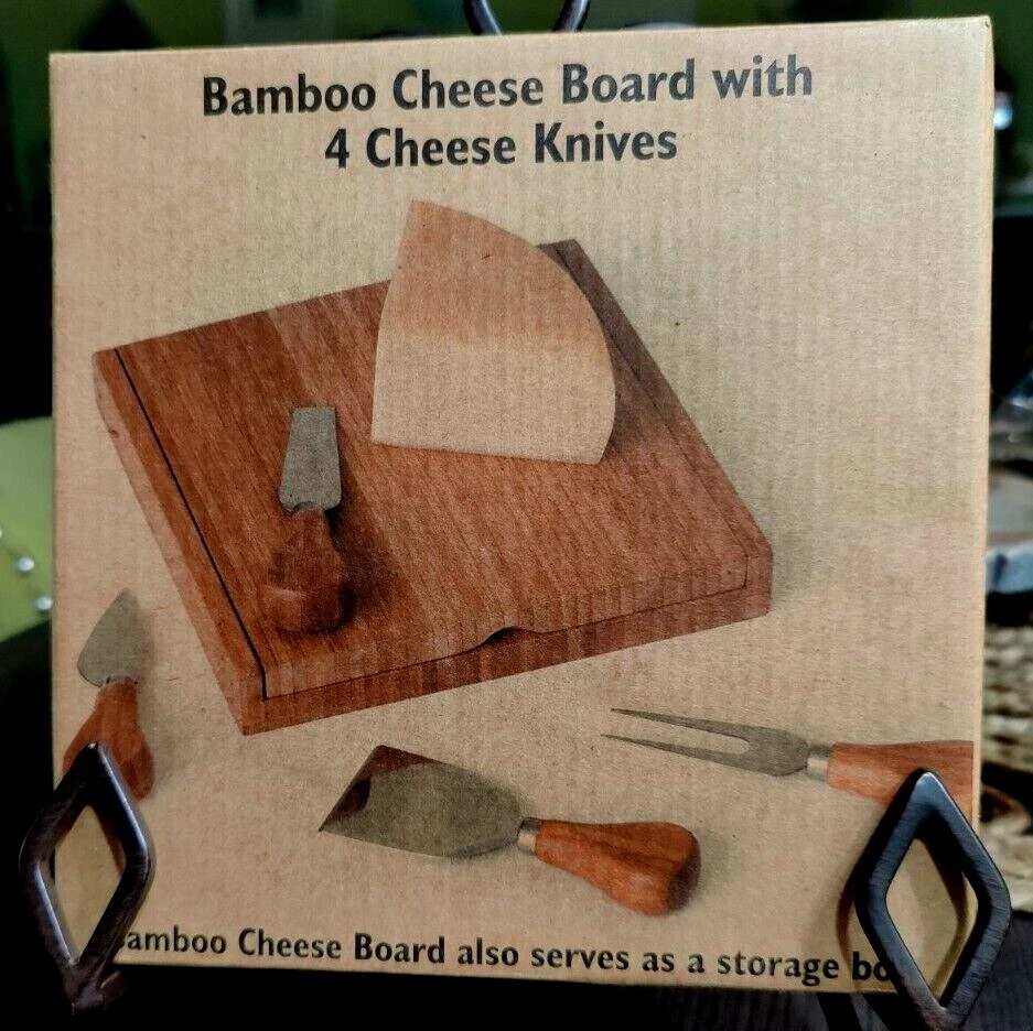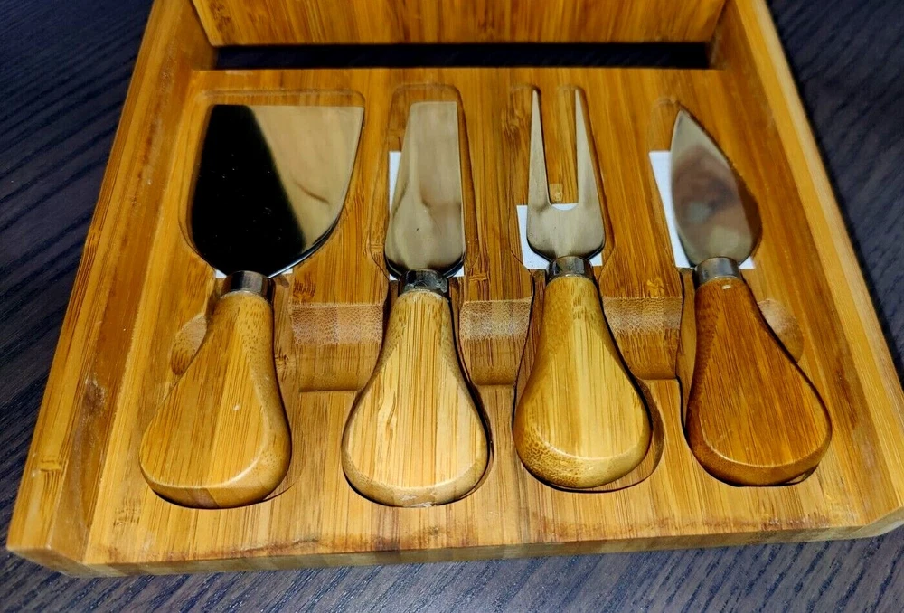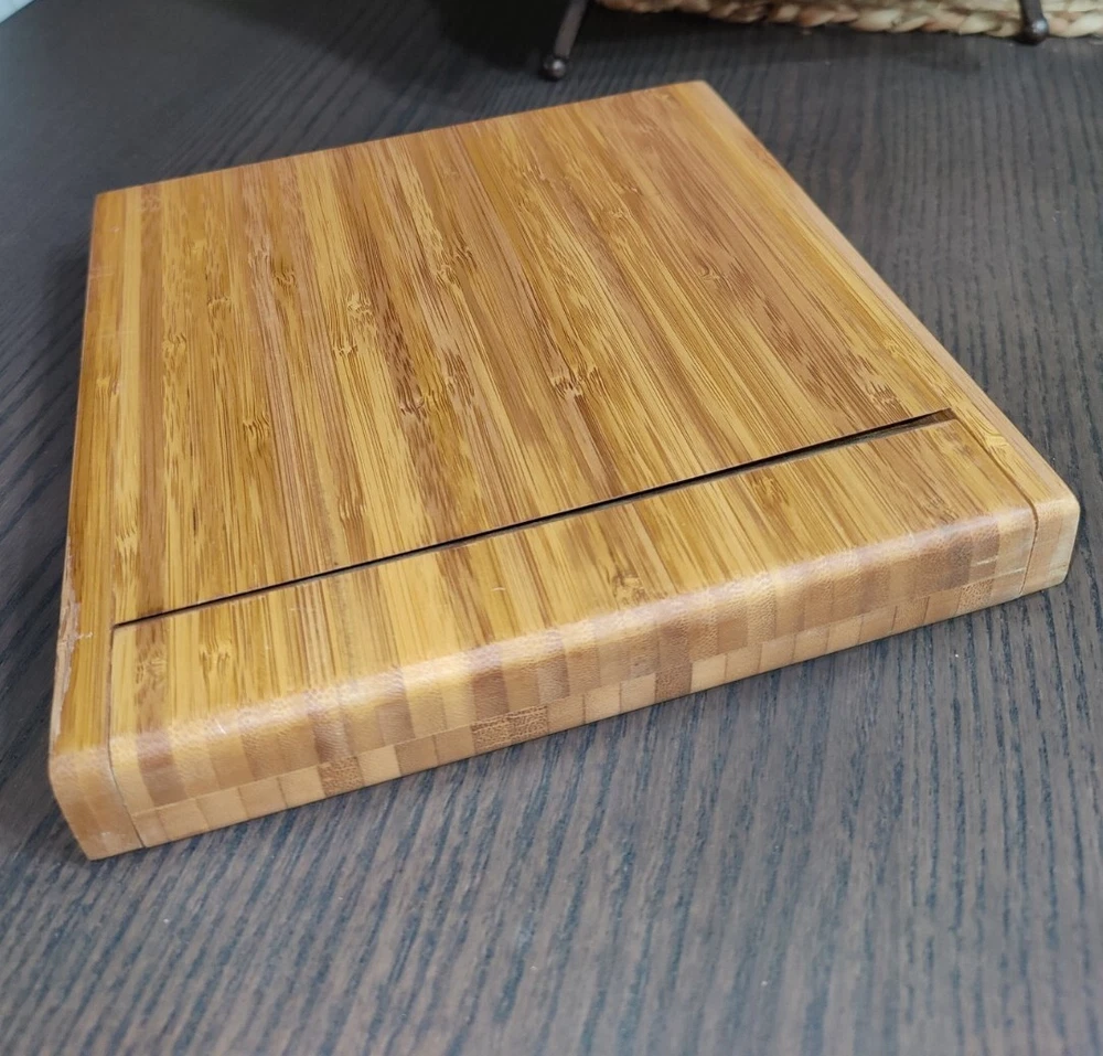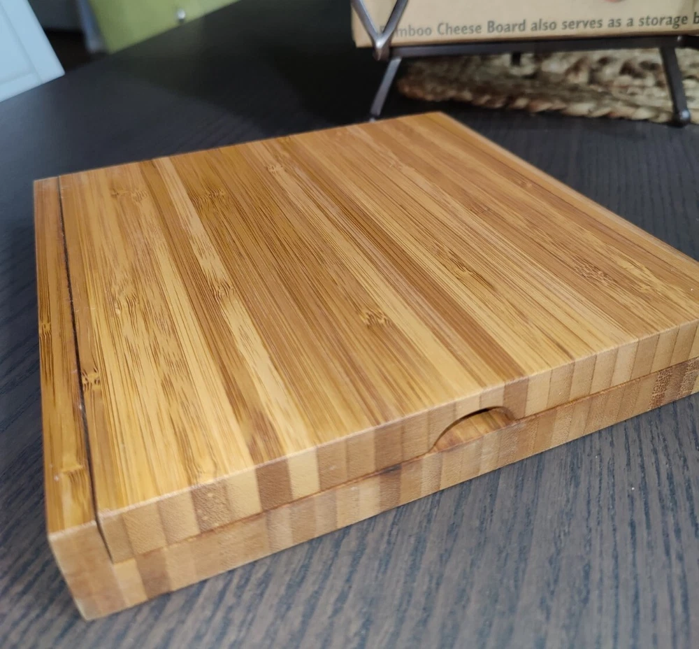Bamboo Cheese Board with Cheese Knives (3) Cheese Fork (1) Magnetic Storage inside. 7.50" x 7.50" 1.875" high. Used with the original box. Usage wear and scuffing on Wood board and handles. See photos.