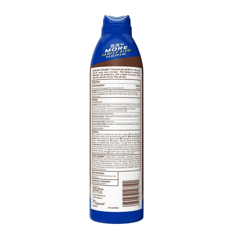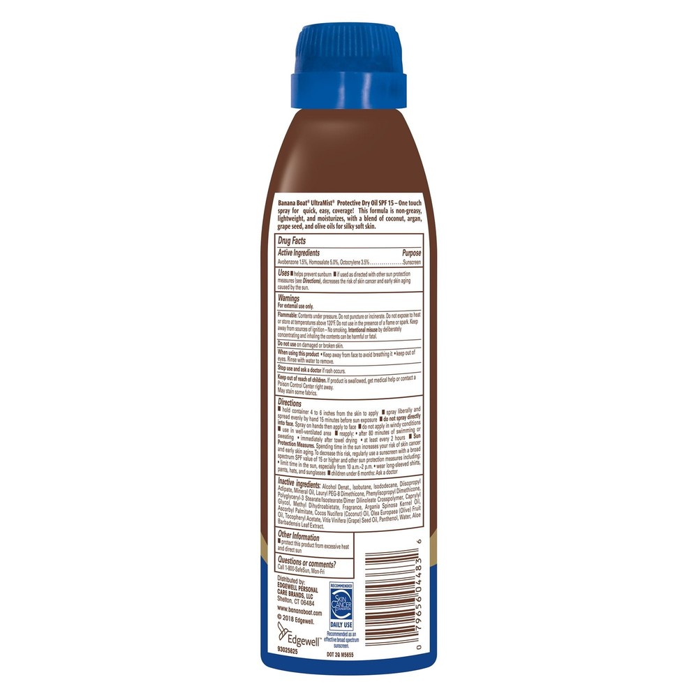 Banana Boat Protective Tanning Dry Oil SPF 15 Clear Spray Sunscreen 6oz (3 Pack) Enjoy a sun-kissed glow with Banana Boat Deep Tanning Dry Oil Clear Spray Sunscreen with SPF 15. This lightweight, non-greasy dry oil tanning spray formula is made with natural argan oil and will leave your skin feeling silky-smooth. Banana Boat tanning oil with SPF is water-resistant for up to 80 minutes and features a cap-free twist 'n lock design and UltraMist technology for quick and easy coverage. About this item FREE FROM–Tanning oil spray made without oxybenzone and octinoxate WATER RESISTANT for up to 80 MINUTES NON-GREASY and LIGHTWEIGHT FEEL IMPROVED FORMULA–Dry sunscreen spray made with ARGAN OIL Banana Boat dry oil SPF 15 sunscreen features a cap-free twist 'n lock design WATER RESISTANT for up to 80 MINUTES NON-GREASY and LIGHTWEIGHT FEEL Improved formula now with ARGAN OIL Broad Spectrum UVA & UVB Protection Ingredients Avobenzone 1.5%, Homosalate 5.0%, Octocrylene 3.5%,Alcohol Denat., Isobutane, Isododecane, Diisopropyl Adipate, Mineral Oil, Lauryl PEG-8 Dimethicone, Phenylisopropyl Dimethicone, Polyglyceryl-3 Stearate/Isostearate/Dimer Dilinoleate Crosspolymer, Caprylyl Glycol, Methyl Dihydroabietate, Fragrance, Argania Spinosa Kernel Oil, Ascorbyl Palmitate, Cocos Nucifera (Coconut) Oil, Olea Europaea (Olive) Fruit Oil, Tocopheryl Acetate, Vitis Vinifera (Grape) Seed Oil, Panthenol, Water, Aloe Barbadensis Leaf Extract