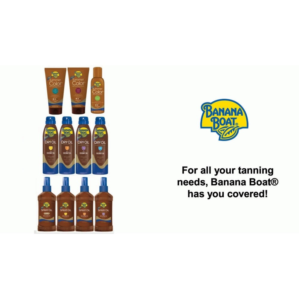 Banana Boat Tanning Dry Oil Clear Spray Sunscreen SPF8, Oxybenzone Free, 6 Ounce (Pack Of 4) Enjoy a sun-kissed glow with Banana Boat Deep Tanning Dry Oil Clear Spray Sunscreen with SPF 8. This lightweight, non-greasy dry oil tanning spray formula is made with natural argan oil and will leave your skin feeling silky-smooth. Banana Boat tanning oil with SPF is water-resistant for up to 80 minutes and features a cap-free twist 'n lock design and Ultra Mist technology for quick and easy coverage. About this item WATER RESISTANT for up to 80 MINUTES NON-GREASY and LIGHTWEIGHT FEEL Improved formula now with ARGAN OIL Broad Spectrum UVA & UVB Protection Banana Boat Tanning Spray and Dry oils provide sun protection in a variety of SPFs that will leave your skin feeling silky smooth FREE FROM–Tanning oil spray made without oxybenzone and octinoxate WATER RESISTANT for up to 80 MINUTES NON-GREASY and LIGHTWEIGHT FEEL IMPROVED FORMULA–Dry sunscreen spray made with ARGAN OIL SPF 8 Banana Boat dry oil sunscreen features a cap-free twist 'n lock design Ingredients Active Ingredients:Avobenzone 1.0%, Homosalate 3.0%, Octocrylene 2.0%Inactive Ingredients:Alcohol Denat., Isobutane, Isododecane, Diisopropyl Adipate, Mineral Oil, Lauryl PEG-8 Dimethicone, Phenylisopropyl Dimethicone, Polyglyceryl-3 Stearate/Isostearate/Dimer Dilinoleate Crosspolymer, Methyl Dihydroabietate, Caprylyl Glycol, Fragrance, Argania Spinosa Kernel Oil, Ascorbyl Palmitate, Cocos Nucifera (Coconut) Oil, Olea Europea (Olive) Fruit Oil, Tocopheryl Acetate, Vitis Vinifera (Grape) Seed Oil, Panthenol, Water, Aloe Barbadensis Leaf Extract