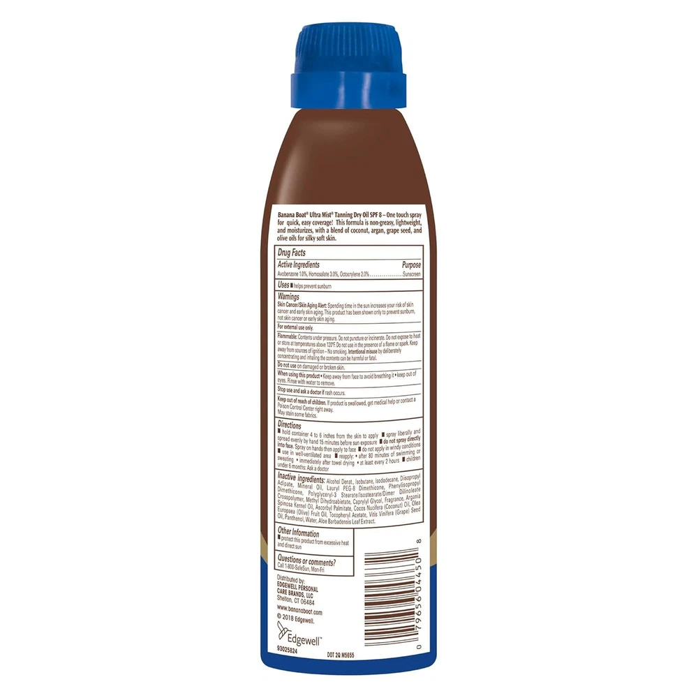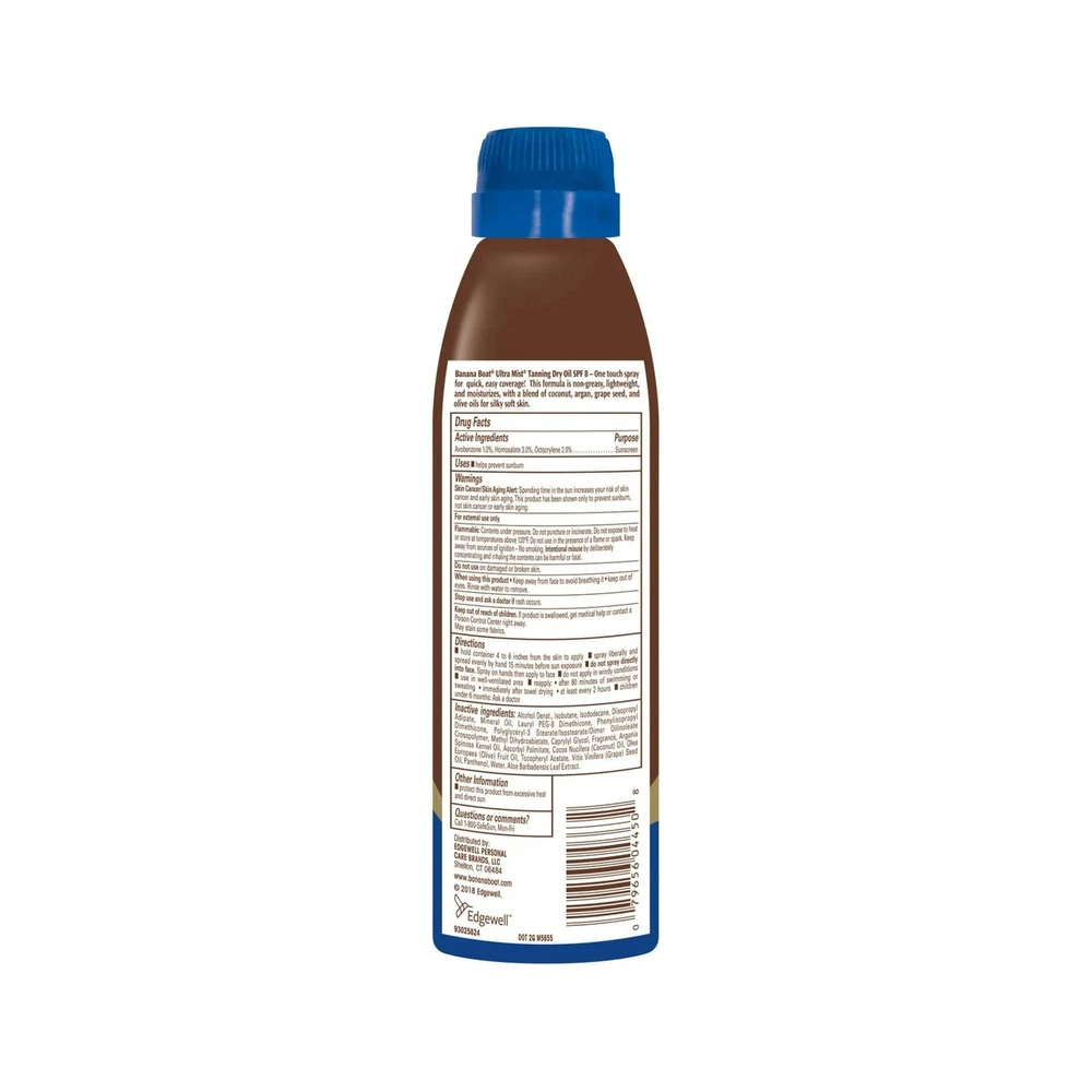 Banana Boat Tanning Dry Oil Clear Spray Sunscreen SPF8, Oxybenzone Free, 6 Ounce (Pack Of 5) Enjoy a sun-kissed glow with Banana Boat Deep Tanning Dry Oil Clear Spray Sunscreen with SPF 8. This lightweight, non-greasy dry oil tanning spray formula is made with natural argan oil and will leave your skin feeling silky-smooth. Banana Boat tanning oil with SPF is water-resistant for up to 80 minutes and features a cap-free twist 'n lock design and Ultra Mist technology for quick and easy coverage. About this item WATER RESISTANT for up to 80 MINUTES NON-GREASY and LIGHTWEIGHT FEEL Improved formula now with ARGAN OIL Broad Spectrum UVA & UVB Protection Banana Boat Tanning Spray and Dry oils provide sun protection in a variety of SPFs that will leave your skin feeling silky smooth FREE FROM–Tanning oil spray made without oxybenzone and octinoxate WATER RESISTANT for up to 80 MINUTES NON-GREASY and LIGHTWEIGHT FEEL IMPROVED FORMULA–Dry sunscreen spray made with ARGAN OIL SPF 8 Banana Boat dry oil sunscreen features a cap-free twist 'n lock design Ingredients Active Ingredients:Avobenzone 1.0%, Homosalate 3.0%, Octocrylene 2.0%Inactive Ingredients:Alcohol Denat., Isobutane, Isododecane, Diisopropyl Adipate, Mineral Oil, Lauryl PEG-8 Dimethicone, Phenylisopropyl Dimethicone, Polyglyceryl-3 Stearate/Isostearate/Dimer Dilinoleate Crosspolymer, Methyl Dihydroabietate, Caprylyl Glycol, Fragrance, Argania Spinosa Kernel Oil, Ascorbyl Palmitate, Cocos Nucifera (Coconut) Oil, Olea Europea (Olive) Fruit Oil, Tocopheryl Acetate, Vitis Vinifera (Grape) Seed Oil, Panthenol, Water, Aloe Barbadensis Leaf Extract