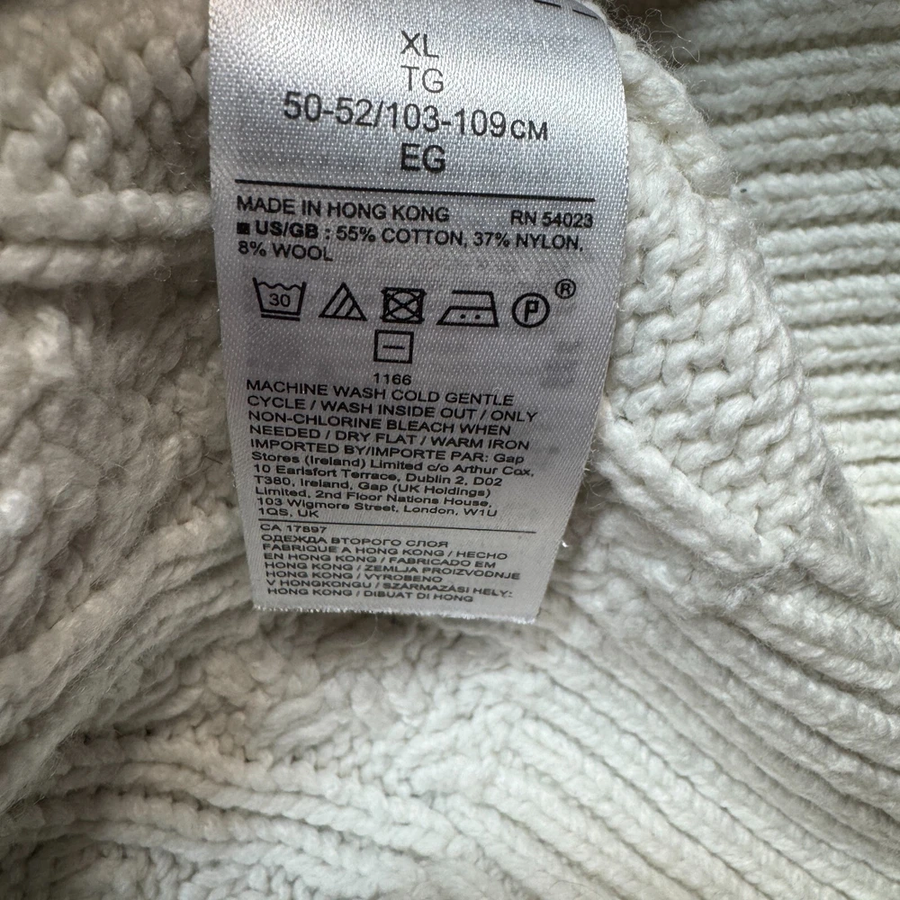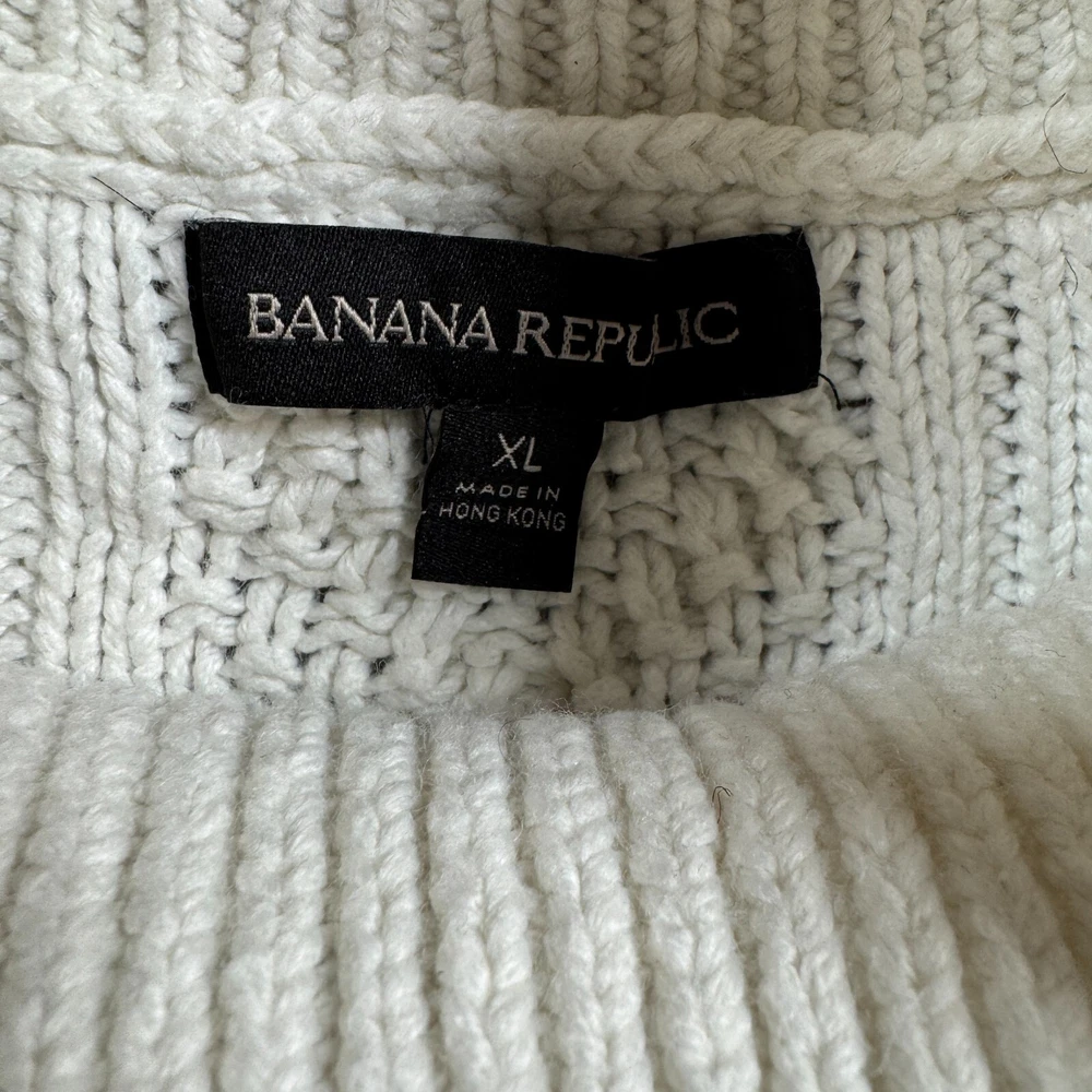 This is a Banana Republic women's sweater in size XL. It is a cream-colored cable-knit pullover made of a wool blend with nylon and cotton. The sweater has long sleeves, a crew neck, and is suitable for travel or casual occasions. It is machine washable and crafted in China.