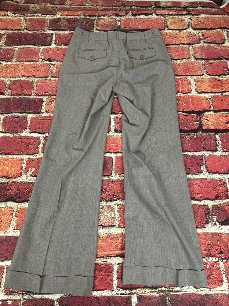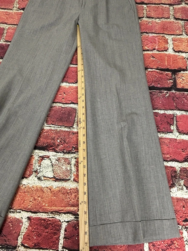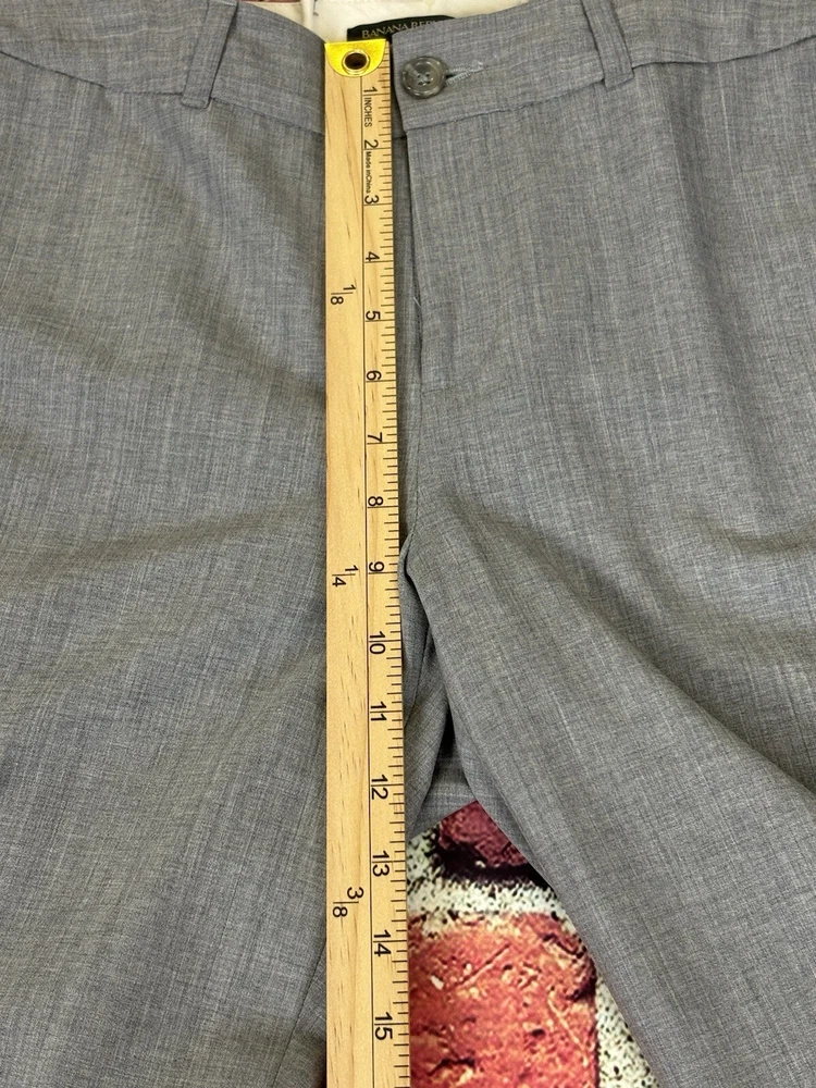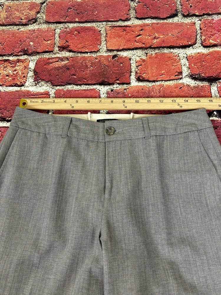These Banana Republic dress pants are made of wool in a modern fit style with a straight leg. They feature a checkered pattern in black, a flat front design, and a waist size of 30 inches. The pants have a zip and button closure, slash pockets, are lined, and have a 31-inch inseam. Suitable for casual, formal, or business occasions, they provide a preppy and city-themed look.