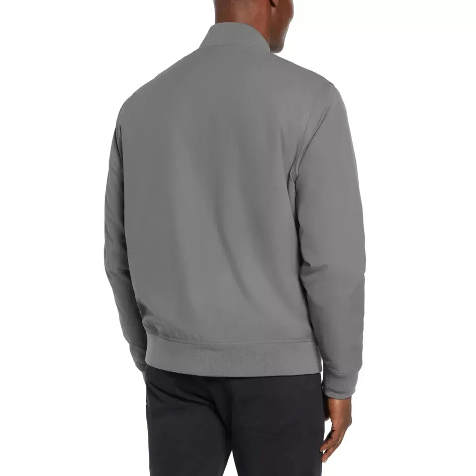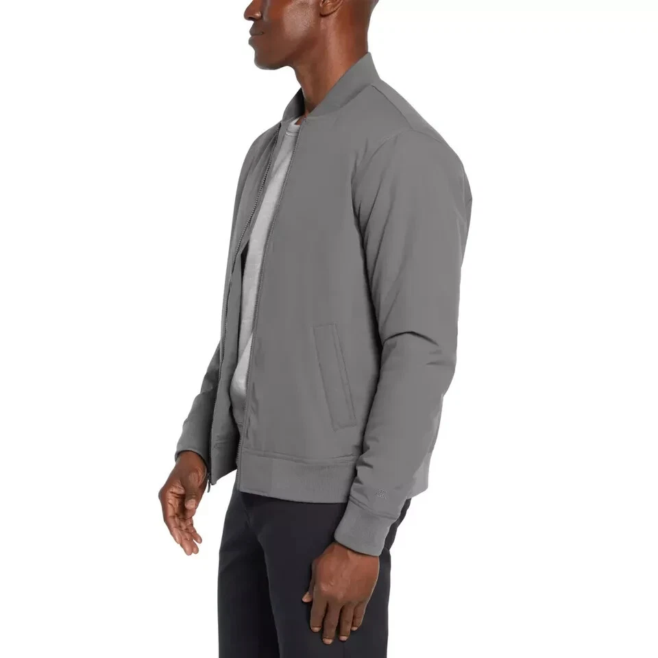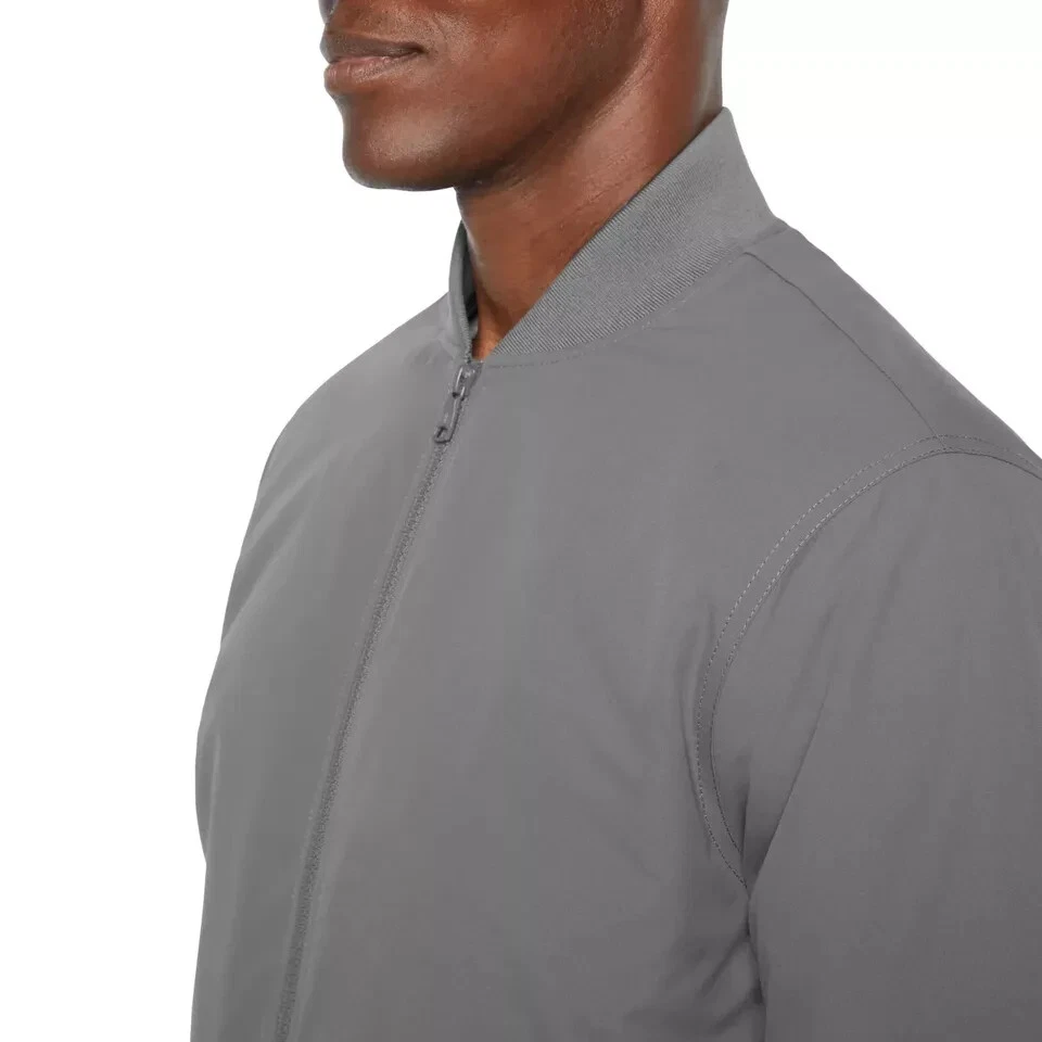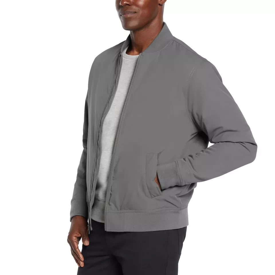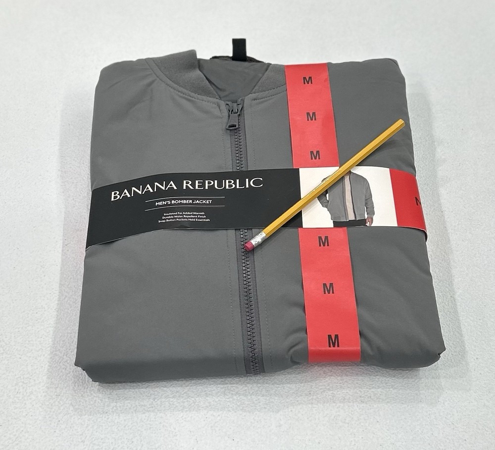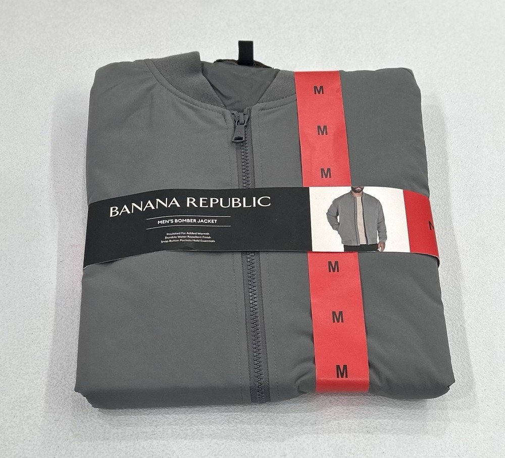 Banana Republic Men’s Bomber Jacket Stained (See the Pictures Please) Size: Medium Color: Gray Contents: Shell: 100% Polyester Lining: 100% Polyester Filing: 100% Polyester