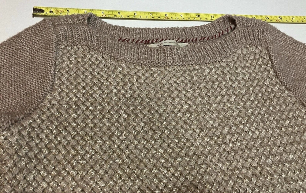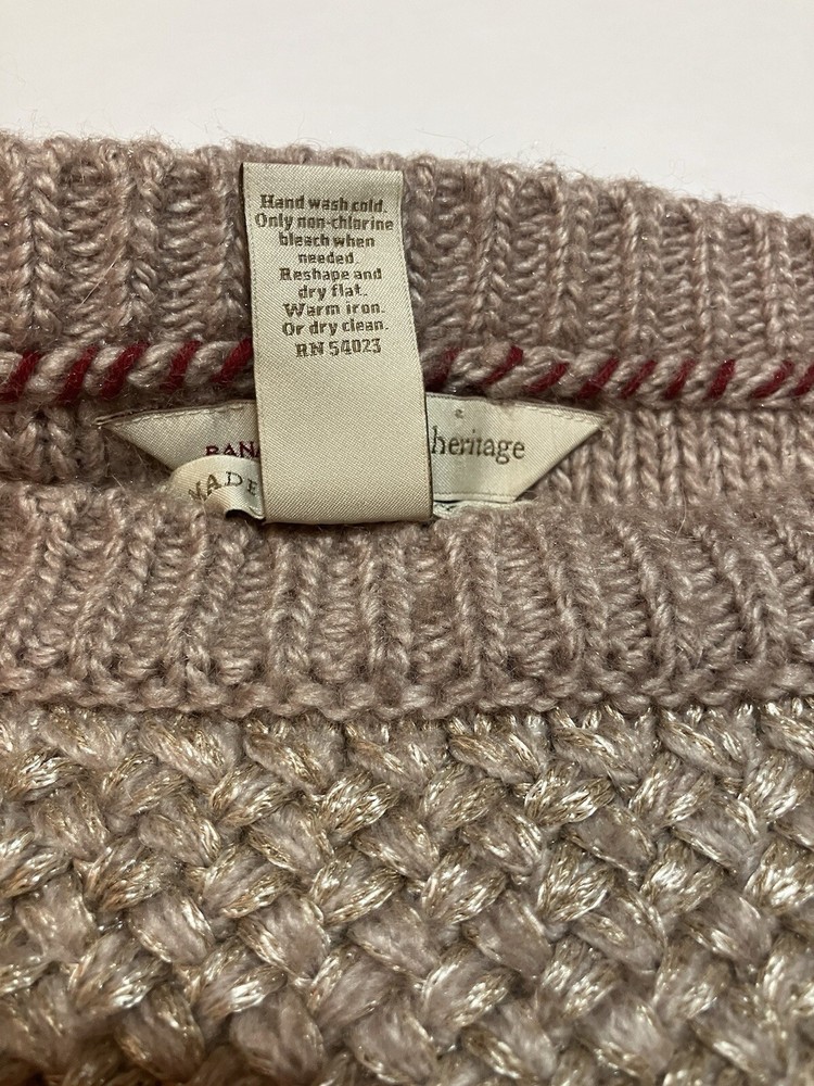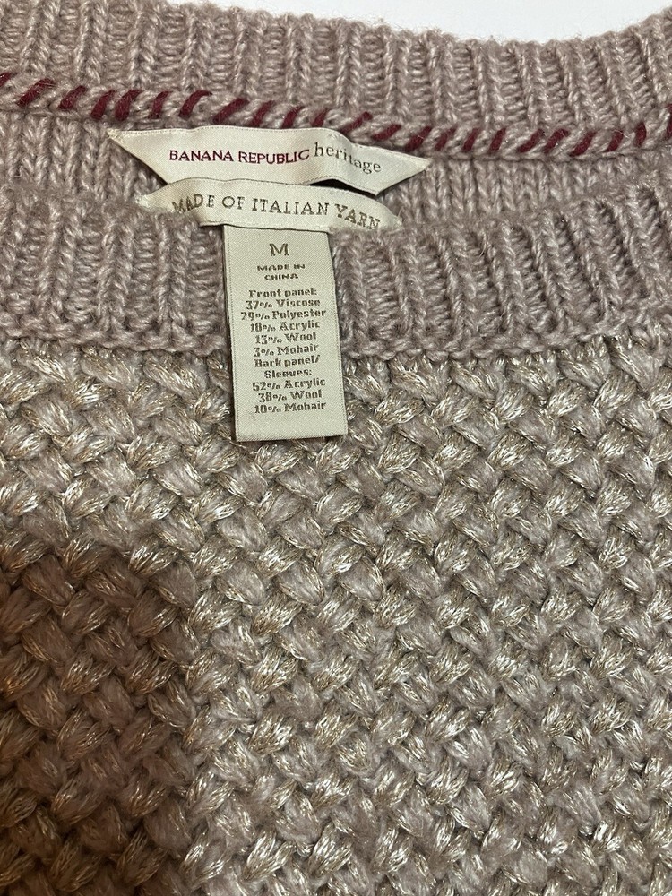 Banana Republic Heritage Italian Yarn knit/woven light camel heather sweater M Hand wash cold Only non chlorine bleach when needed Reshape and dry flat Warm iron or dry clean Front panel 37% viscose / 29% polyester / 18% acrylic / 13% wool / 3% mohair Back panel 52% acrylic / 38% wool / 10% mohair lightly used but wholly loved!-- Please see photos for measurements and condition details. Feel free to ask any questions or for more pictures if needed! be sure to check out my other clothing listings for similar styles and sizes! pre owned items may show normal signs of use-- if see any stains, rips, etc., I will do my best to provide photos. do not hesitate to ask for more information if needed and feel free to combine orders to save on shipping! *listing qualifies for BUY 2, GET 1 FREE! Applicable to all listings in the BUY 2, GET 1 FREE store category! Excluding active sale events, seller offers and/or coupons, prices in the category are firm.